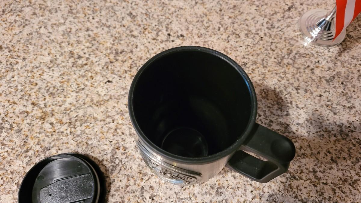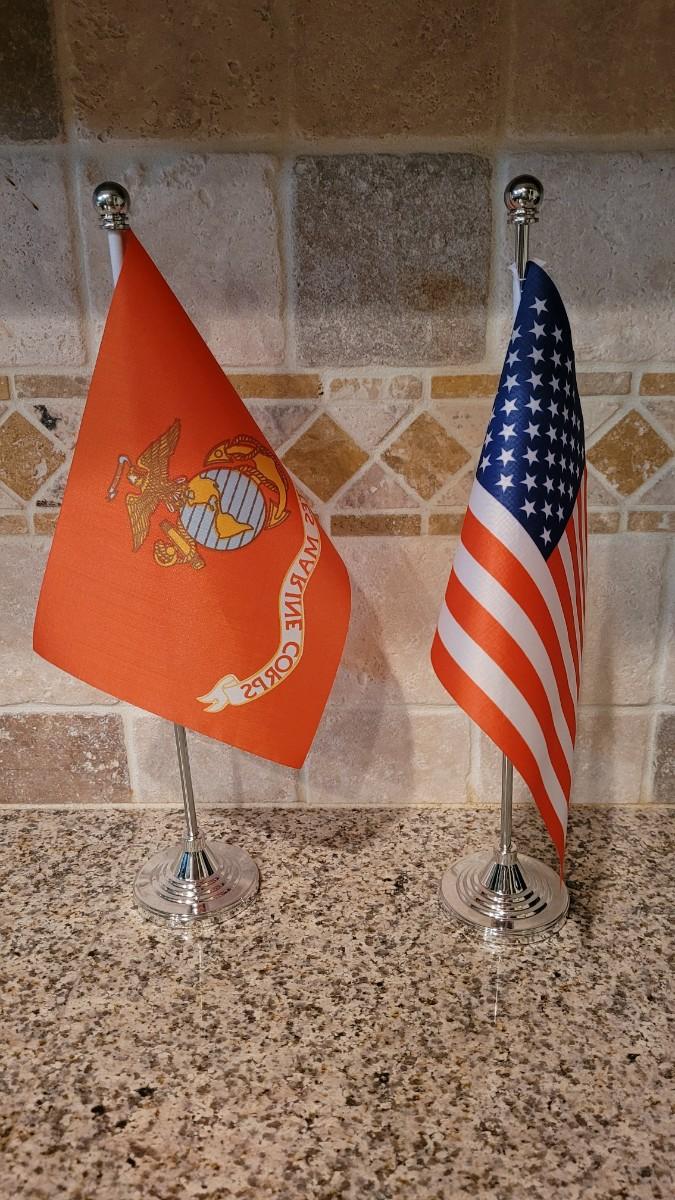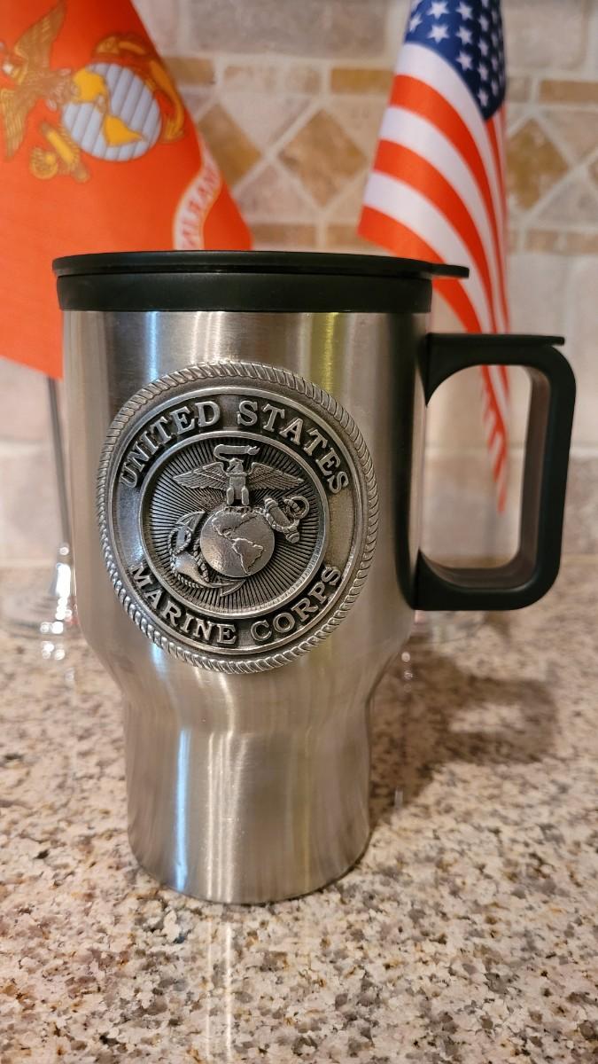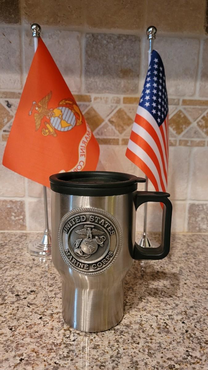 Lot 112: U.S. Marines Stainless Coffee Cup and Mini U.S. Marine Flag & U.S. Flag with Stands