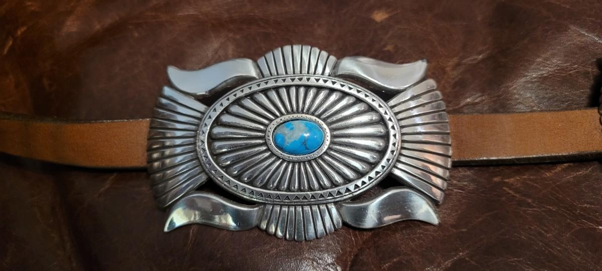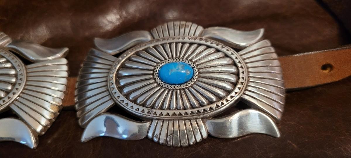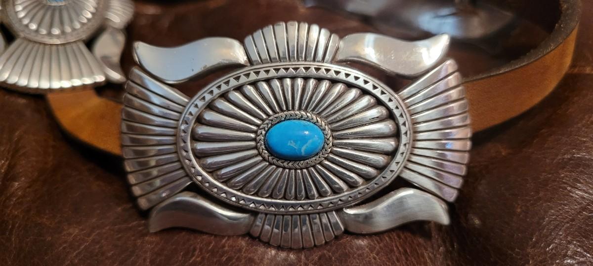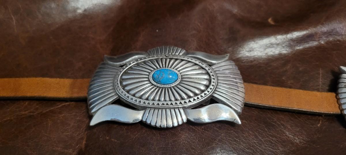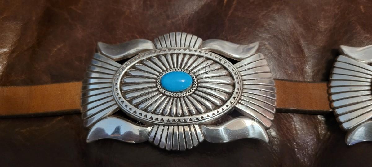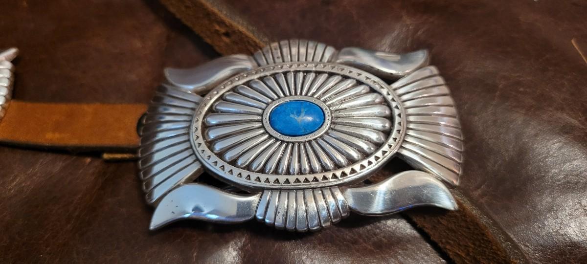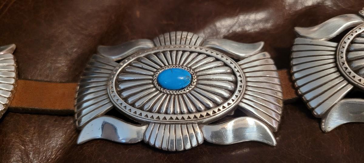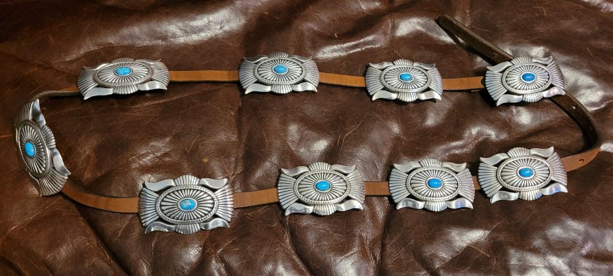 Lot 112: Vintage Handmade Sterling Silver Native American Concho Set (9 total) w/ Turqoiuse Stones and leather belt