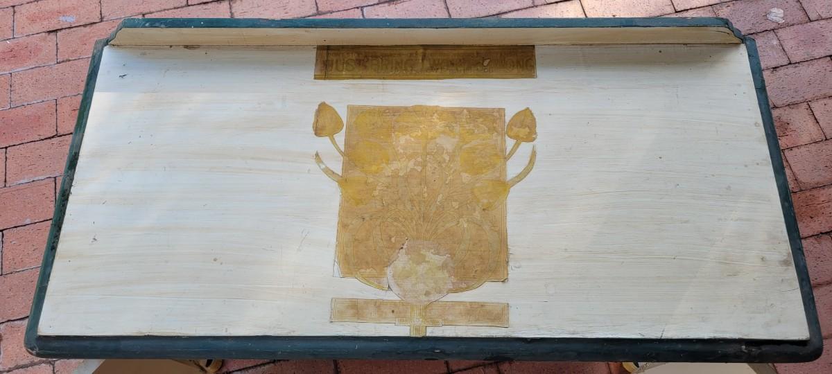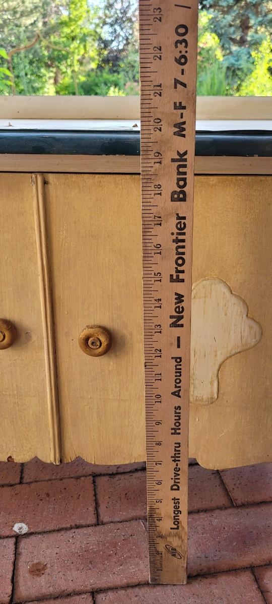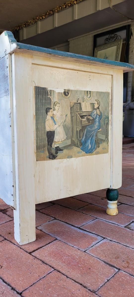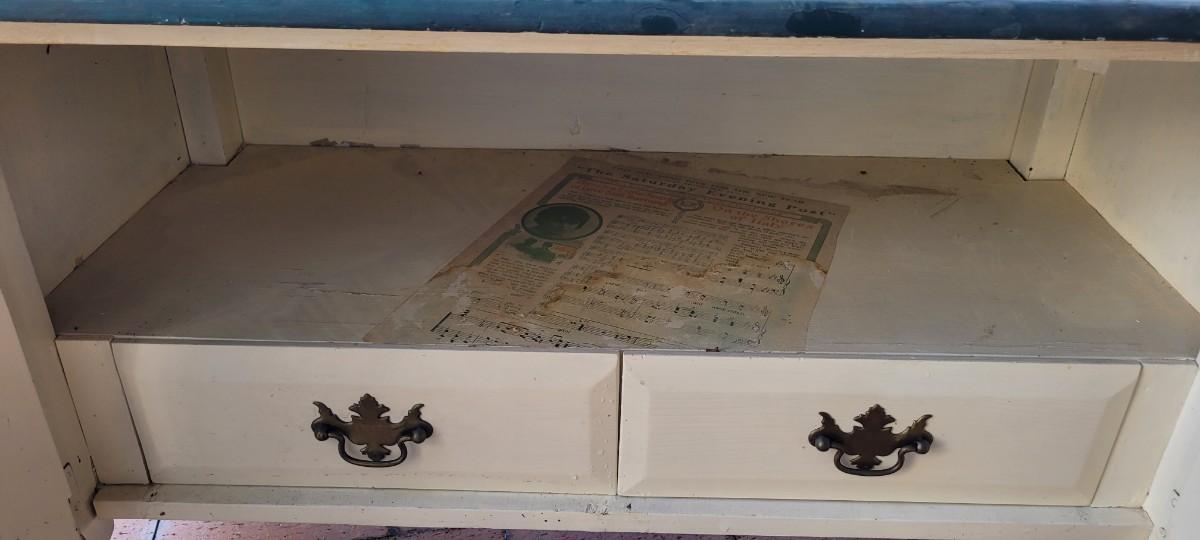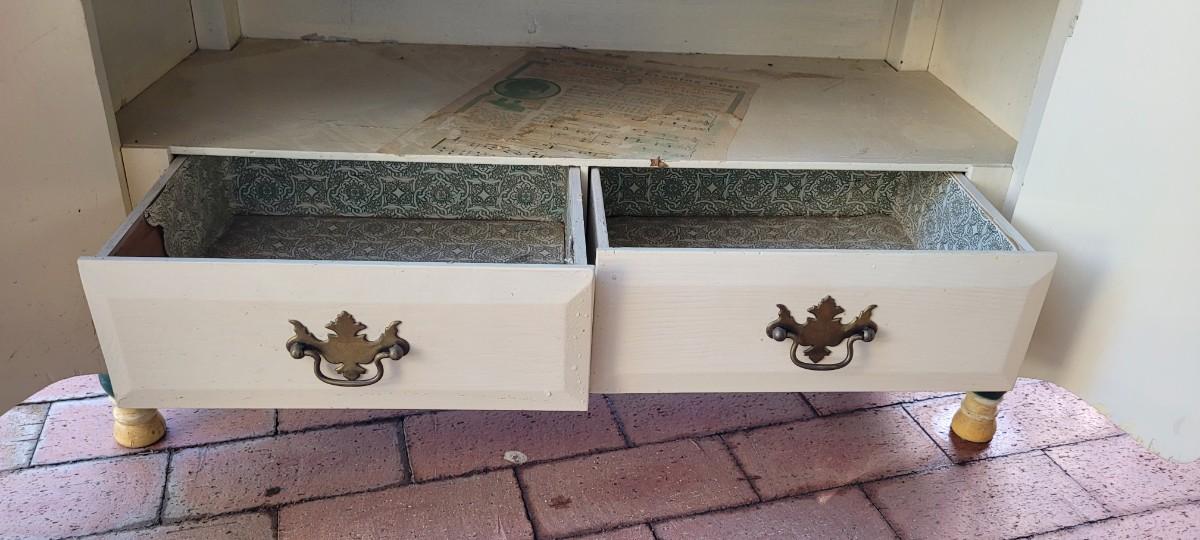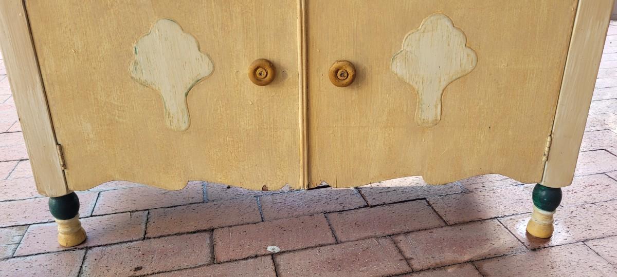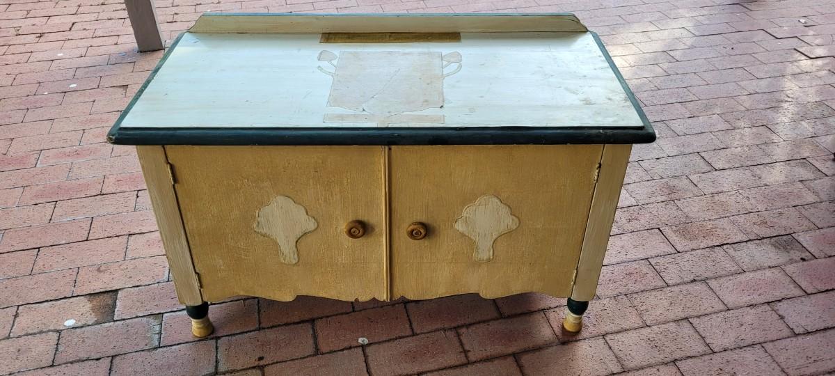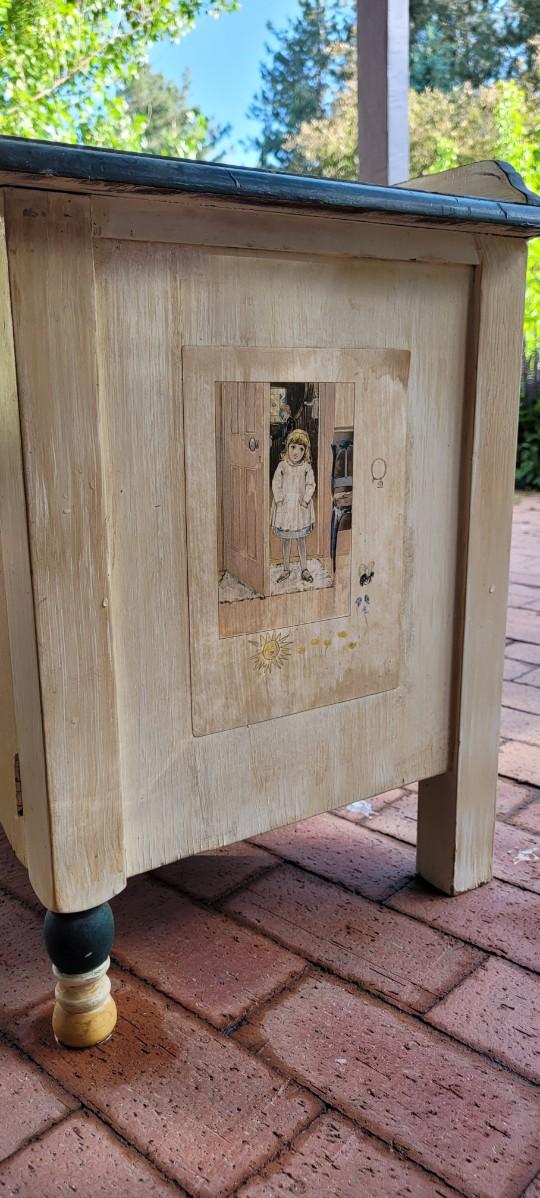 Fun Vintage Buffet Table with Storage features inside. Previous owner has decorated with paper Accents in areas on outer edges and topside.