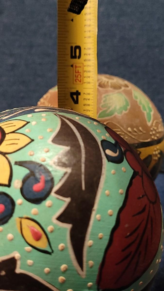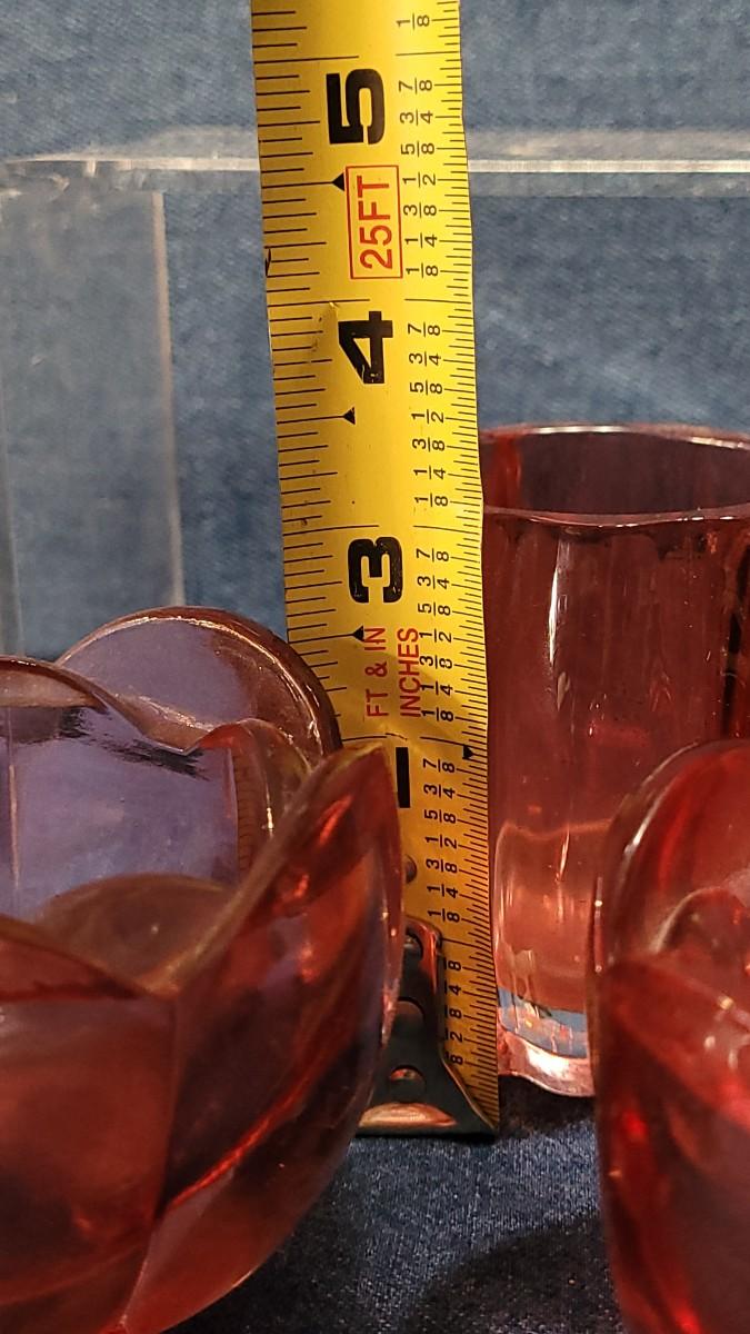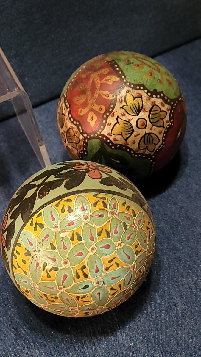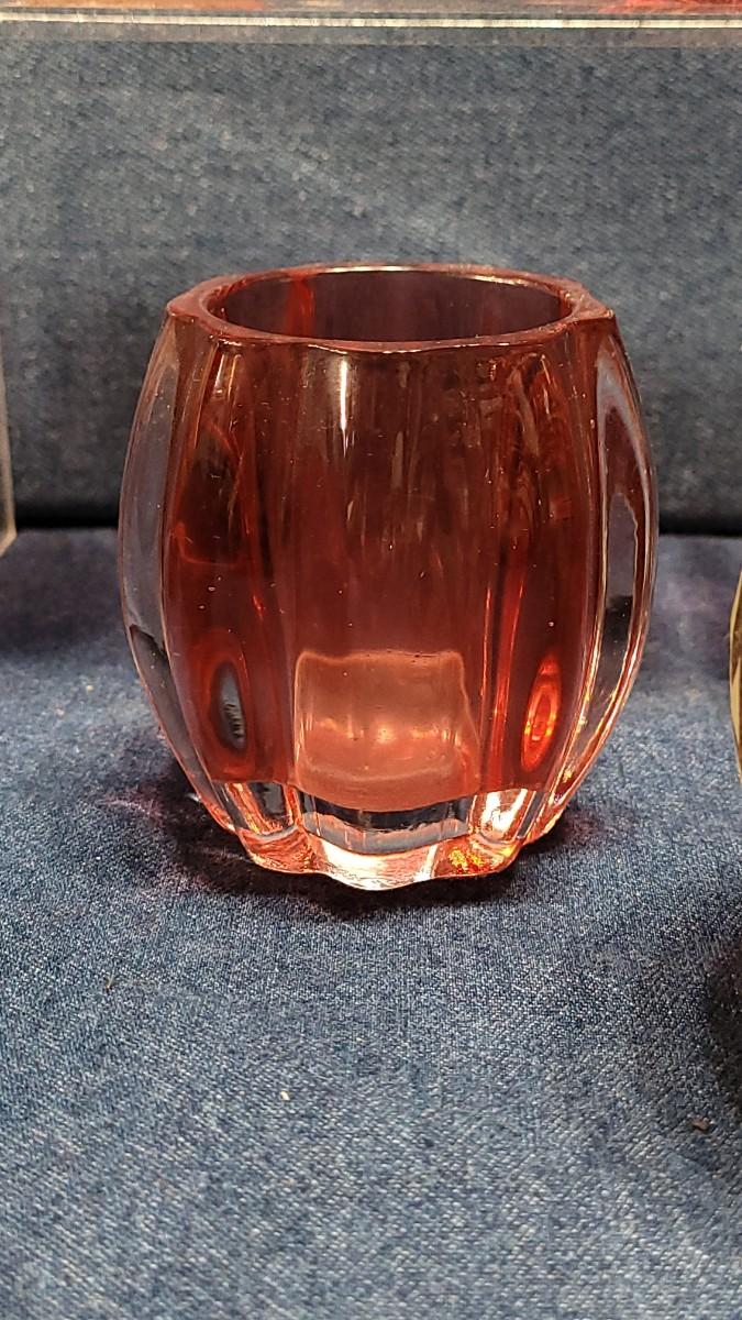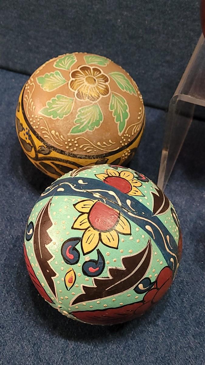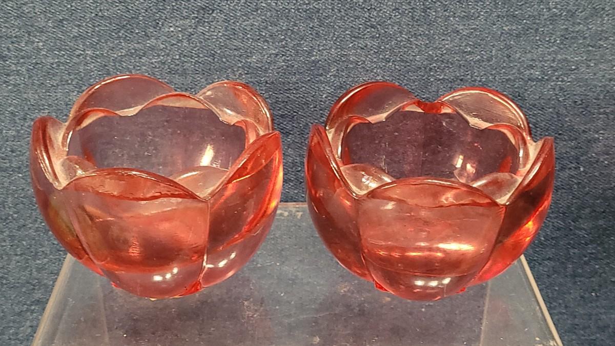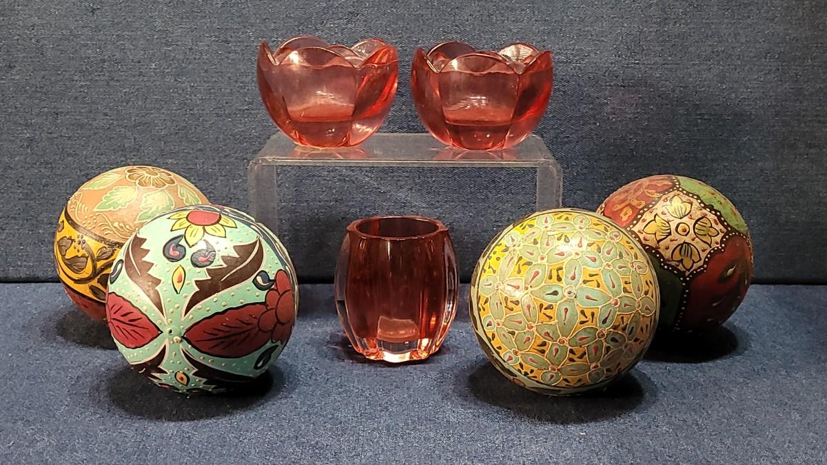 Lot 112: Vintage Cranberry Glass Candleholders & Handpainted Decorative Balls