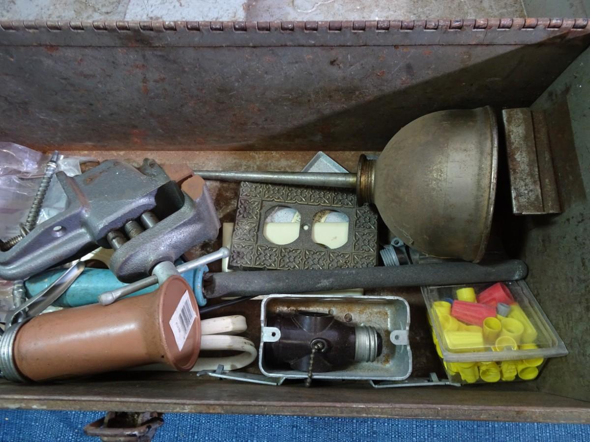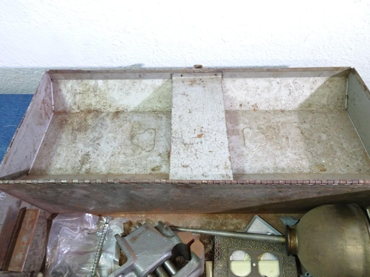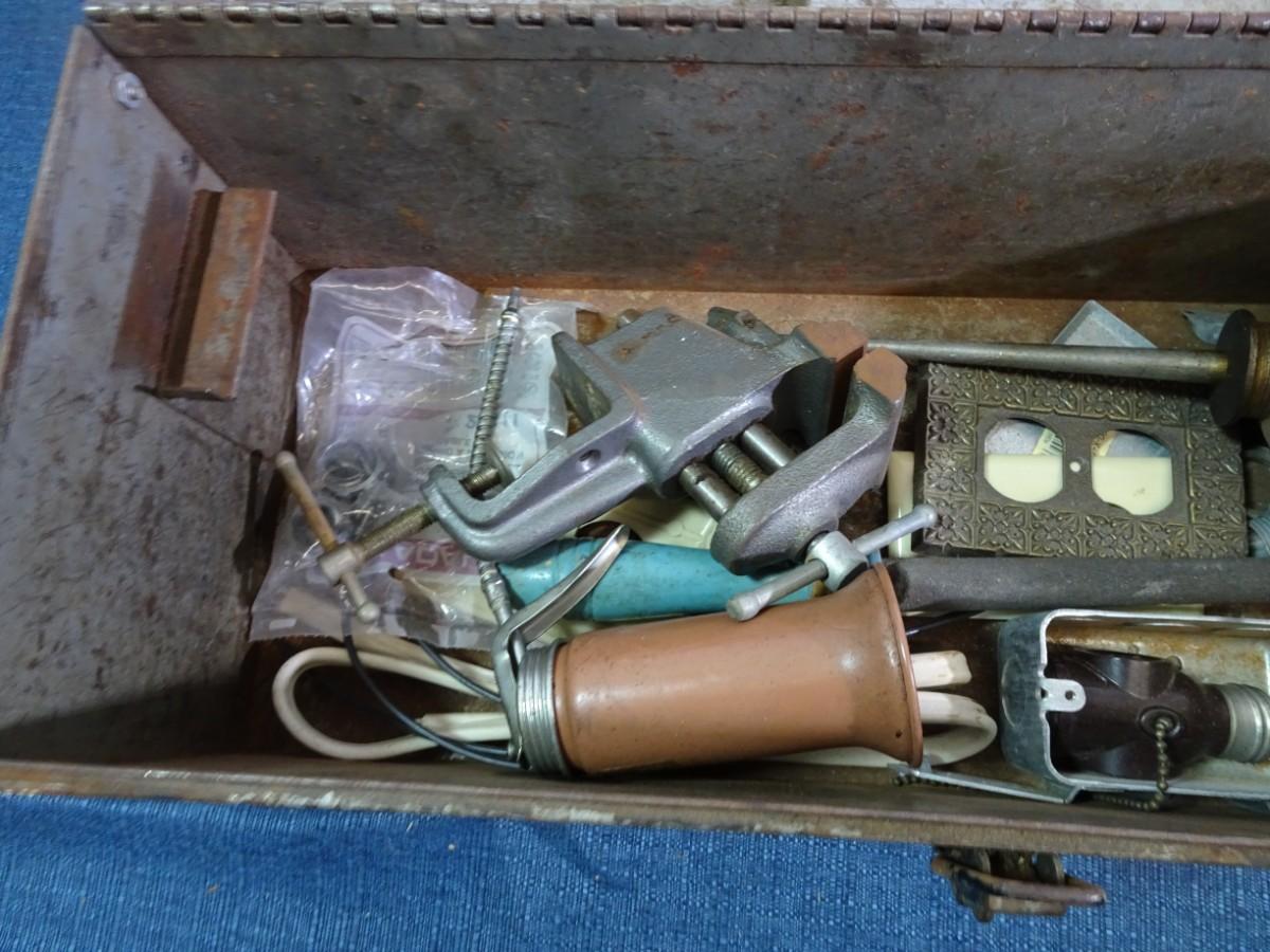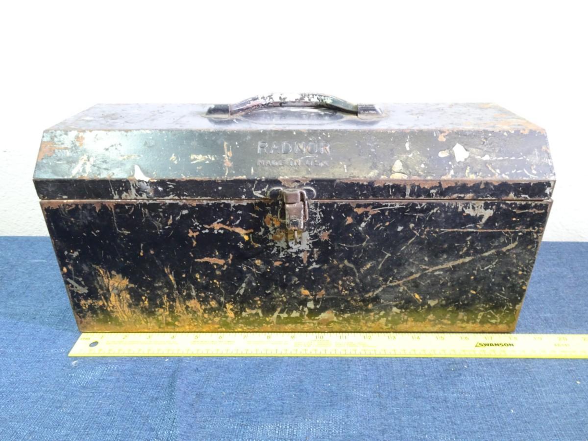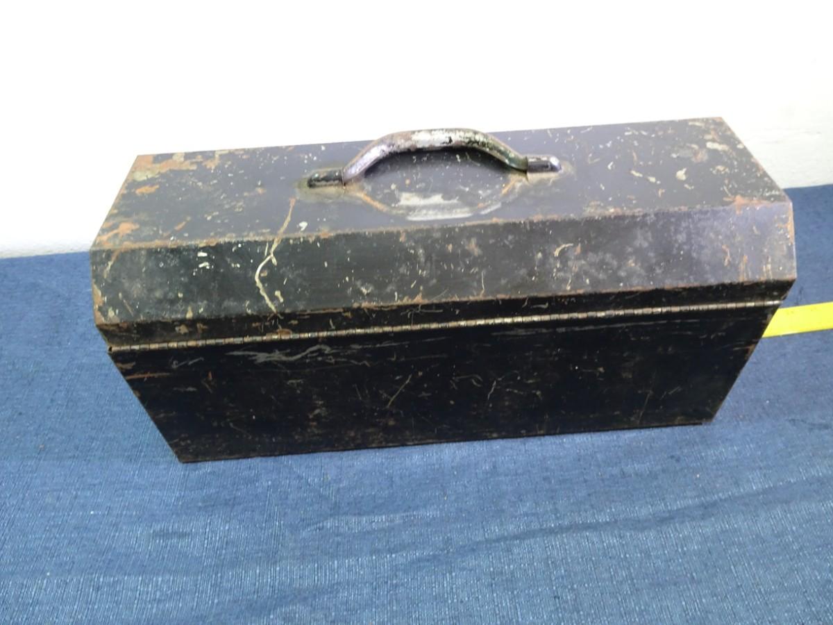 LOT 112. VINTAGE TOOL BOX WITH MISC TOOLS