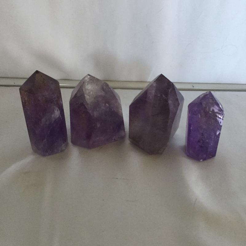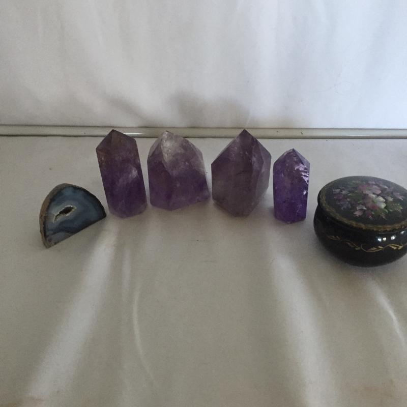 Sparkling Selection of Amethysts with Wooden bowl. Tallest Amethyst Measures 3” Tall.