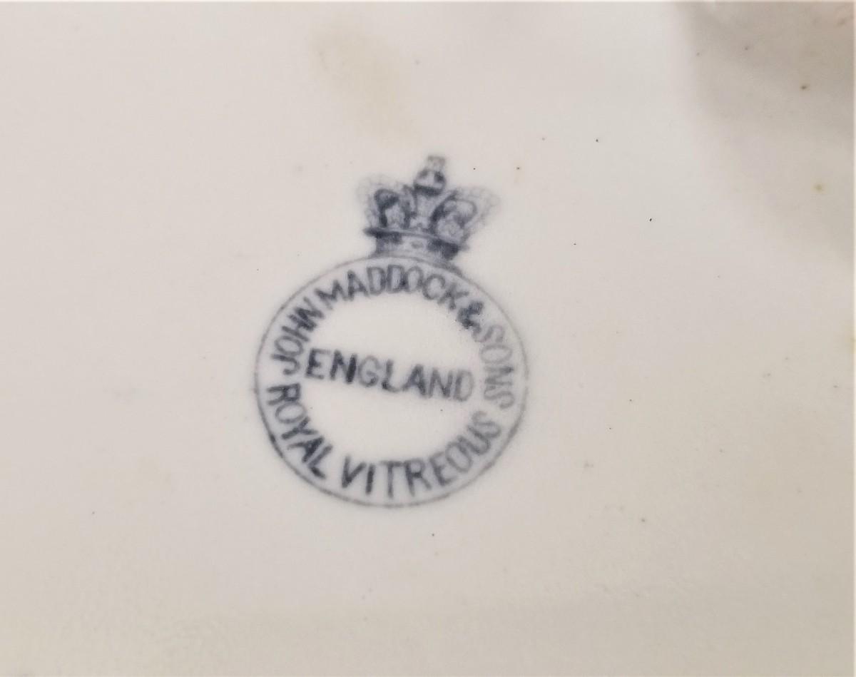 Beautiful old antique tureen, made by John Maddock & Sons (England). 12" across, 4.5" tall - transferware. Good antique condition.