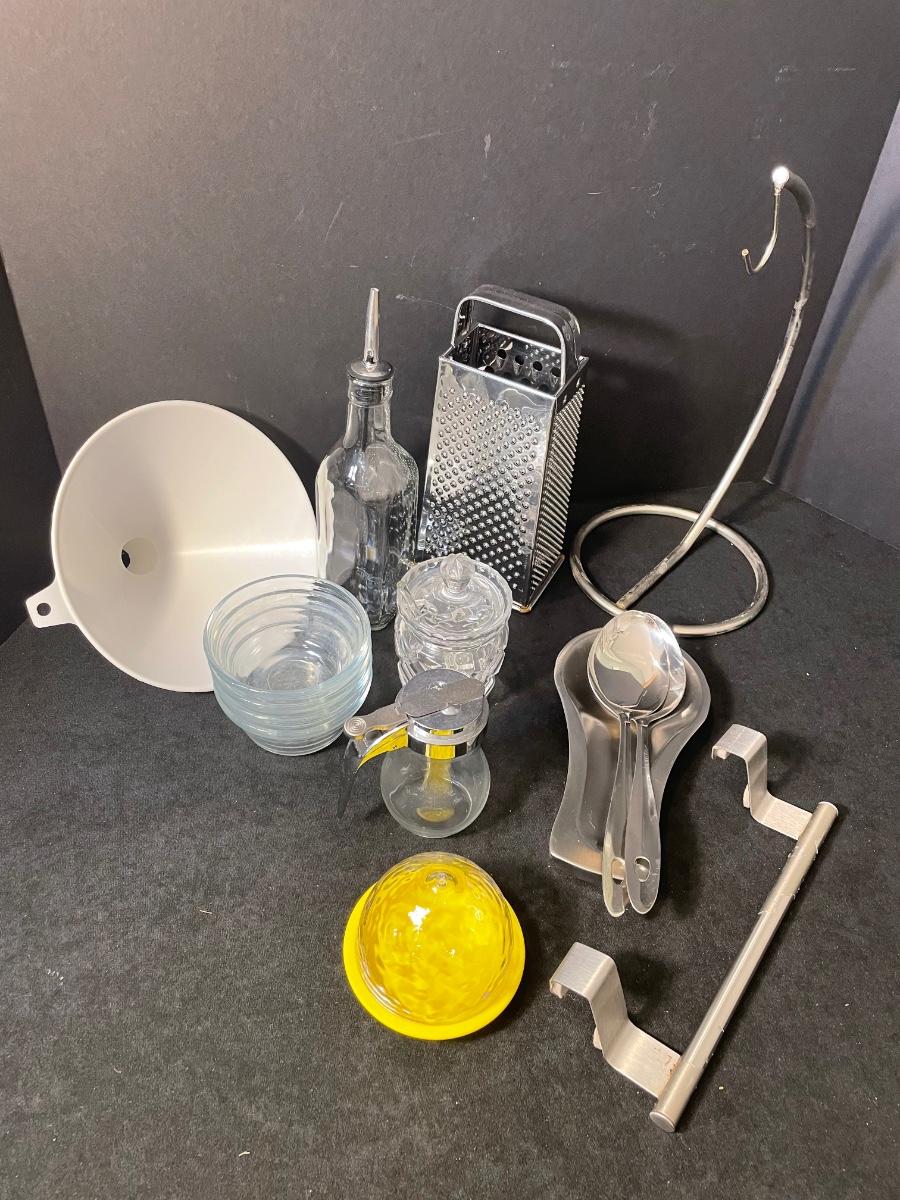 Includes 4 sided box grater, plastic funnel, banana holder, over the cabinet door towel holder, syrup dispenser, honey pot, cruet, spoon rest with spoons and small glass bowls.