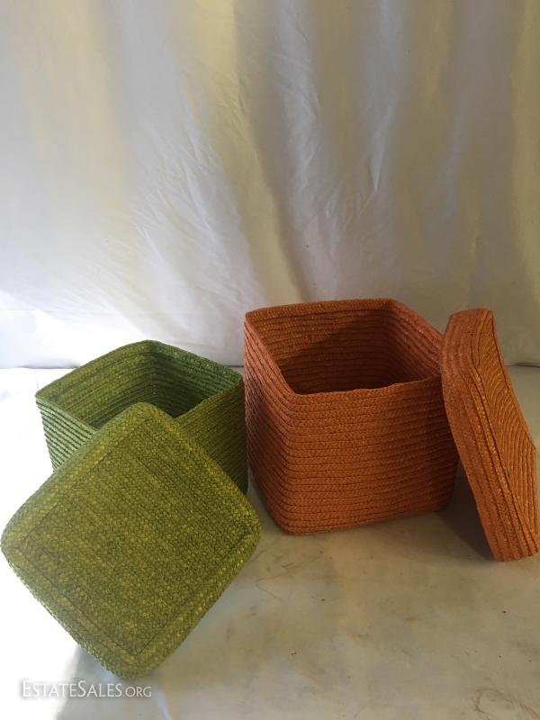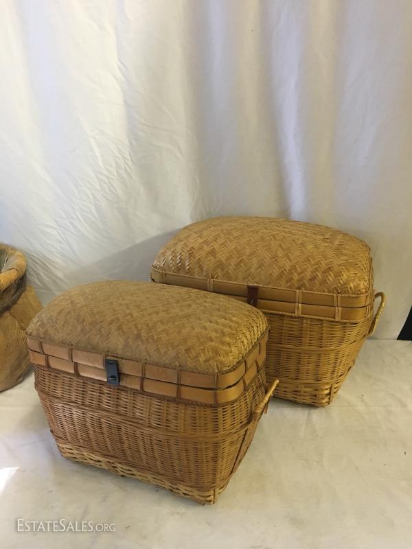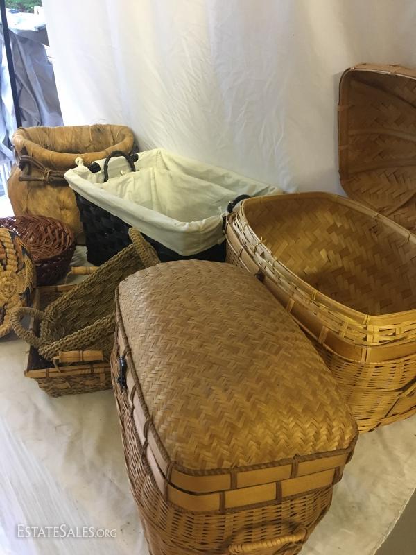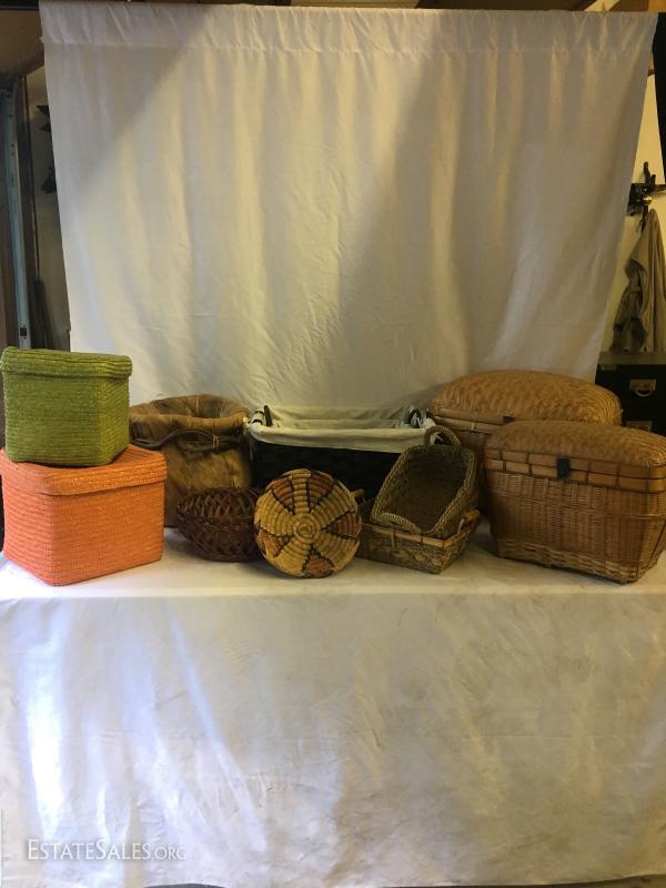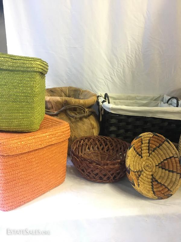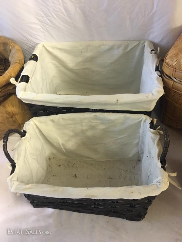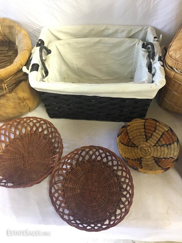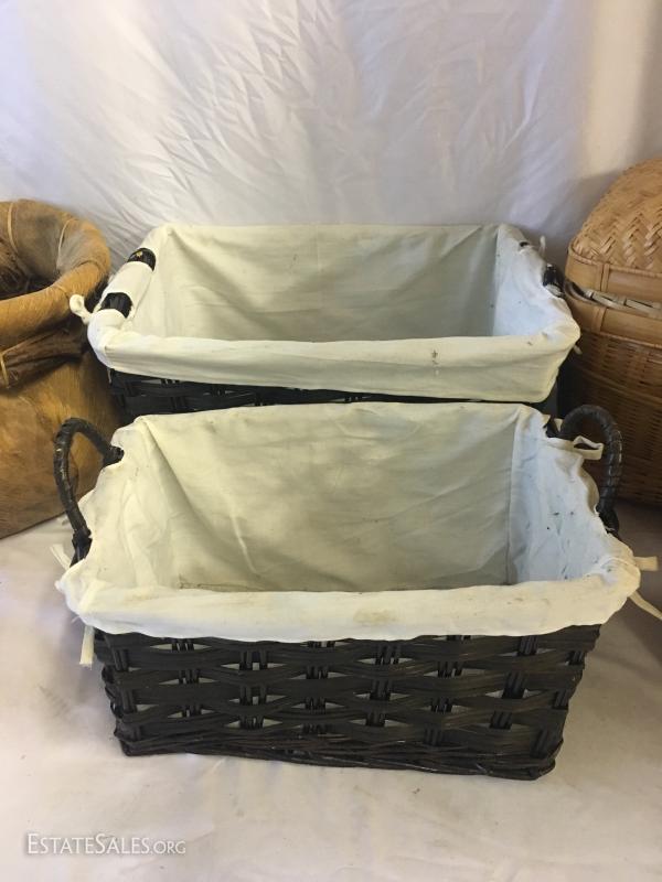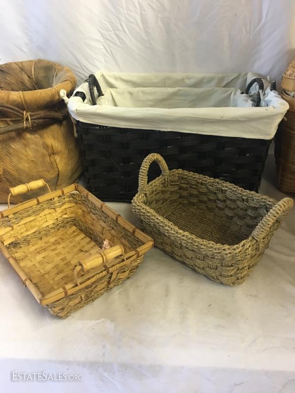 12 baskets of varying sizes and materials. Three sets of nesting baskets. Set with fabric lining is a bit dirty and handles on large basket are broke off. Largest basket measures 20" x12" x15". This lot is available for local pick up in Waynesville, NC only.