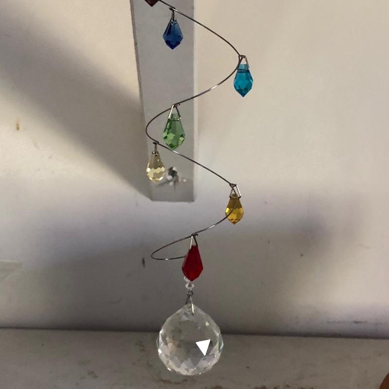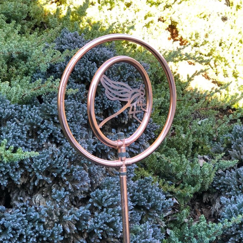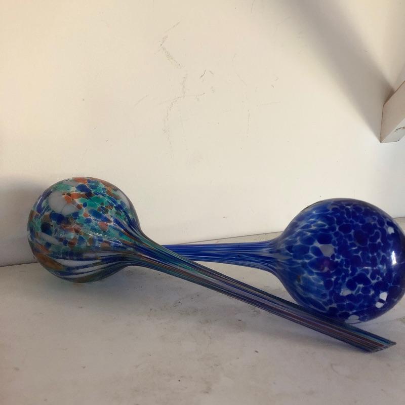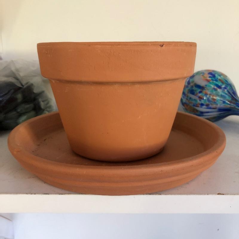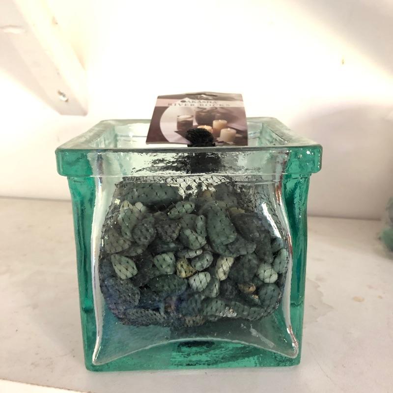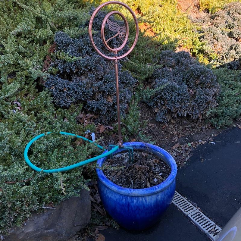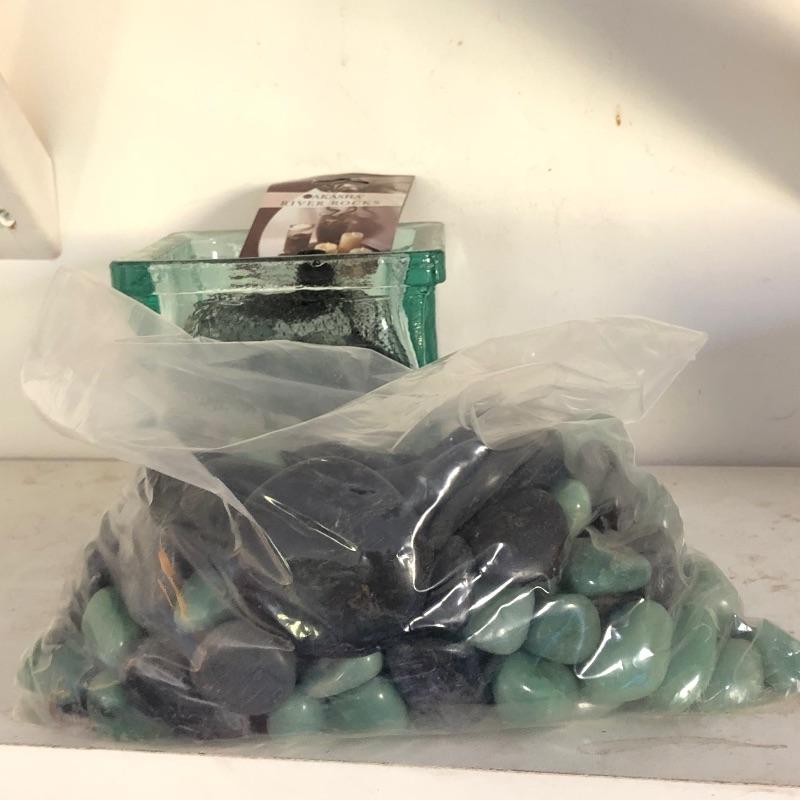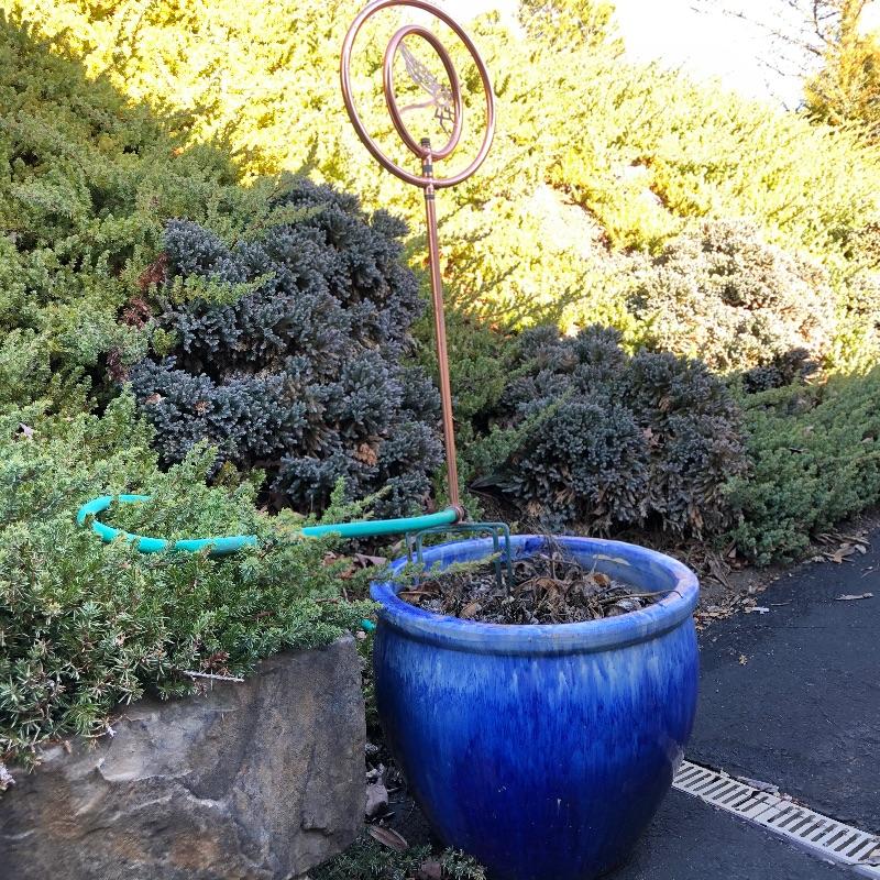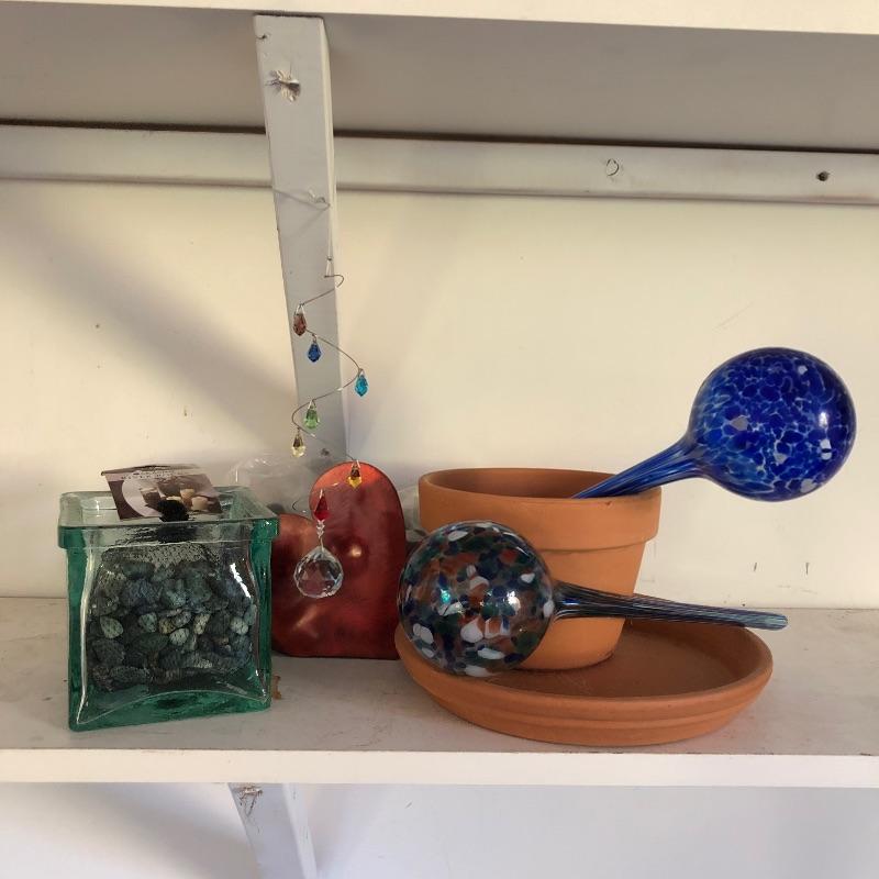 Lovely large planter with shades of blue measures 20” x 20” x 17”. Inside the pot you'll see a copper metal sprinkler with hose attachment that can be placed in dirt anywhere and has a cute dragon fly cut out. Additional accessories include a small clay pot with saucer, hanging decoration, hear shaped magnet, bag of assorted decorative garden rocks, decorative garden bulbs and a new teal planter with river rocks. No shipping
