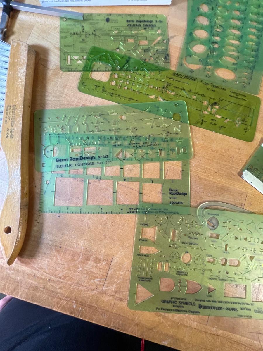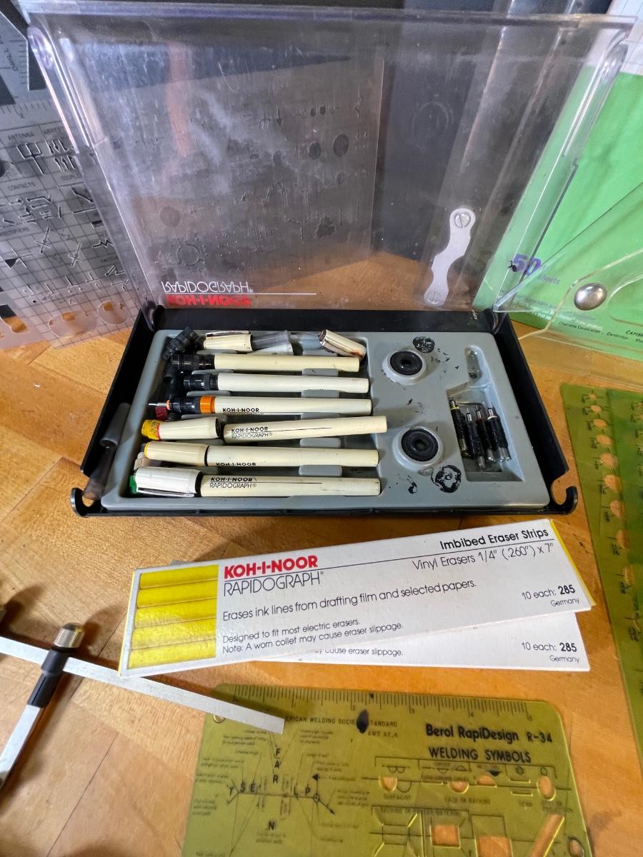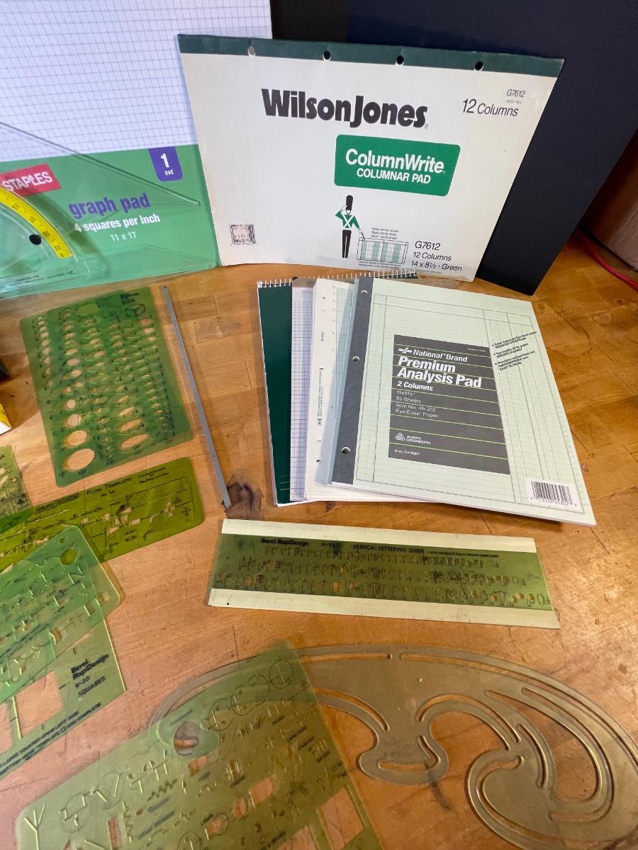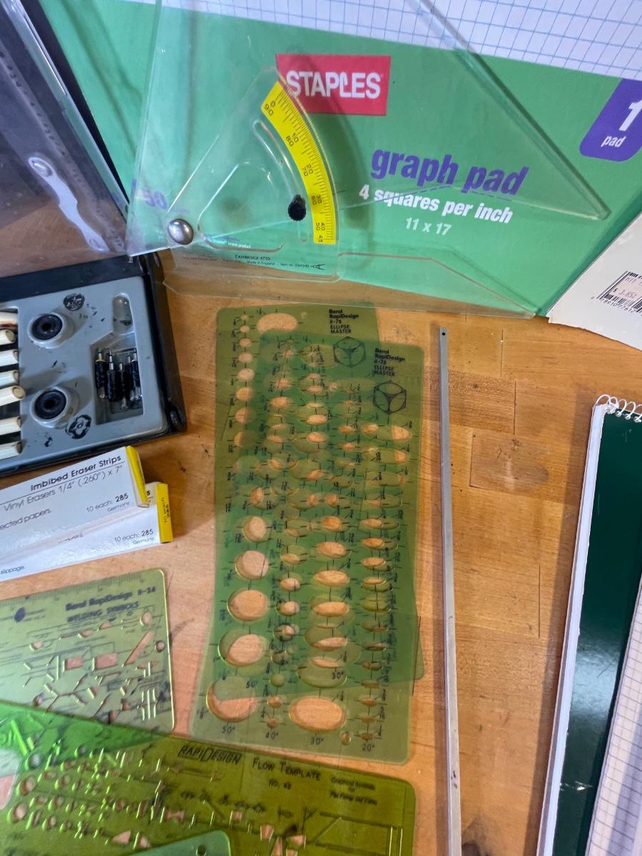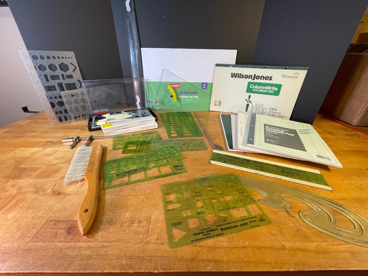 Various pads of graph paper and specialty notepads, an assortment of templates, protractors and rulers , a whiskbroom, a double compass, two boxes of erasers for drafting film, and a set of refillable ink pens