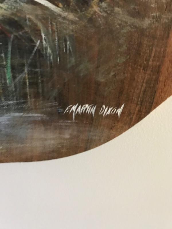 Signed Great Blue Heron painting on wood. Signed F. Martin Dixon, measures 35” tall and 17” wide