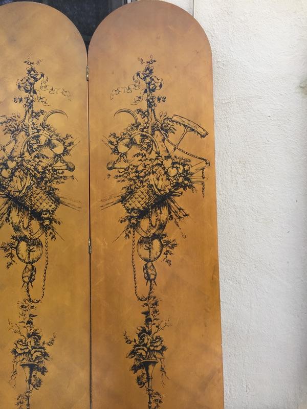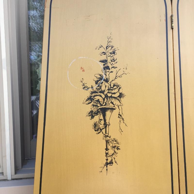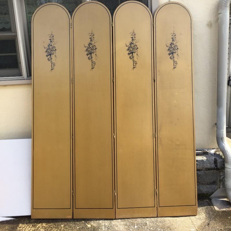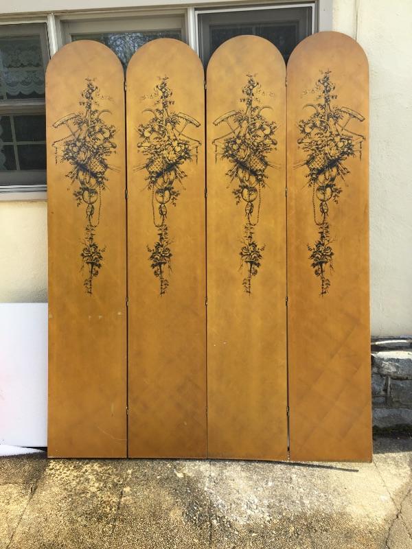 Lovely wooden four panel room divider with design. Put these in any room you want some privacy or just for decoration. Each panel measures 16” x 85”. And is double hinged for multiple settings.