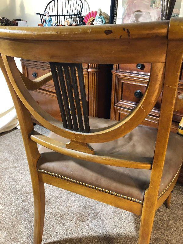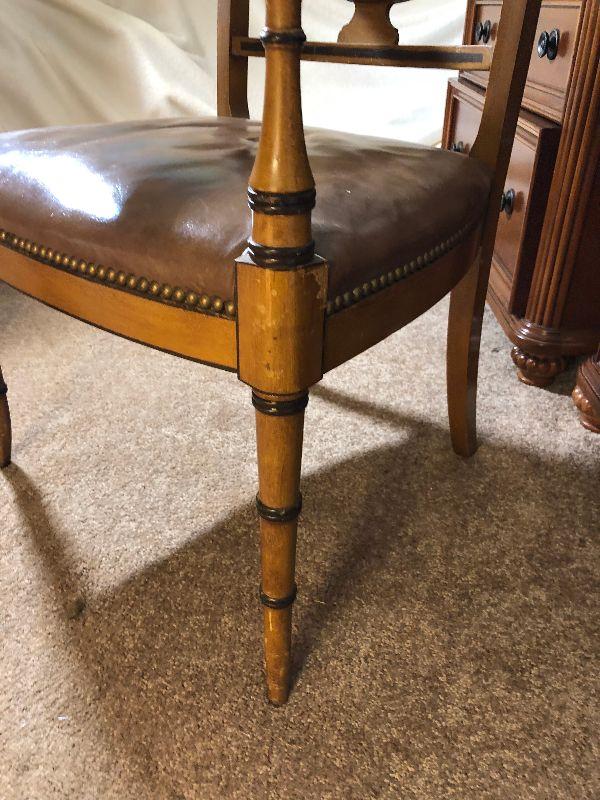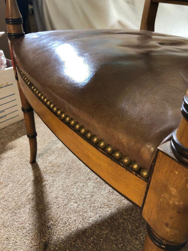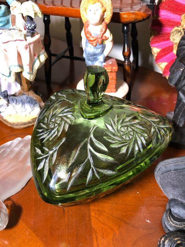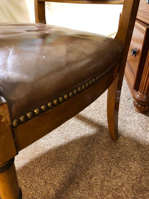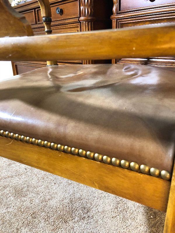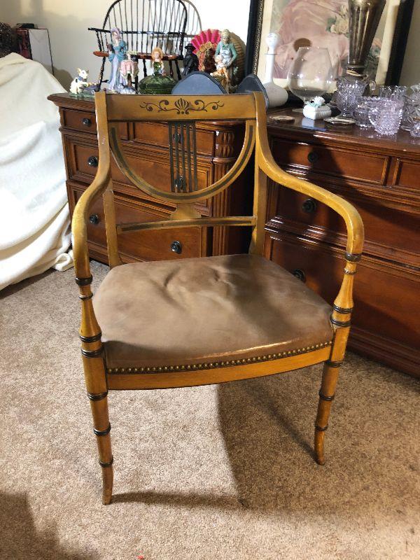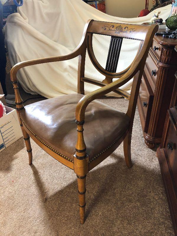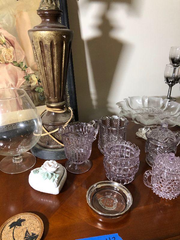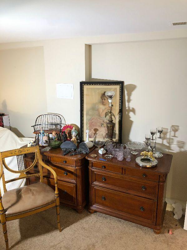 2 Wooden locking file cabinets (36.5"L x 20.5"W x 30"H), vintage leather armchair, Fenton custard glass decanter, vintage 'Brockway' ashtray, wall art and other miscellaneous items.