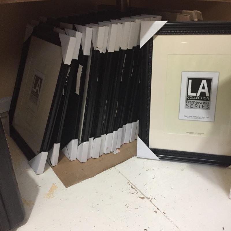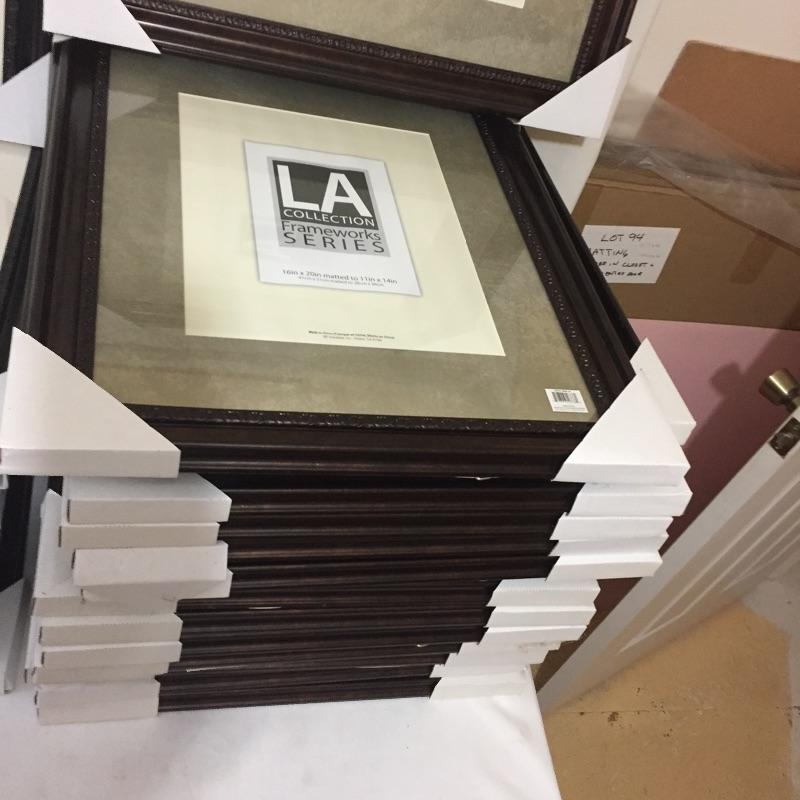 Frames, frames and more frames in a range of sizes, black and brown. Includes 16 brown matted frames 16”x 20” which are Matted to 11” x 14”. 15 of the same frames but in black.