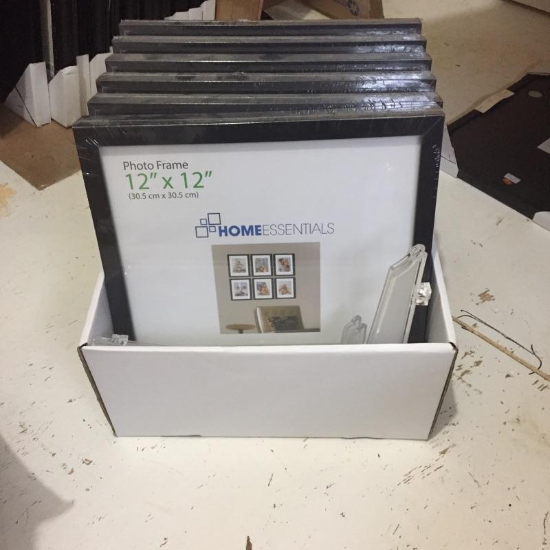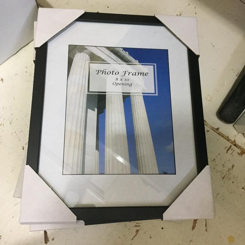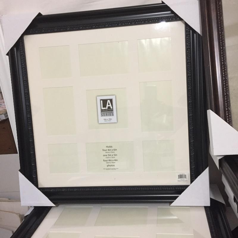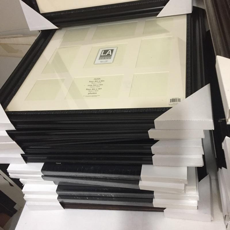6 black frames that hold multiple smaller pictures. 5 black poster frames, 6 black 12” x 12” and 4 black 8” x 10” and a few miscellaneous sizes.