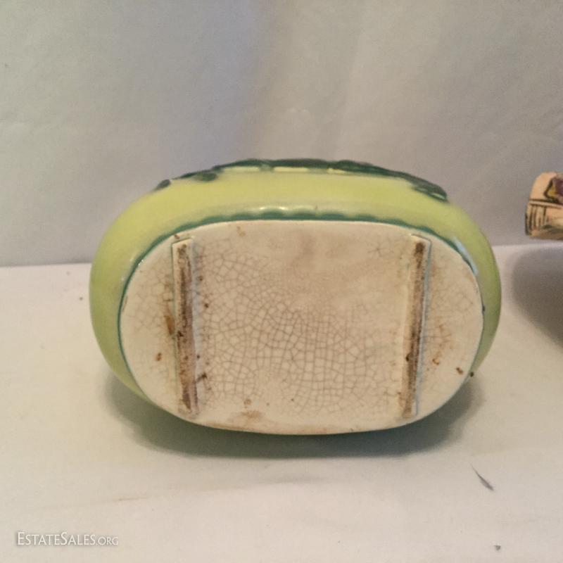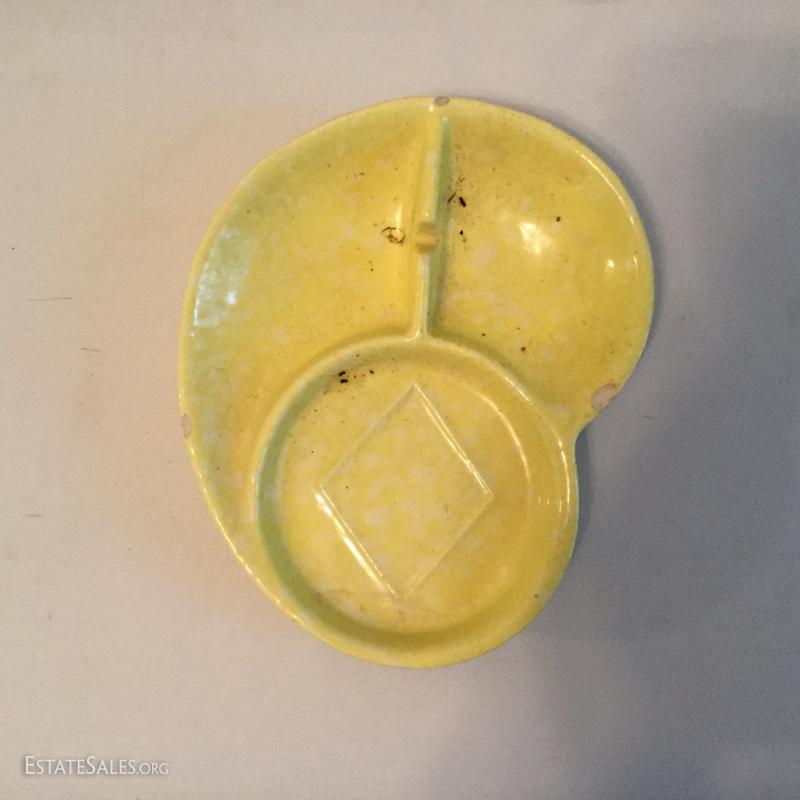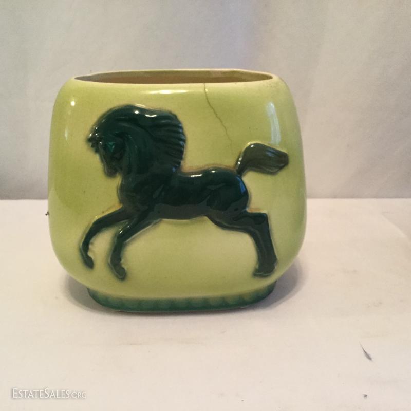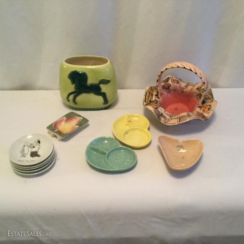 Beautiful and unique Hull, pink basket, many MCM catchalls and/or ashtrays and a MCM green and yellow vase with a horse detail. Lot available for shipping or local pick up in Saluda, NC.
