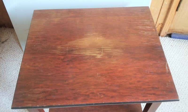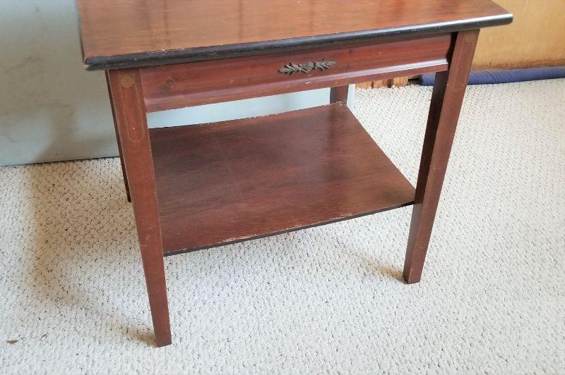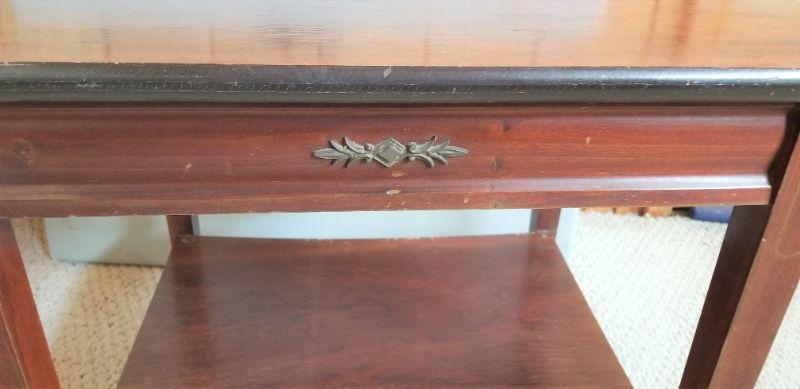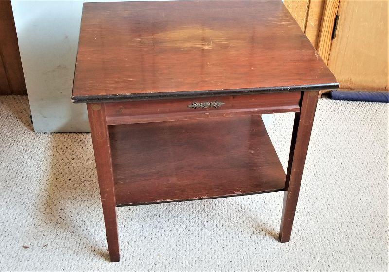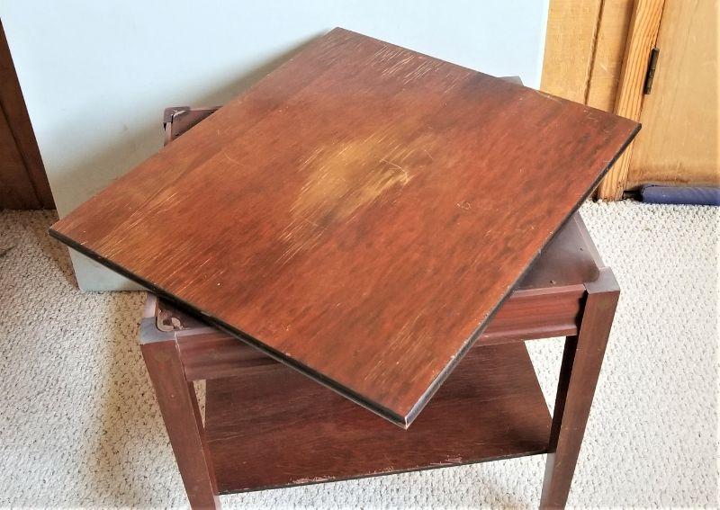 This side table has a rotating top - metal decoration - top needs some refinishing as shown. 23.5" x 20.5", 23" tall. Shelf underneath.