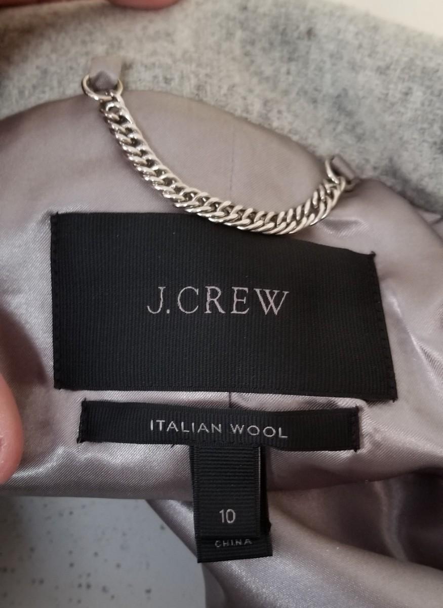 Beautiful grey Italian Wool coat by J. Crew, size 10 - 35" long, sleeve 27" long from the shoulder, about 20" wide at the shoulders. Good condition - smoke free home - looks good.