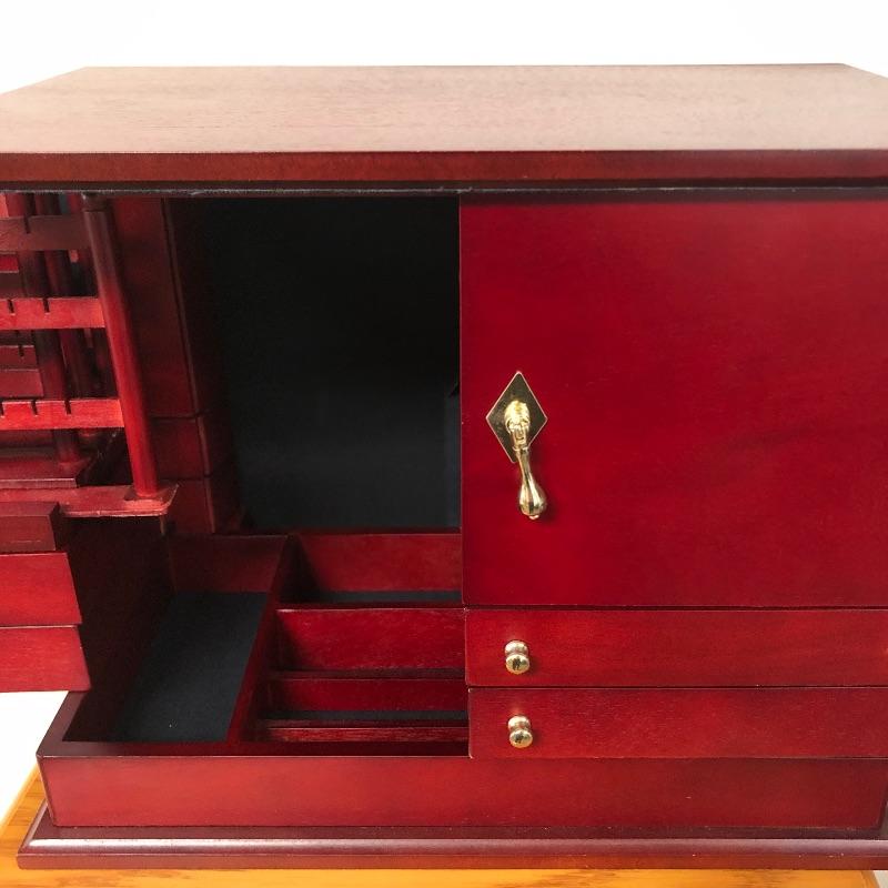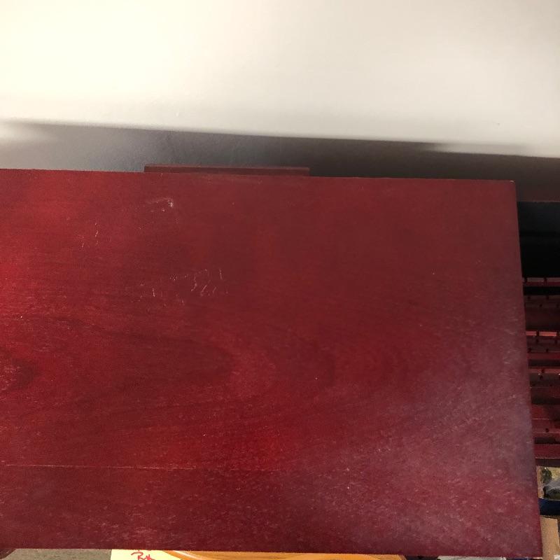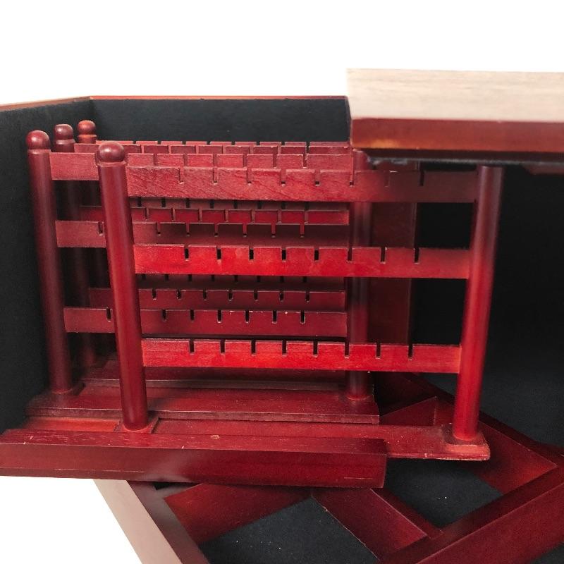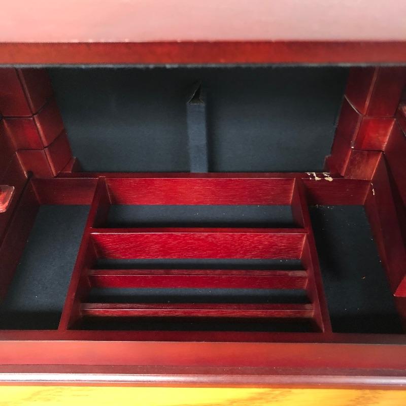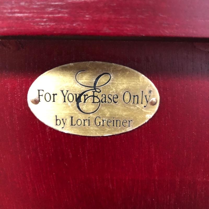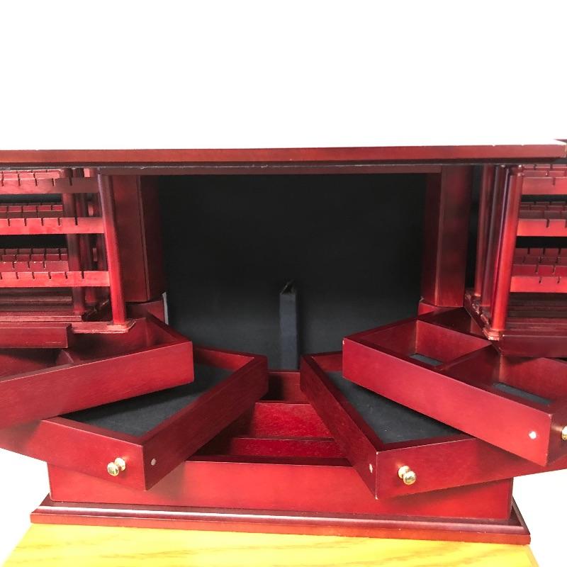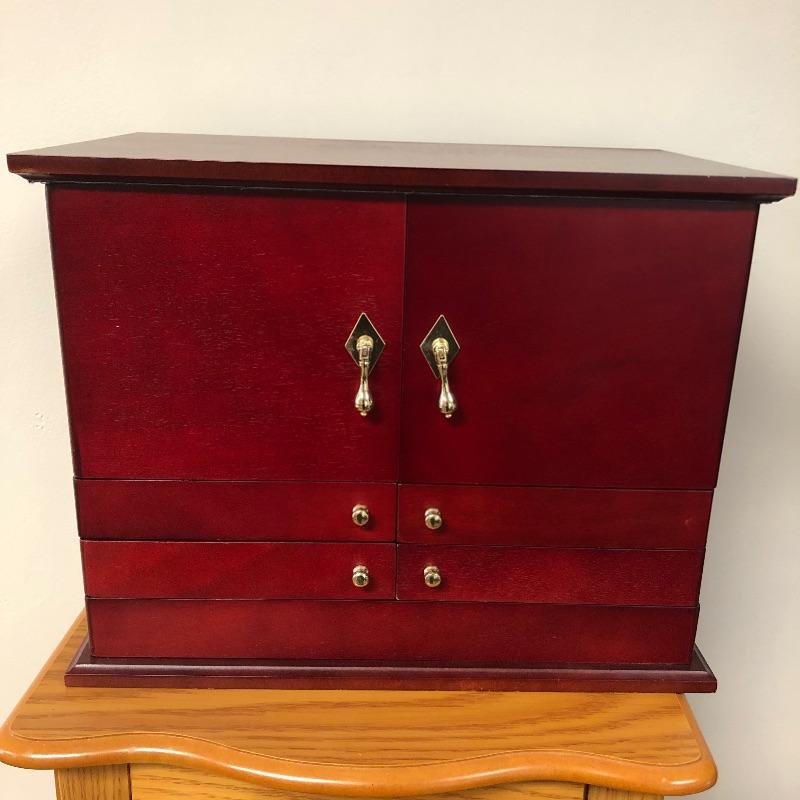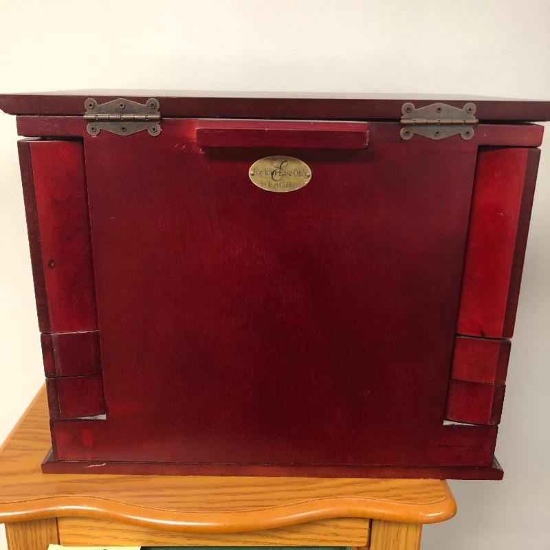Lovely dark red wood jewelry box provides much storage for your precious pieces. Metal plaque says made by Lori Greiner. A total of eight earring or necklace stands, two drawers for bracelets and two for rings and the bottom drawer for necklaces, watches or bracelets. Top lifts up with a mirror to see yourself. Box is in good condition, see images. This item would incur higher than flat rate shipping charges. Please call UPS for an estimate prior to bidding. 828-252-6930