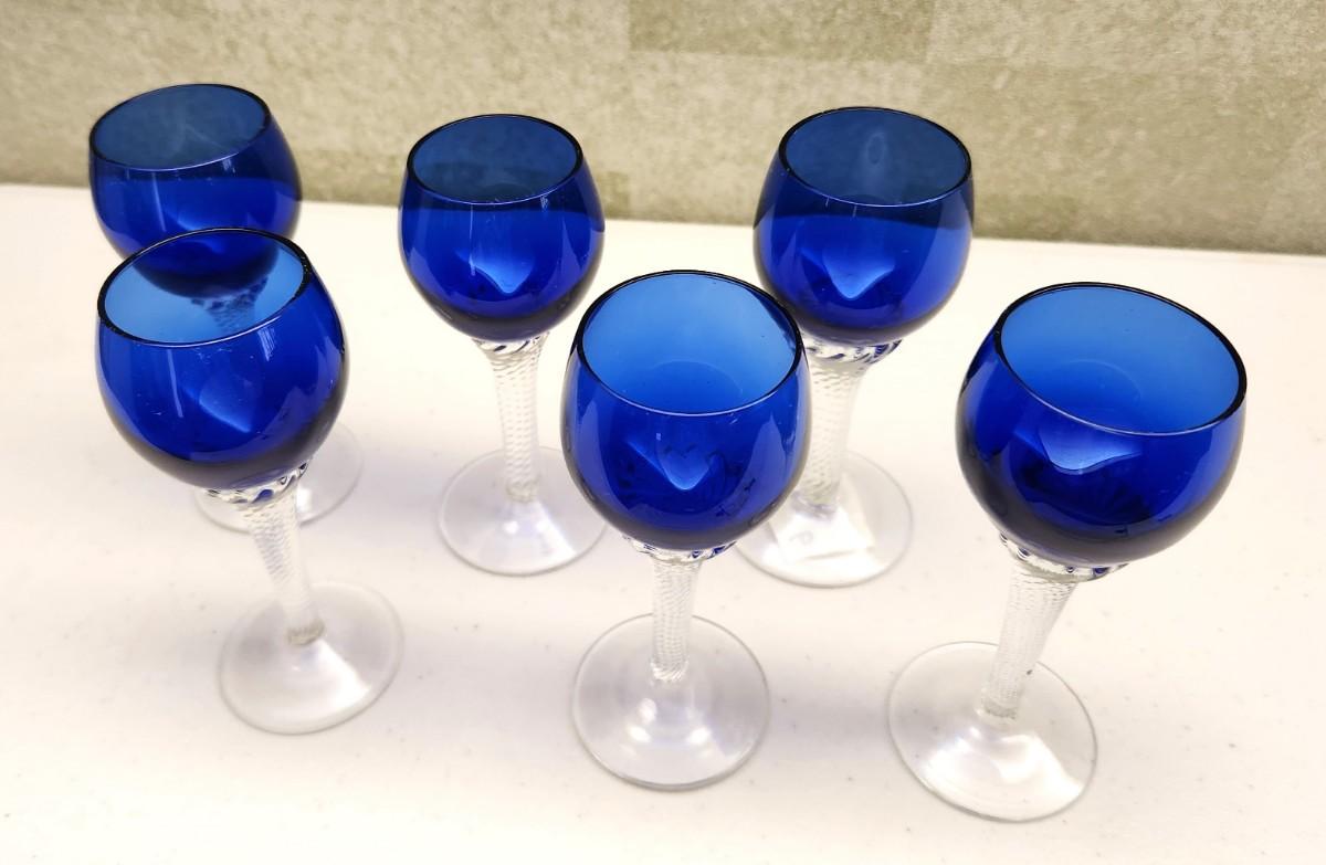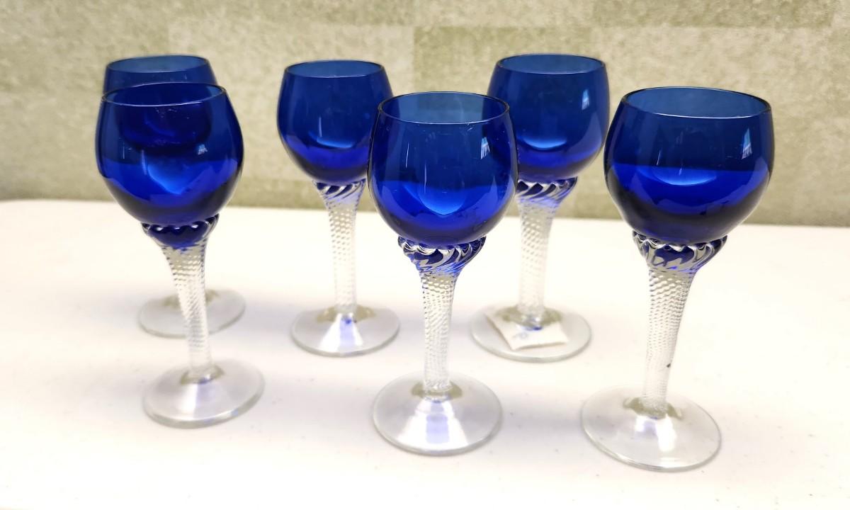 Nice lot of 6 vintage Cobalt Blue cordial Glasses - twisted stems. Each 5" tall. Good condition.