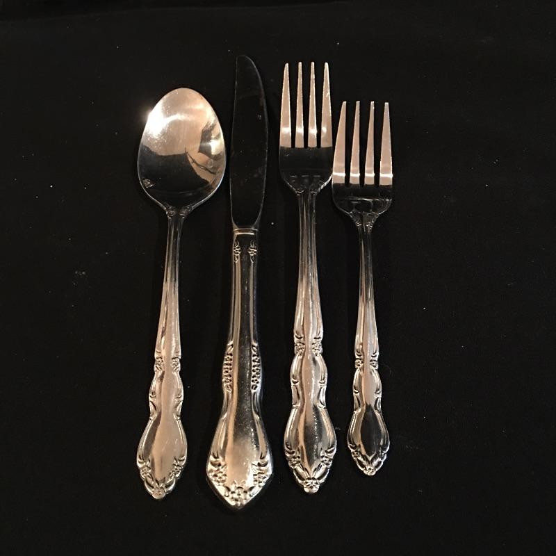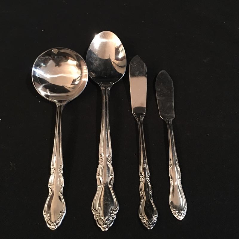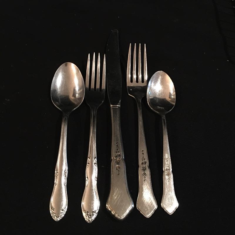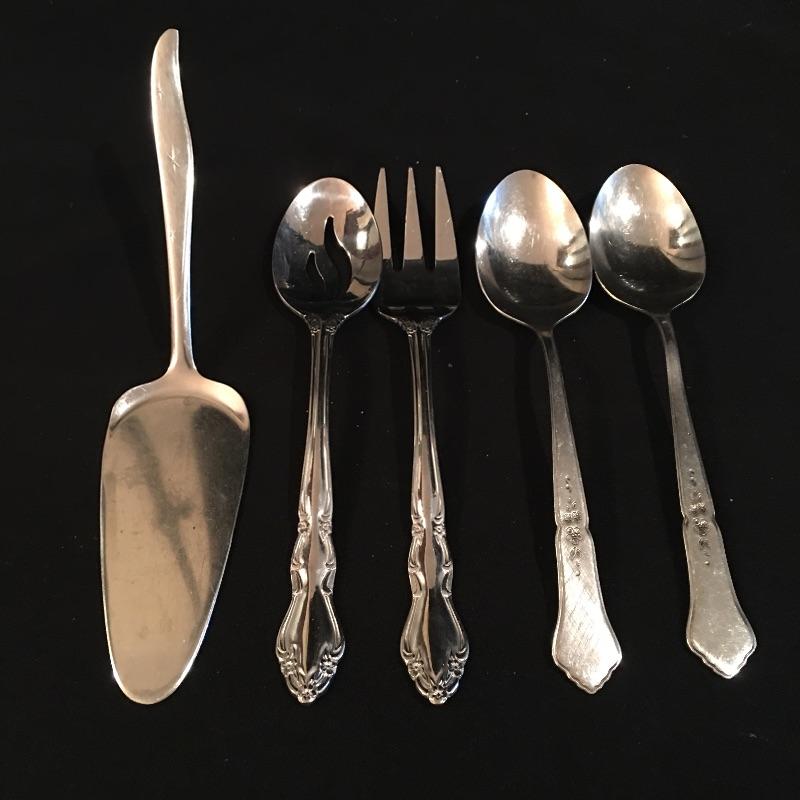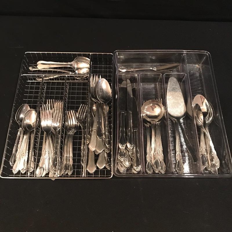A nice assortment of mixed flatware with two flatware trays, one chrome and one plastic. Lot includes over 75 mixed pieces including dinner and serving pieces. Trays measure 10.5” x 14” x 1.75”.