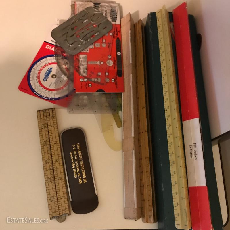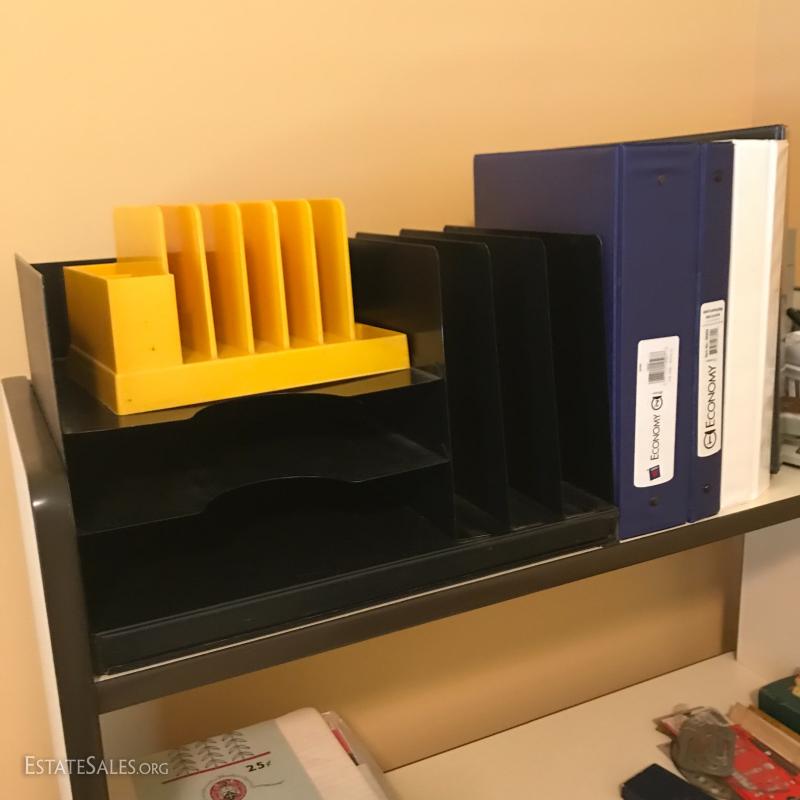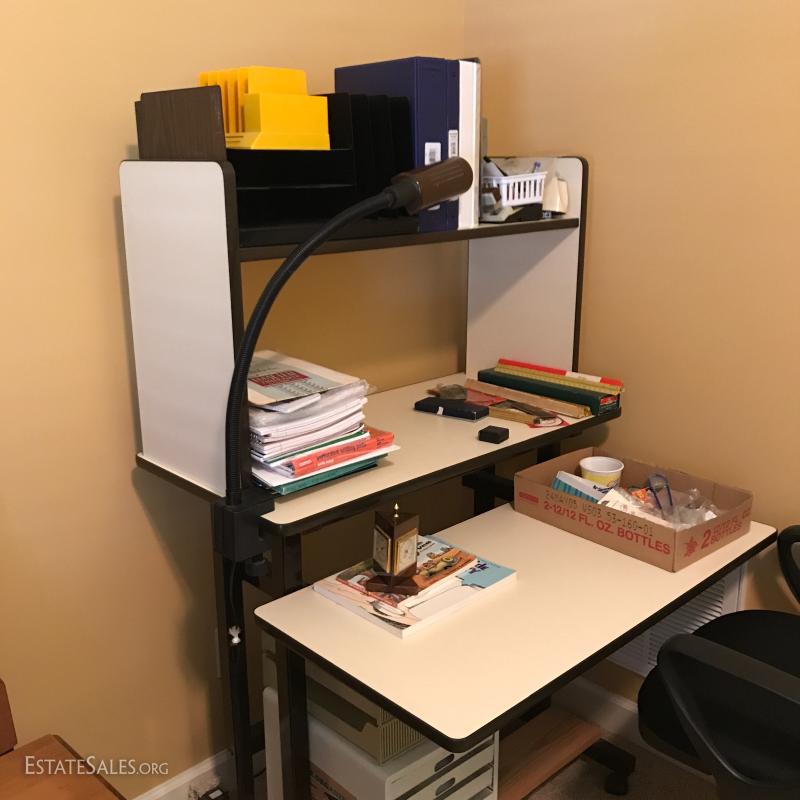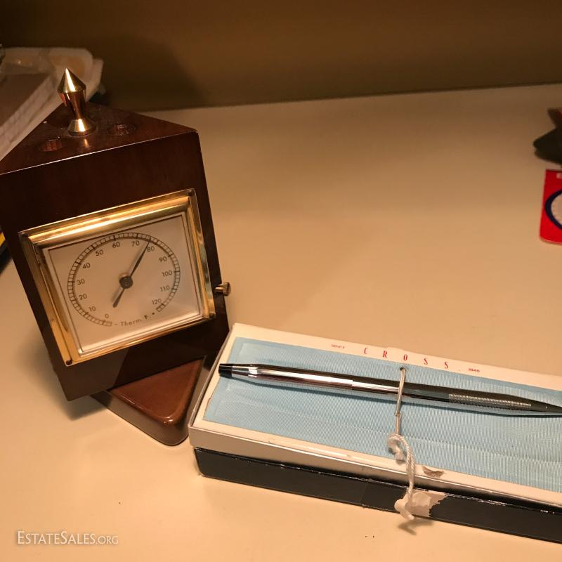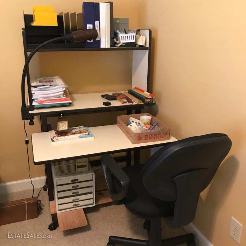 Movable, portable desk, black swivel chair, mountable lamp, slide ruler and other rulers, far side books, cross pen, tabletop barometer, binders, paper, pencil Sharpener, and misc office supplies.