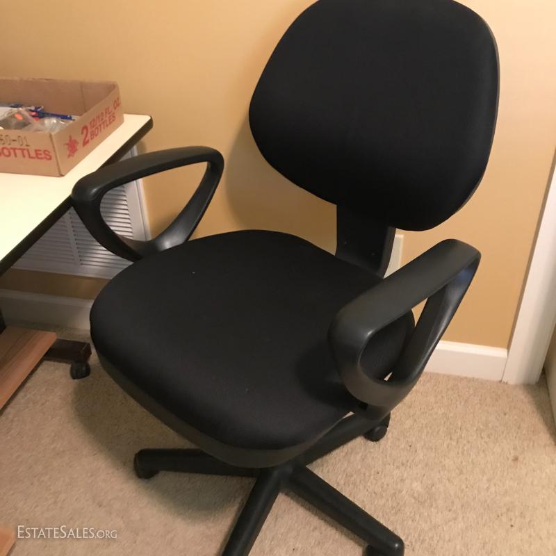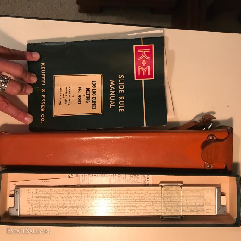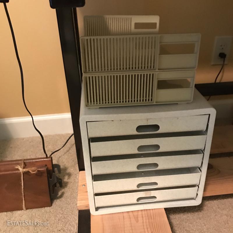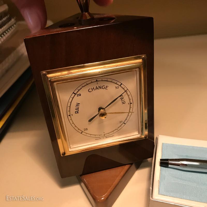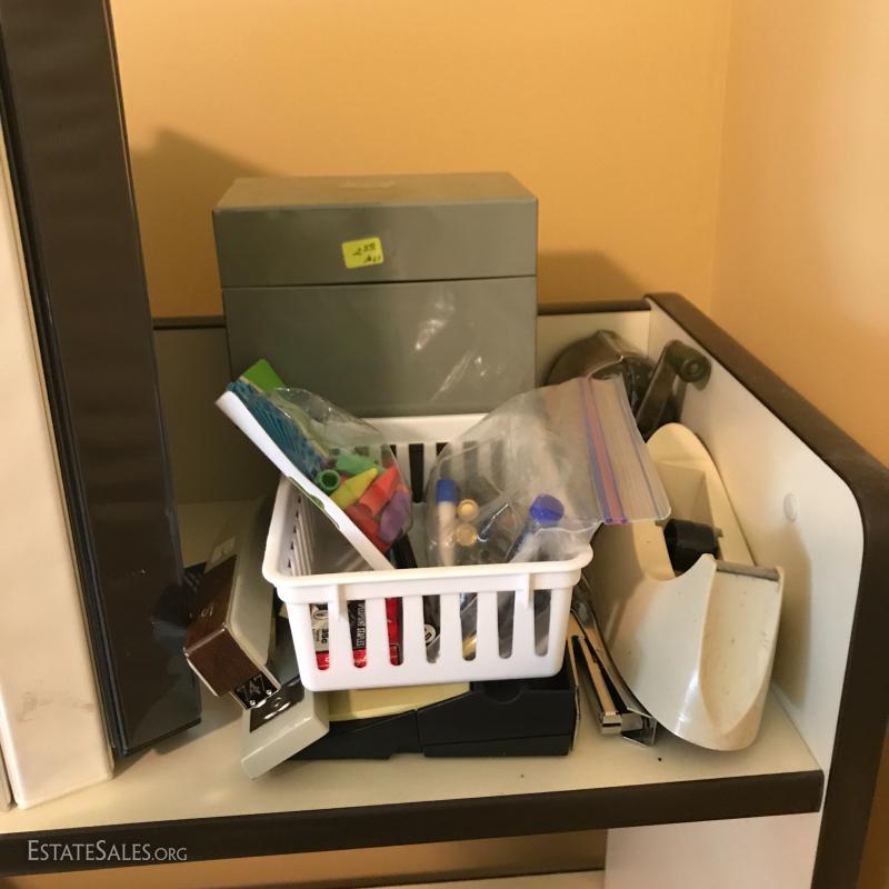 Movable, portable desk, black swivel chair, mountable lamp, slide ruler and other rulers, far side books, cross pen, tabletop barometer, binders, paper, pencil Sharpener, and misc office supplies.