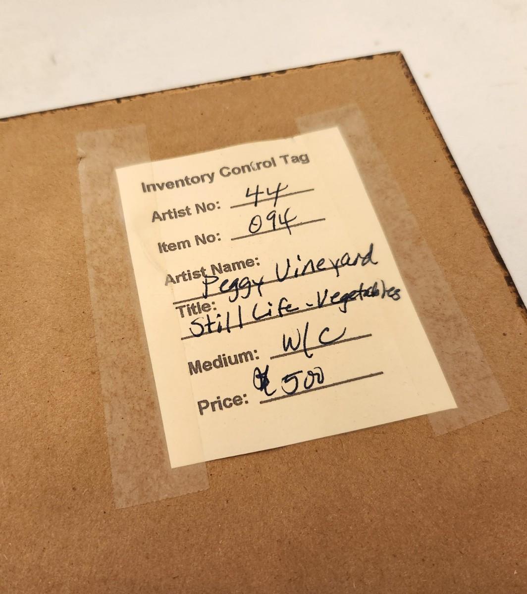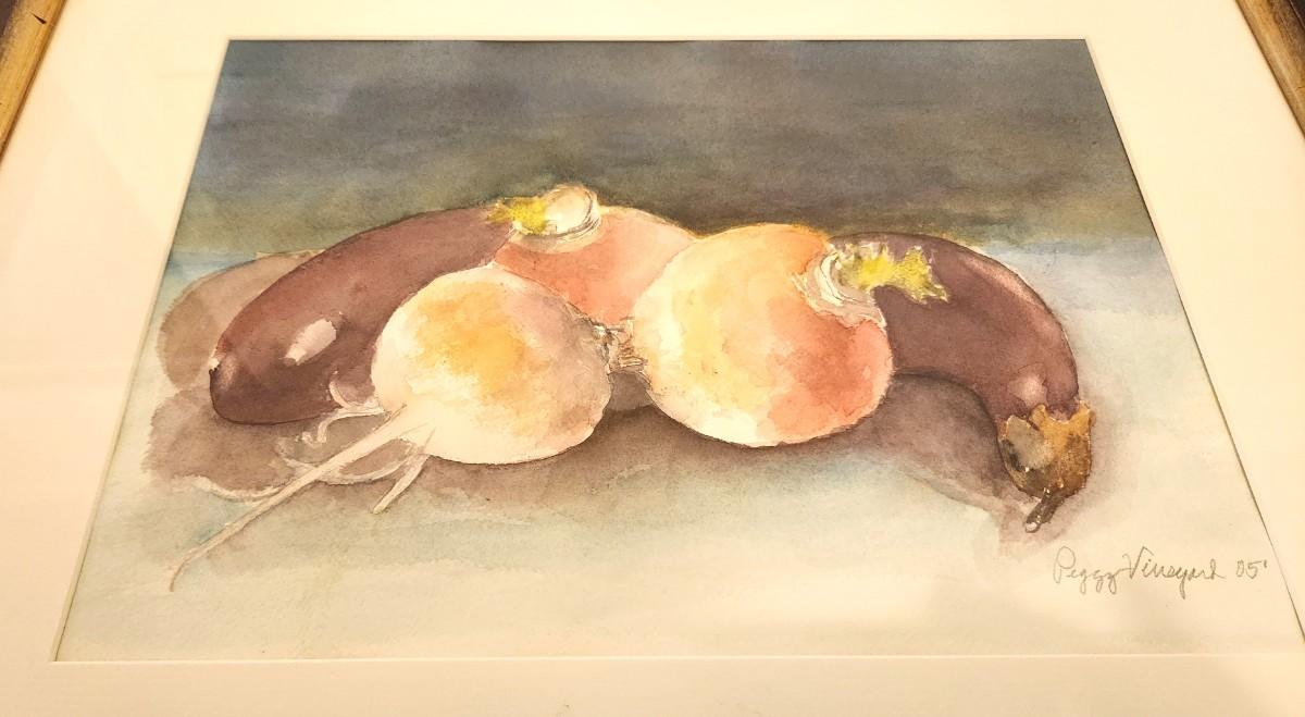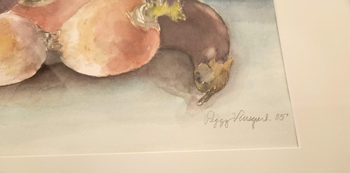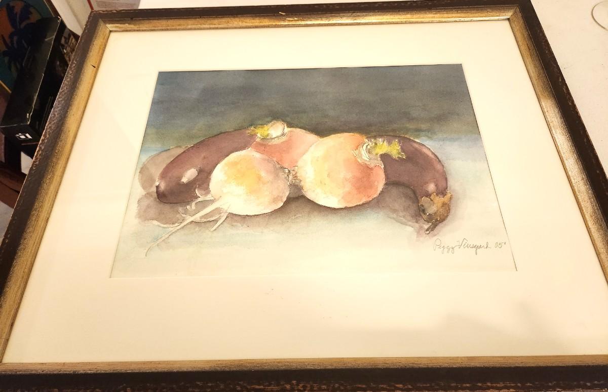 From a local estate - original watercolor by Listed Houston Artist Peggy Vineyard - dated 2005. Entitled "Still Life - Vegetables" - depicts onions/eggplant. This is an early work that was done before she had the acclaim she does now. This picture is probably the "sleeper" of the sale, and was valued at $500.00 in 2005. Would look great in a kitchen.