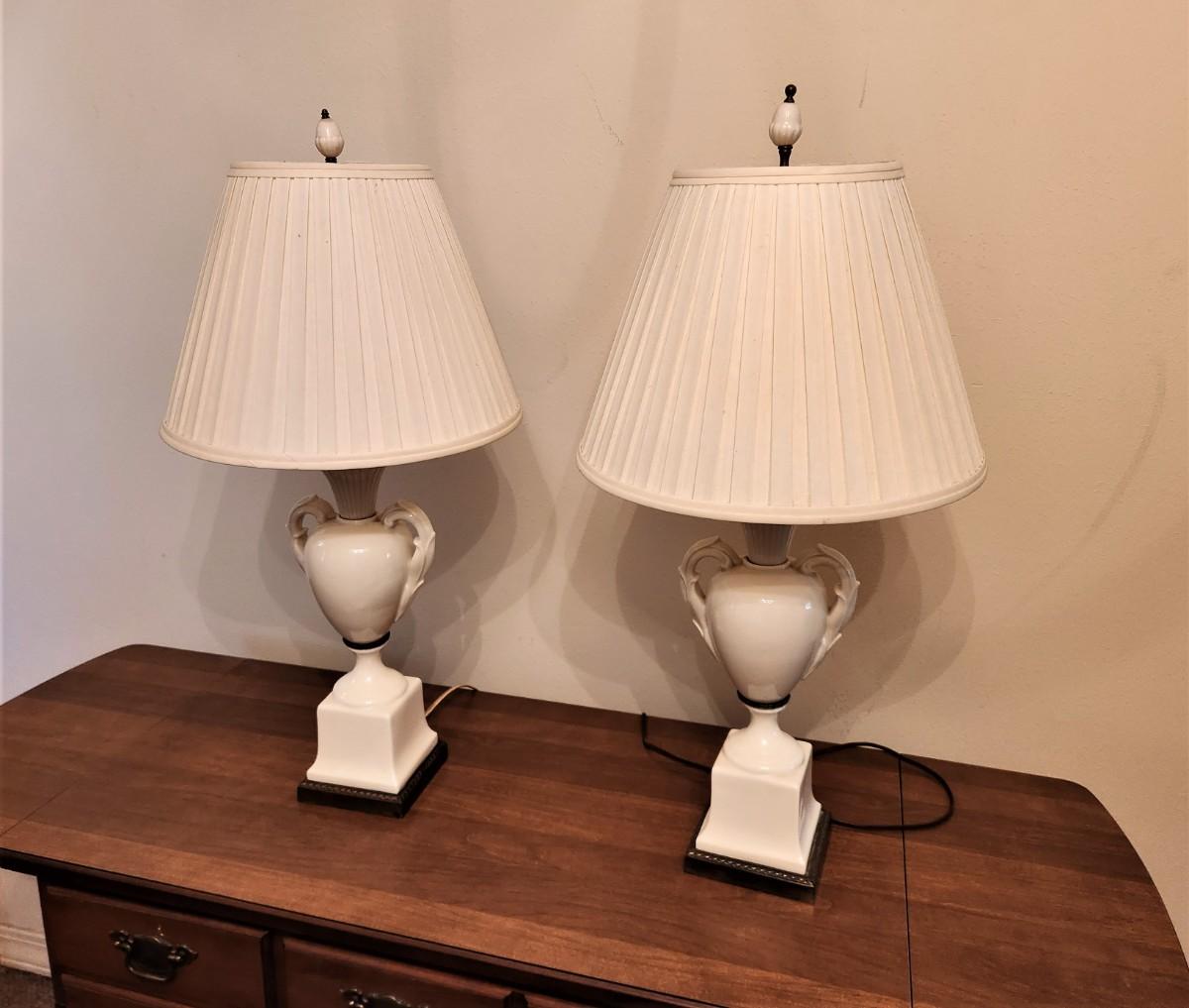 These classic table lamps are in good working condition. 5" x 5" at the base, each 28" tall counting finial.