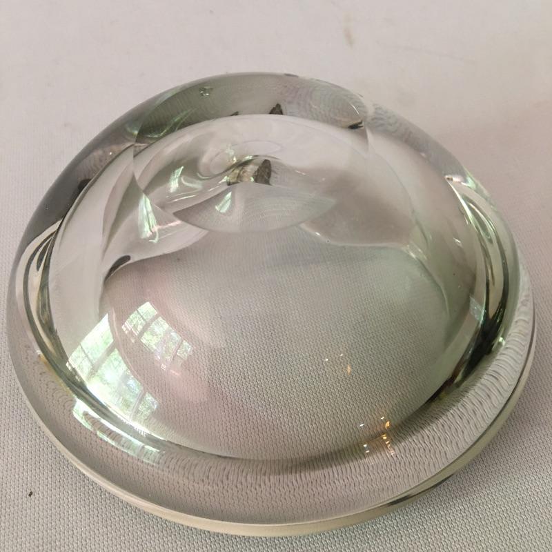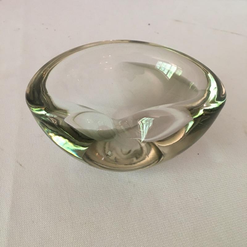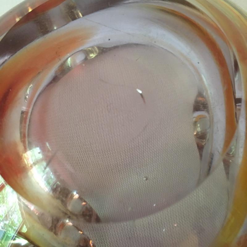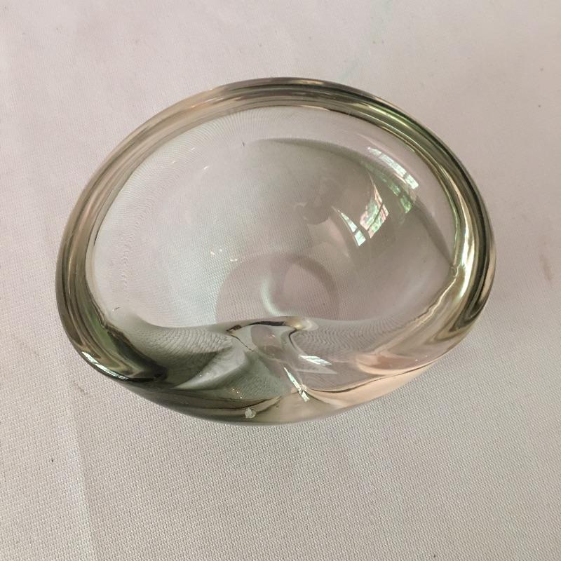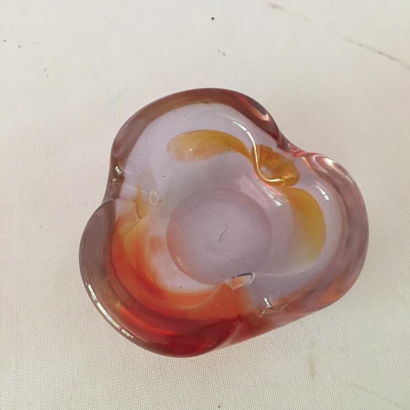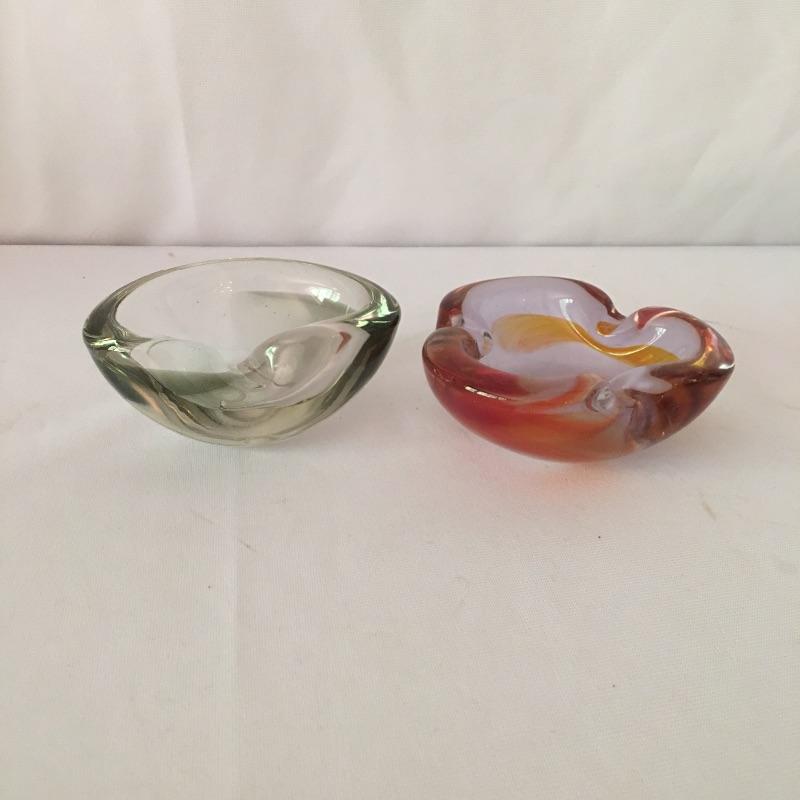 Pair of thick glass ashtrays with one having a splash of color and the other is clear. Use as candy dishes or whatever suits your needs.