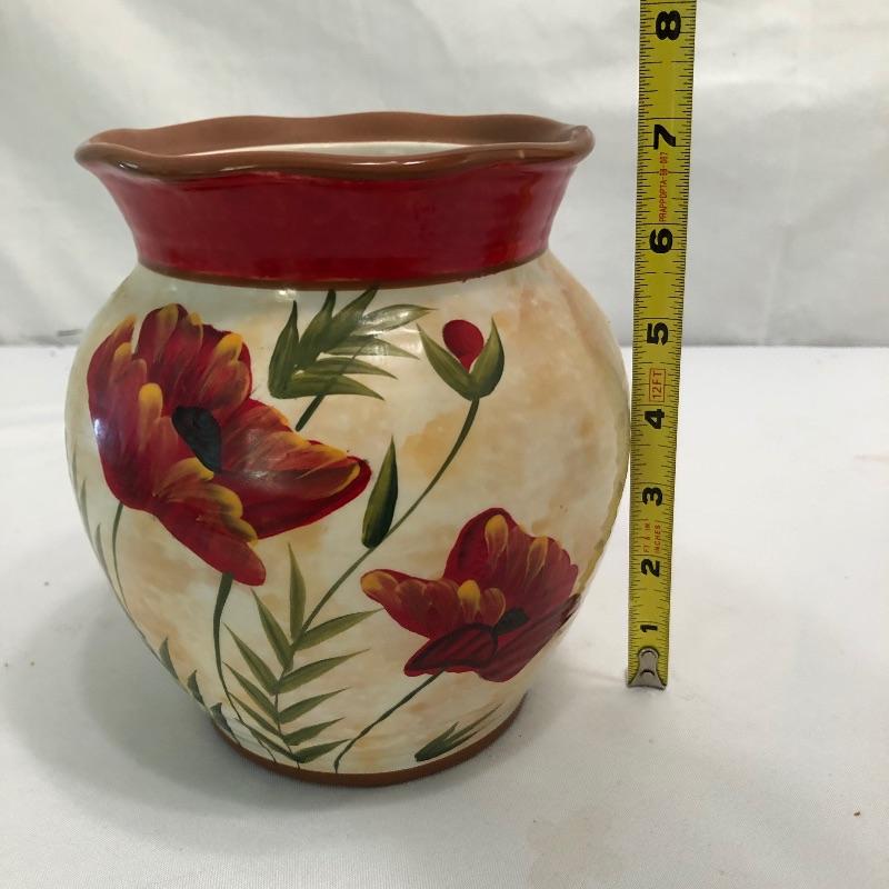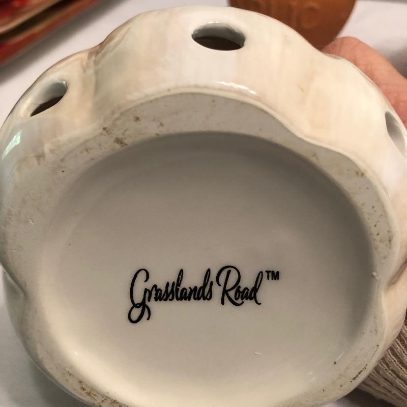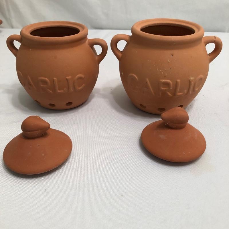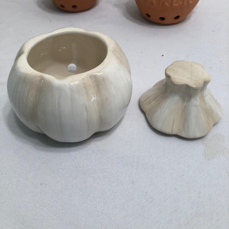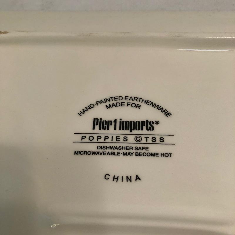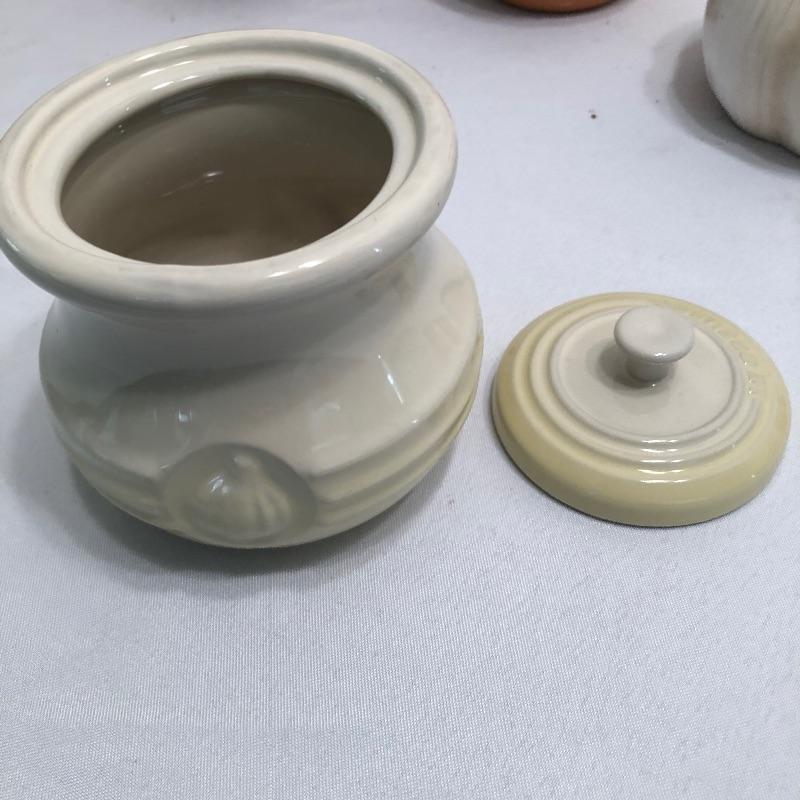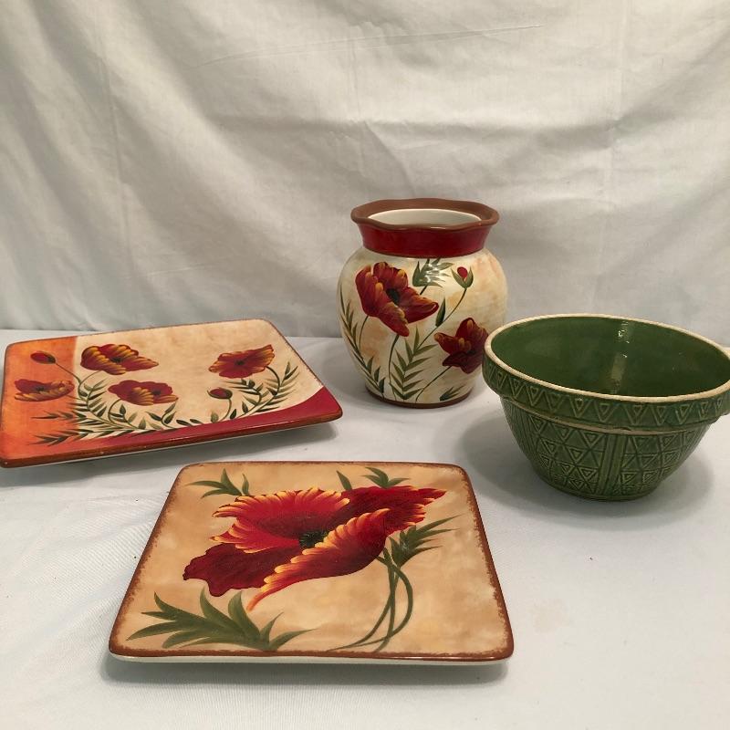 This three piece set from Pier one has beautiful hand painted poppies on earthenware. There is a large plate, smaller plate and a vase. We have added a USA made green ceramic bowl, and lots more useful kitchen items, see images. Please note that the onion keeper has a chip and a crack in the top and one of the garlic keepers appears to have had a break in the handle that has been glued nicely.