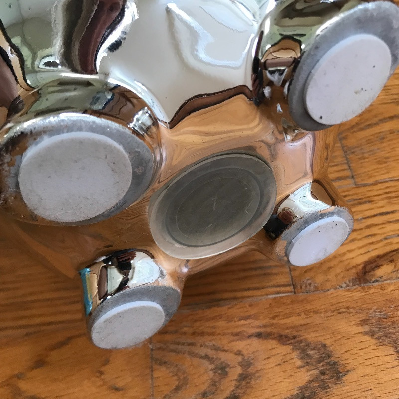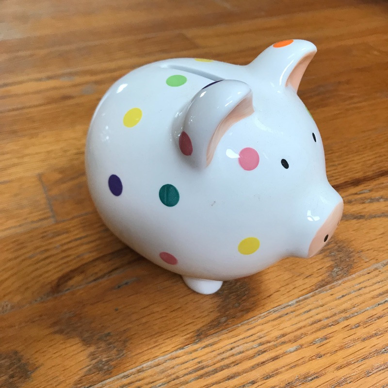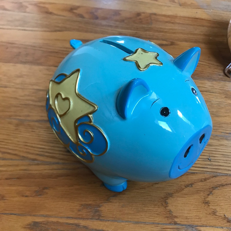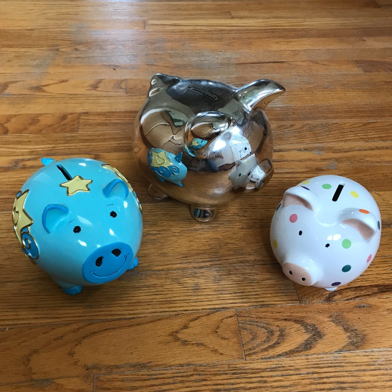 Lot includes three cute piggy banks, one silver, one white with polka-dots, and one in baby blue with yellow stars. Largest is approx. 7” x 6” x 7”. See pics. Local pickup only.