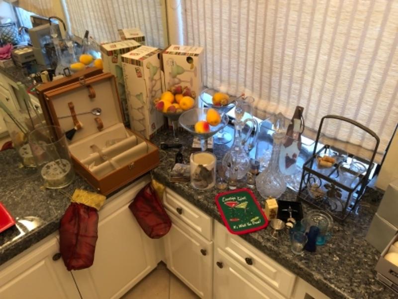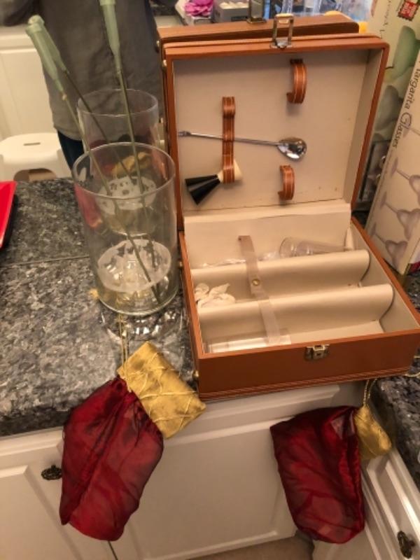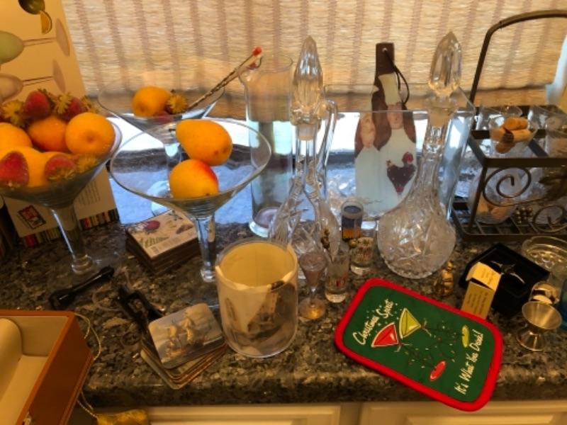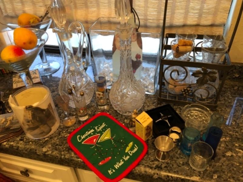 Lot 112. Portable bar, martini glasses, decanters, shot glass coasters, Christmas wine bag, vase--WAS $75““NOW $37.50