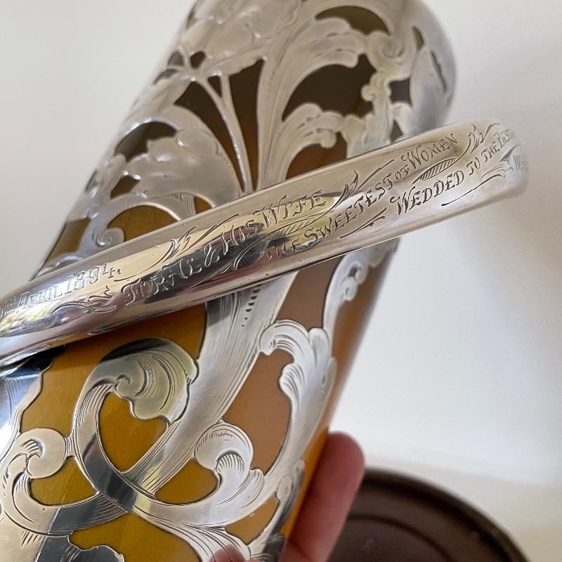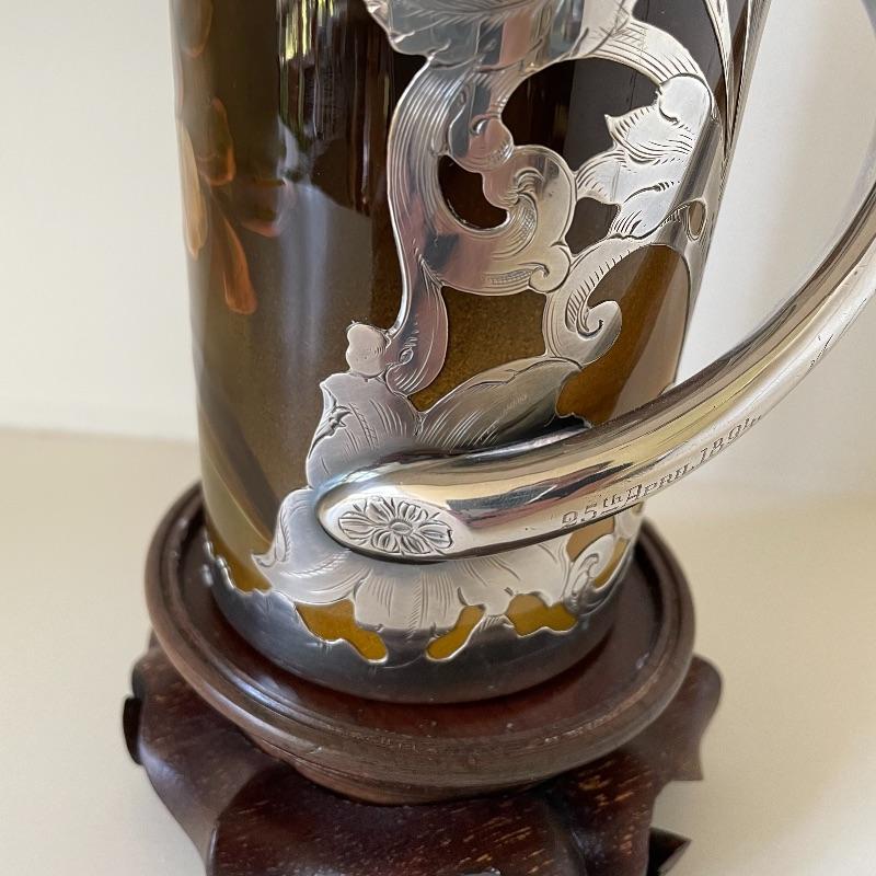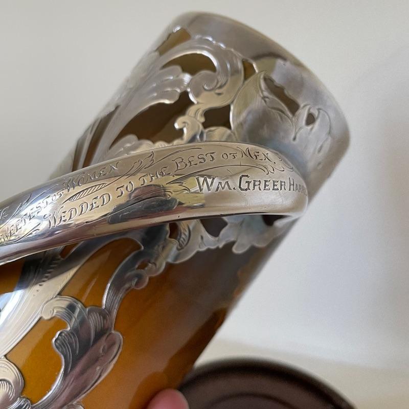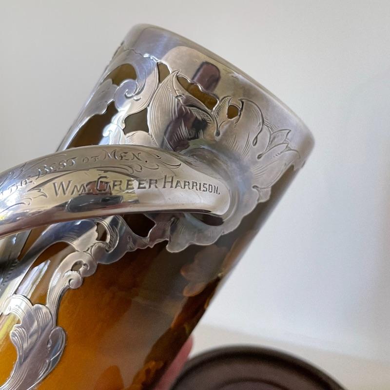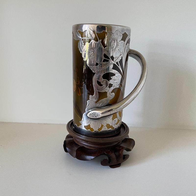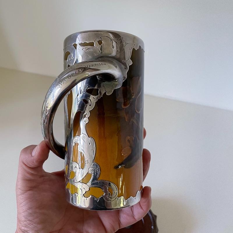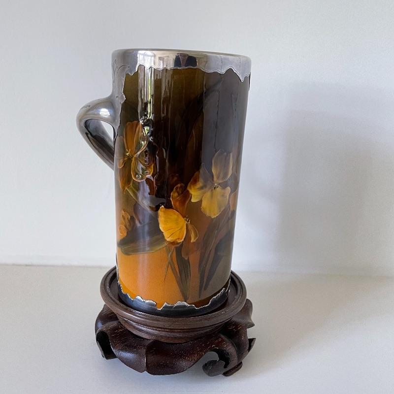 What a gorgeous piece of history. Rookwood floral designed glazed ceramic with Gorham silver overlay. The inscription on the handle reads: “25th April 1894, For Al and his Wife, the Sweetest of Women, Wedded to the Best of Men. Wm Greer Harrison”. This mug stands 3”d x 5.75” and is one classic find. Don’t let this one get away! Wooden stand is included along with a note found in the home. Shipping available.