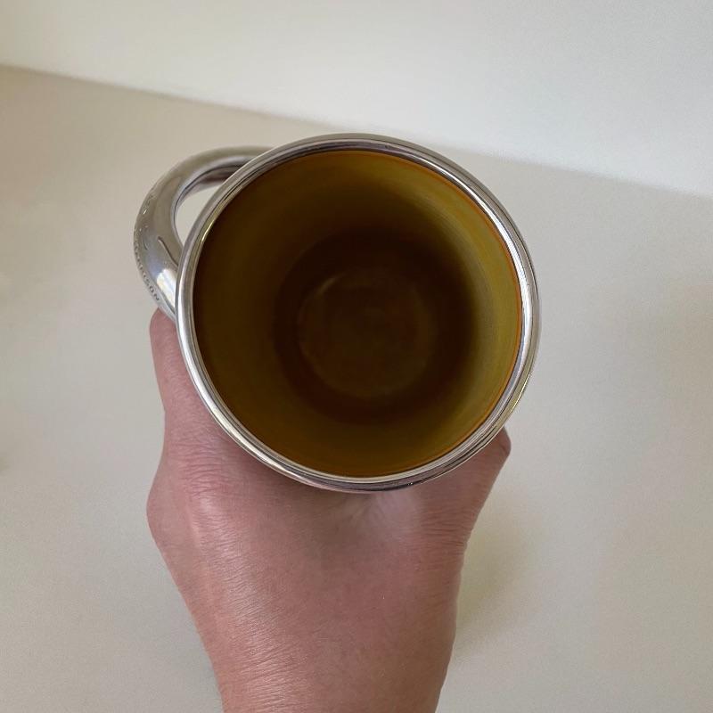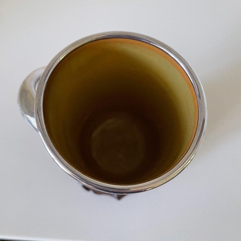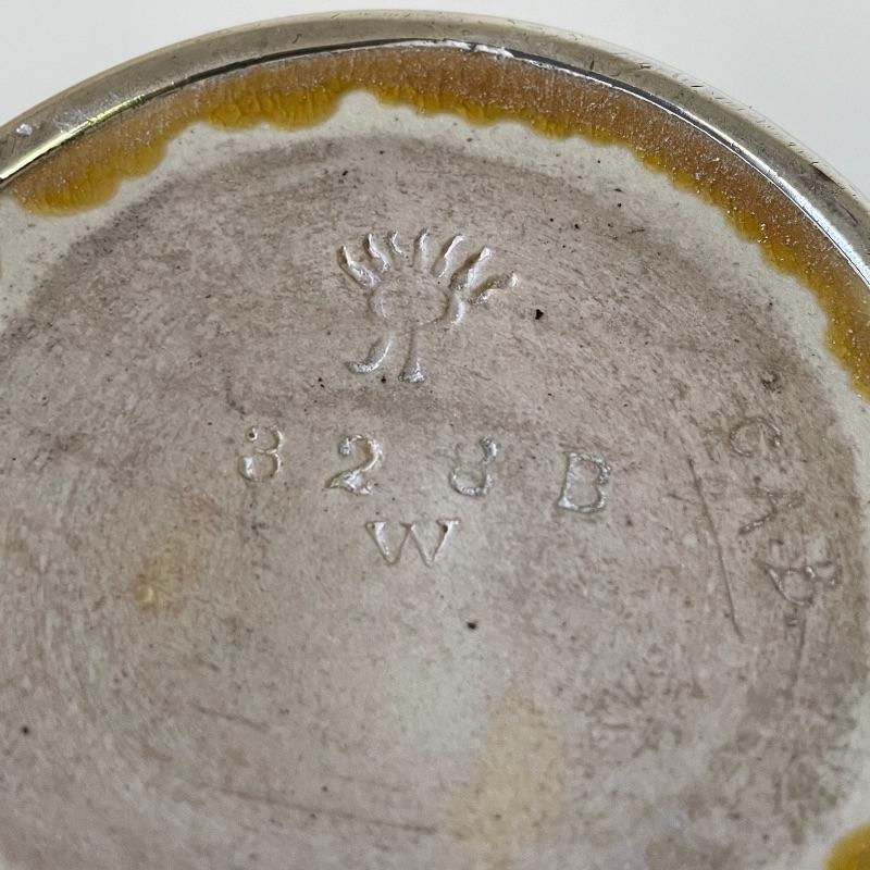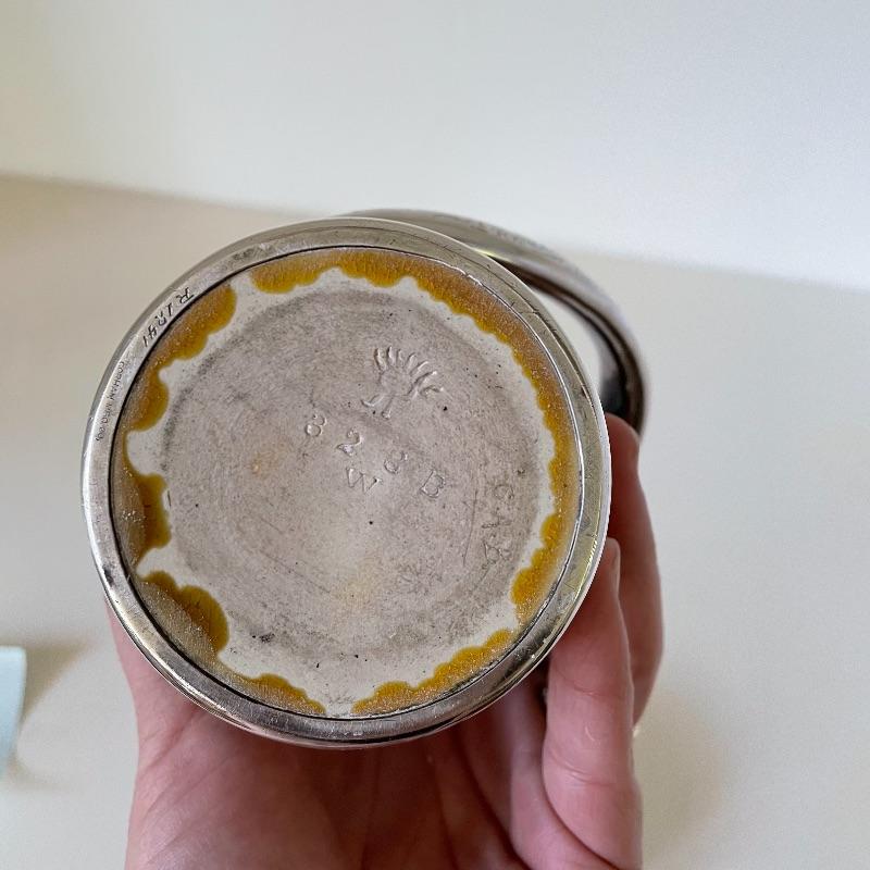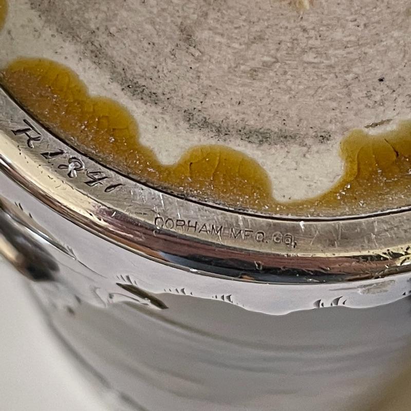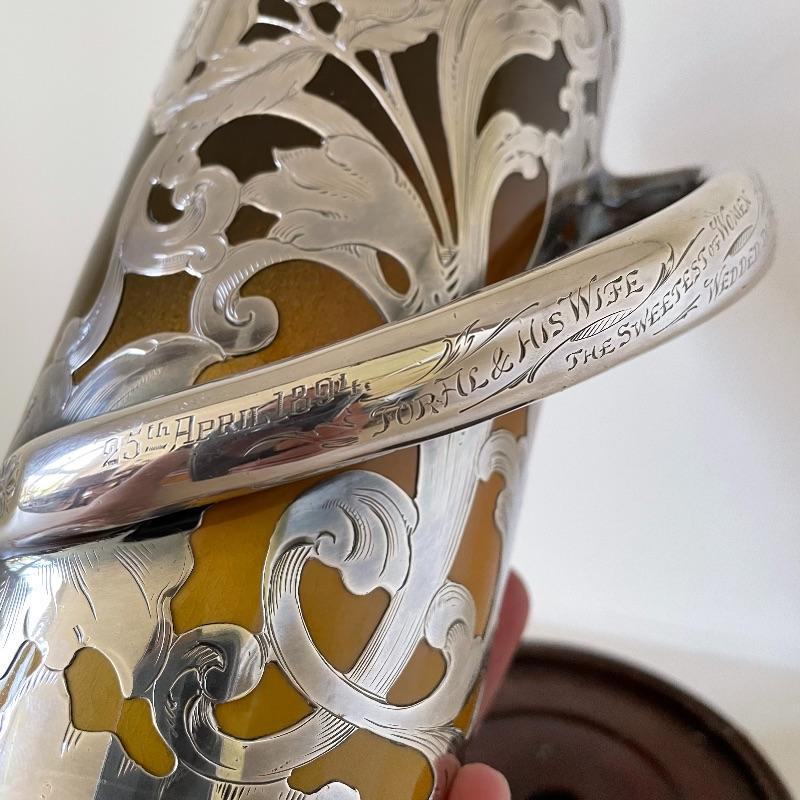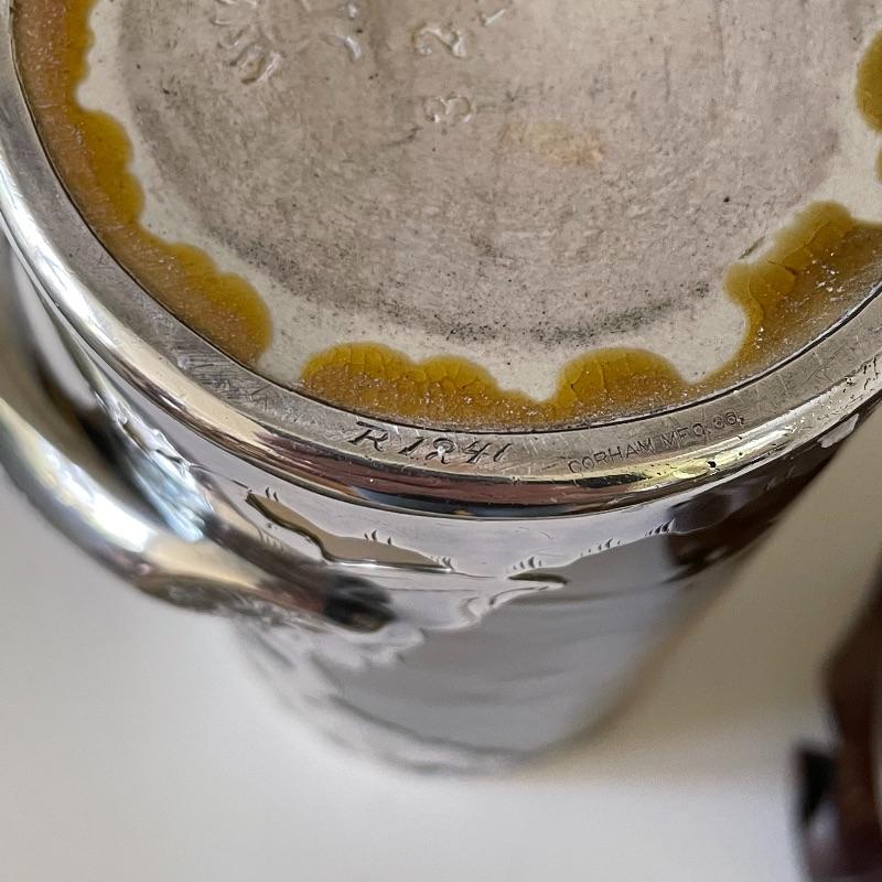 What a gorgeous piece of history. Rookwood floral designed glazed ceramic with Gorham silver overlay. The inscription on the handle reads: “25th April 1894, For Al and his Wife, the Sweetest of Women, Wedded to the Best of Men. Wm Greer Harrison”. This mug stands 3”d x 5.75” and is one classic find. Don’t let this one get away! Wooden stand is included along with a note found in the home. Shipping available.