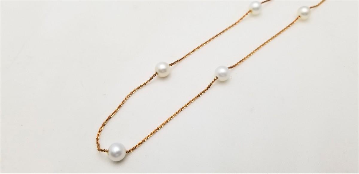 Pretty Rose Gold (14kt) and cultured pearl necklace - about 20" long. Opening bid is 10% above scrap price.