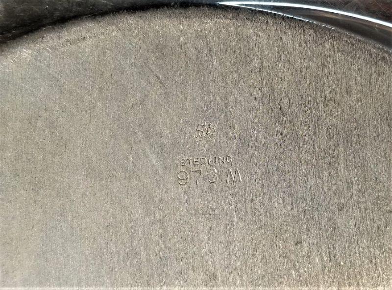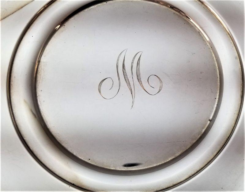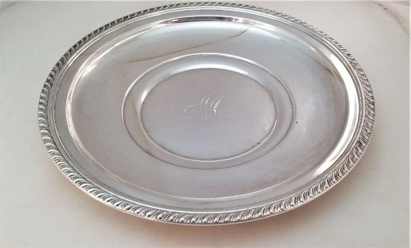 Nice Sterling Silver dish - roped edge - "M" monogram. Measures 10" across. We had this piece weighed - the scrap value was $170.00. Very pretty - could use a bit of a polish, but no "dings" etc. We will not be selling this plate for the scrap value.