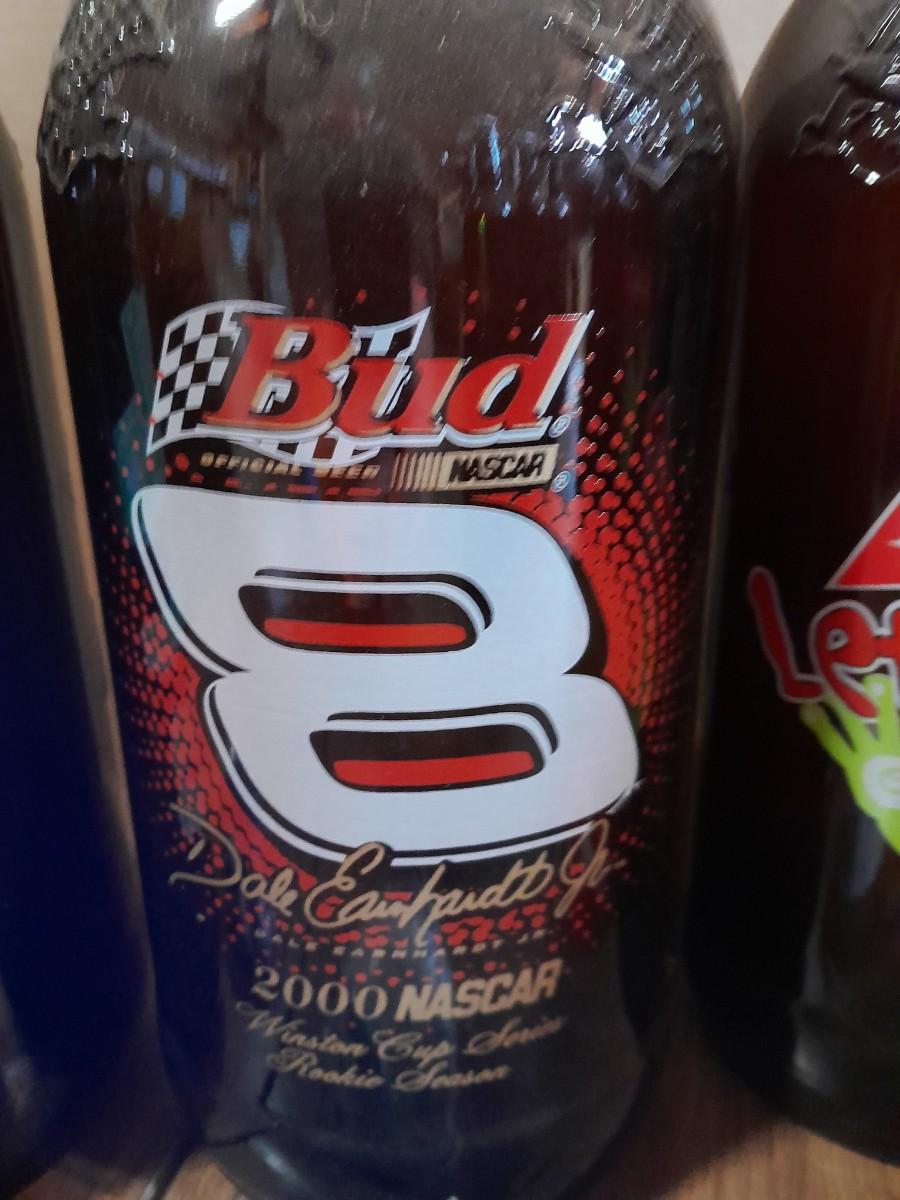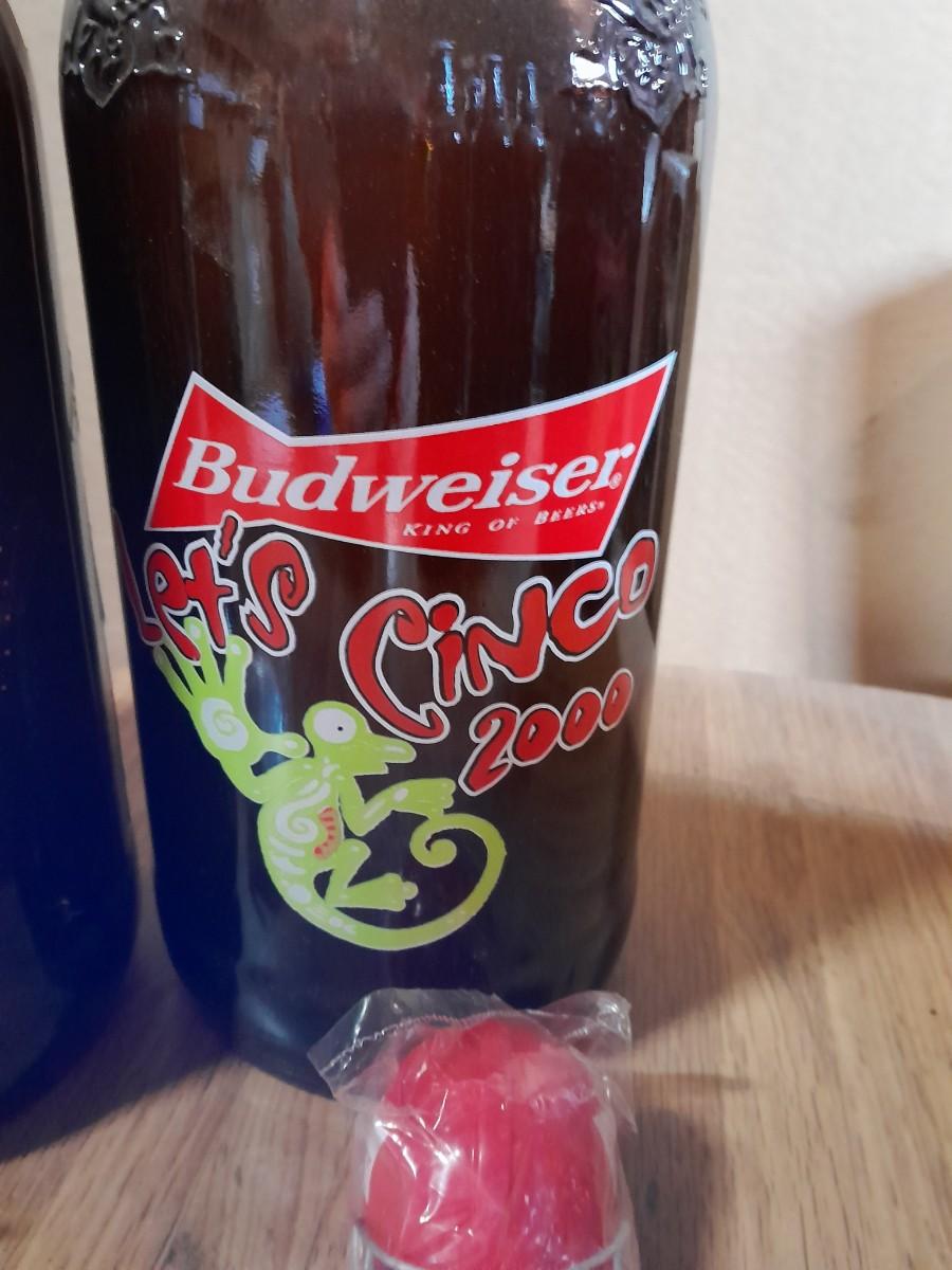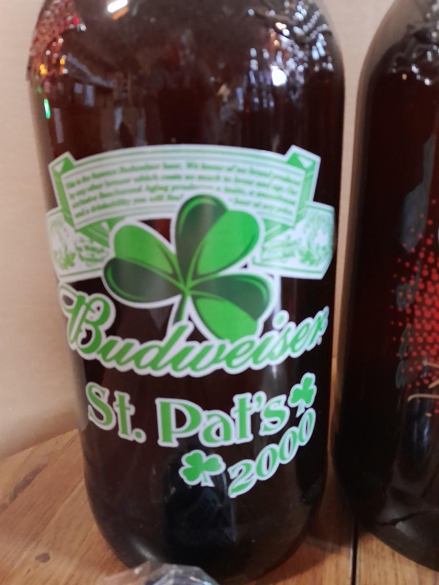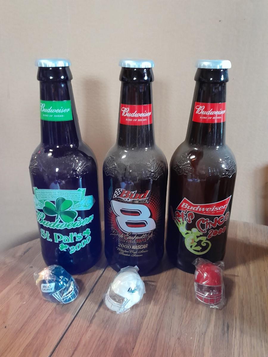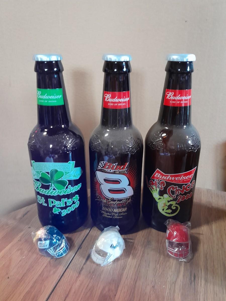 THREE BUDWEISER 15" TALL BOTTLES WITH FOOTBALL HELMETS THE BOTTLES ARE EMPTY
