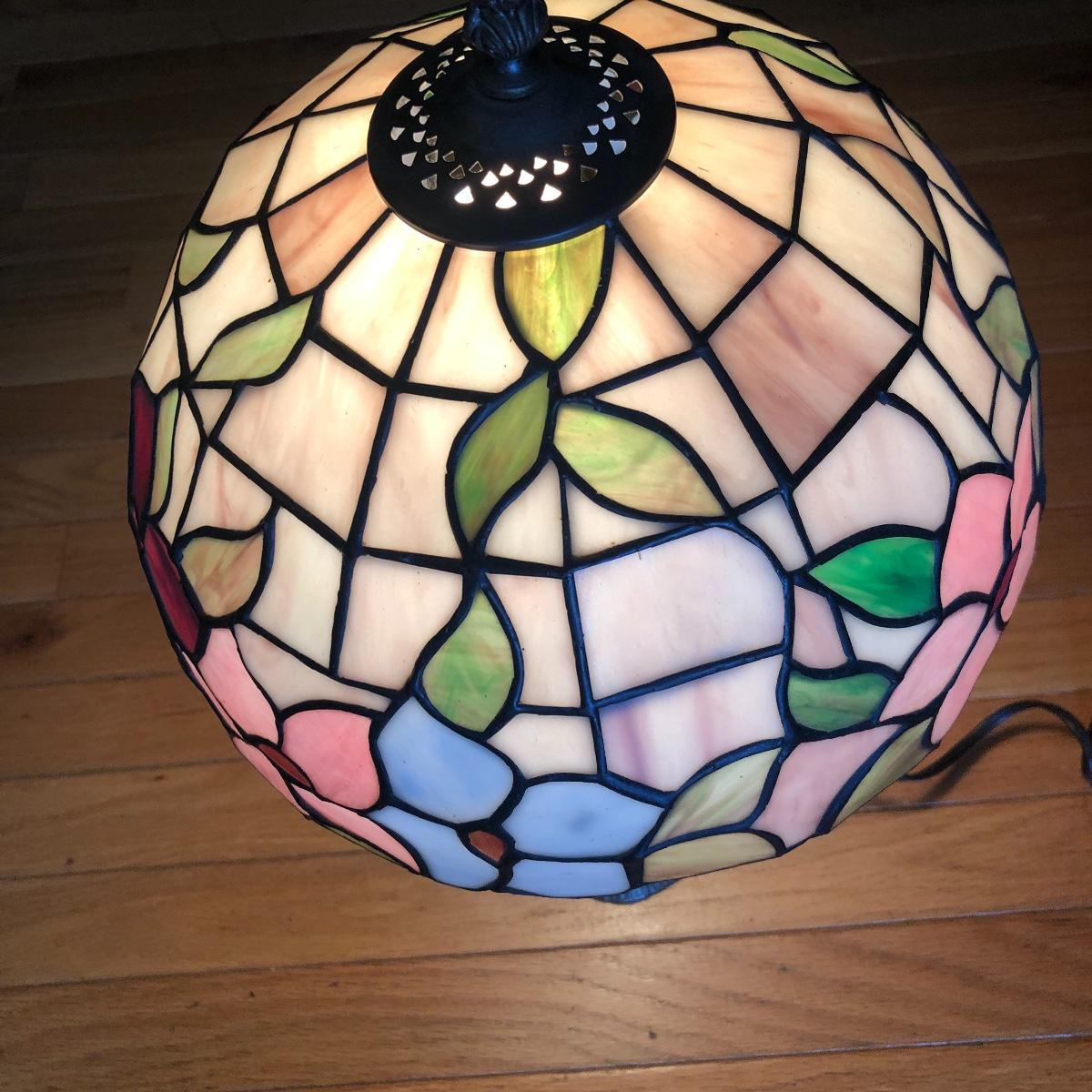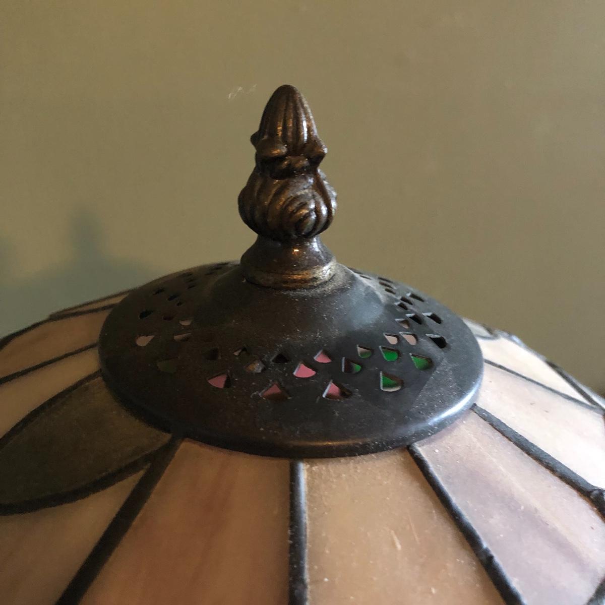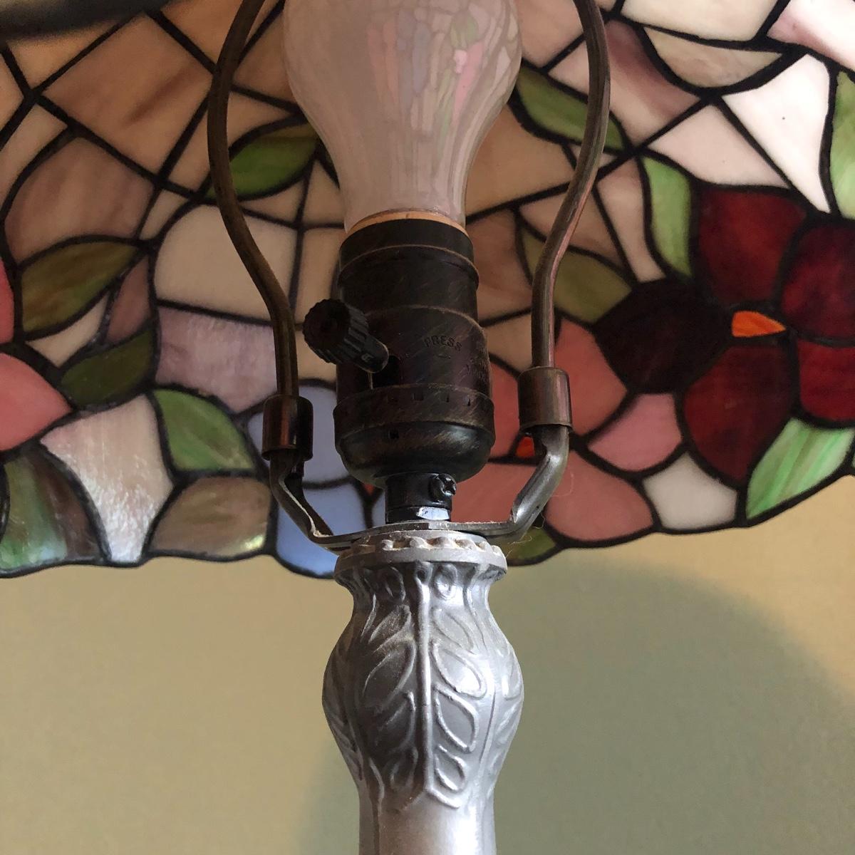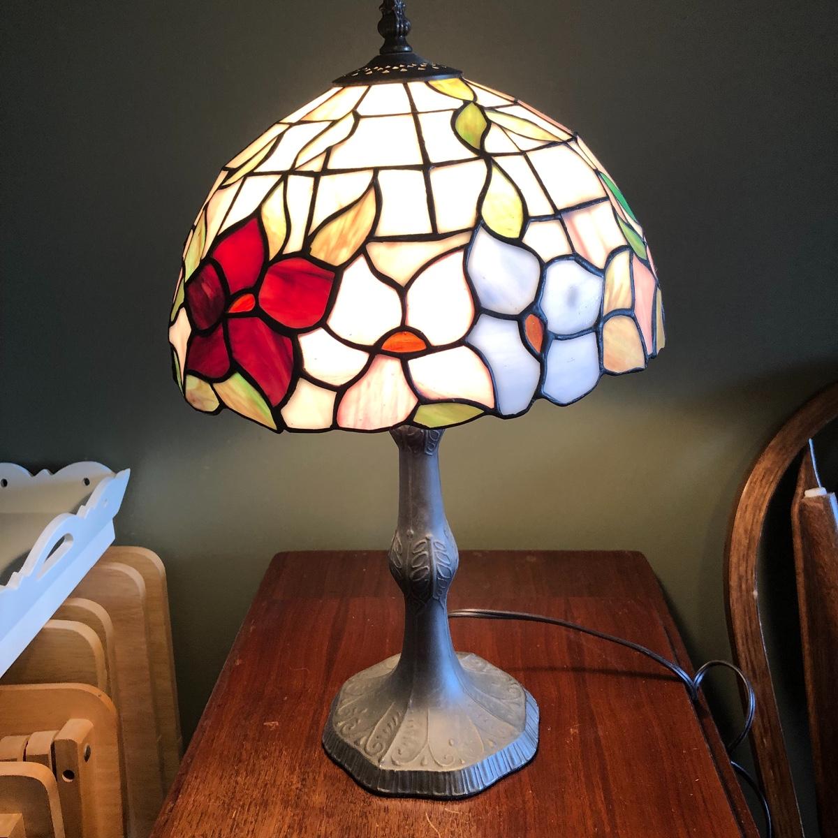 Enjoy the beauty of this Tiffany style lamp. It operates when plugged in, is approximately 19.5” tall and the shade is 12” wide. The base of the lamp is metal and shade seems to be made of a resin material. Shipping Available.