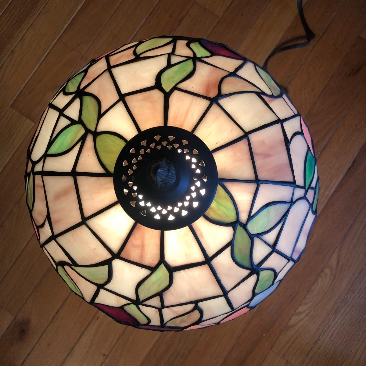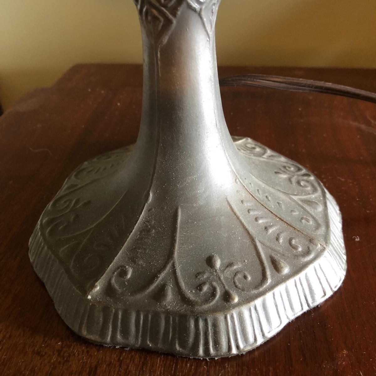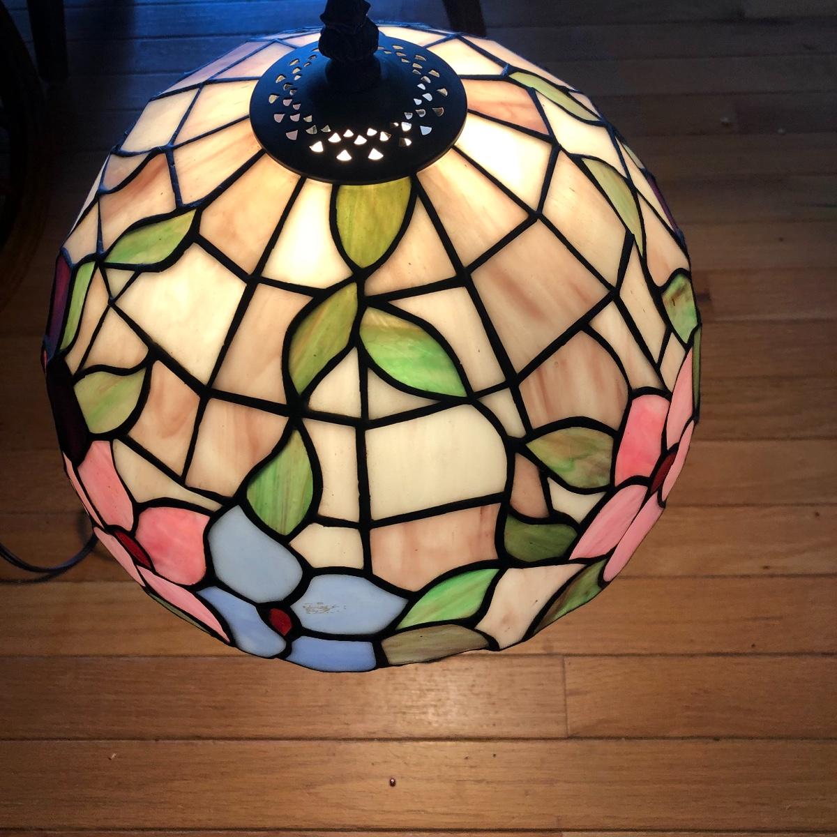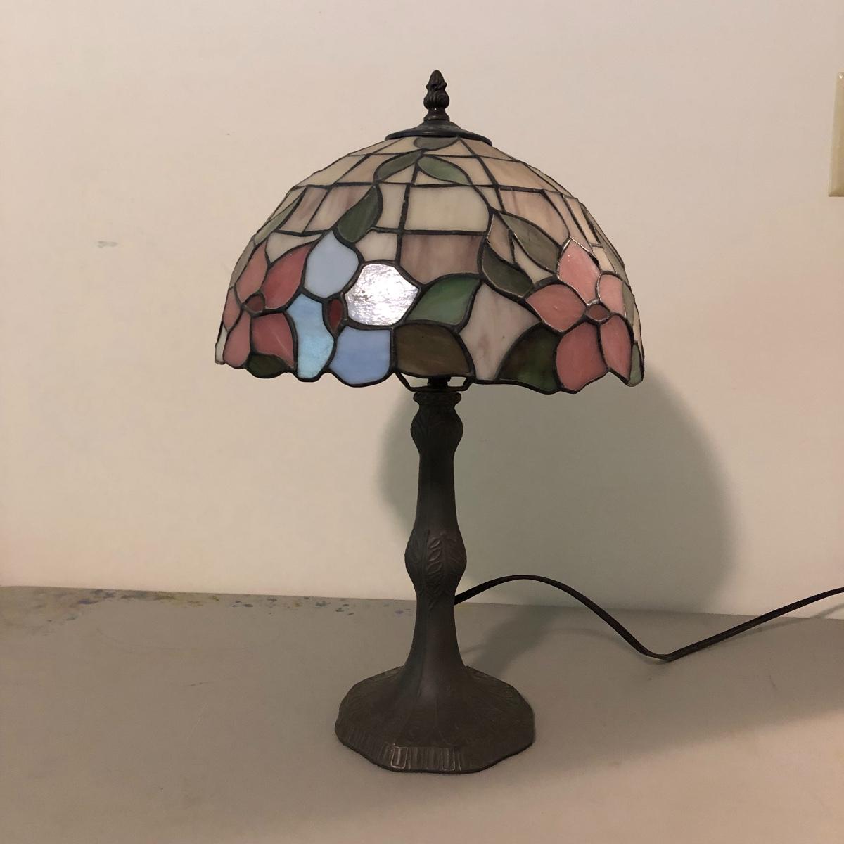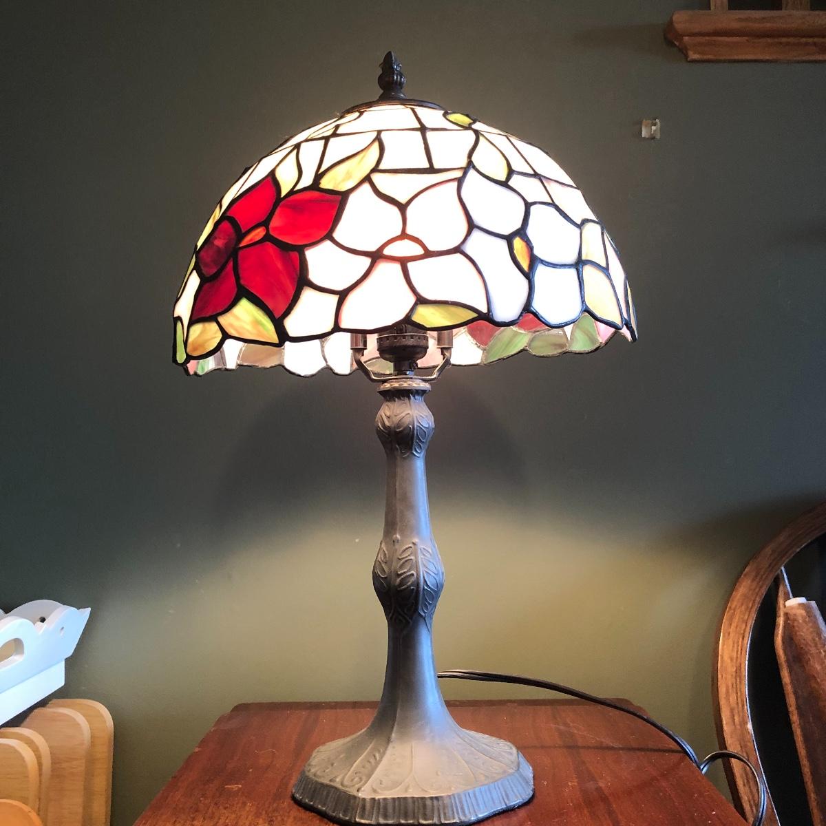 Enjoy the beauty of this Tiffany style lamp. It operates when plugged in, is approximately 19.5” tall and the shade is 12” wide. The base of the lamp is metal and shade seems to be made of a resin material. Shipping Available.