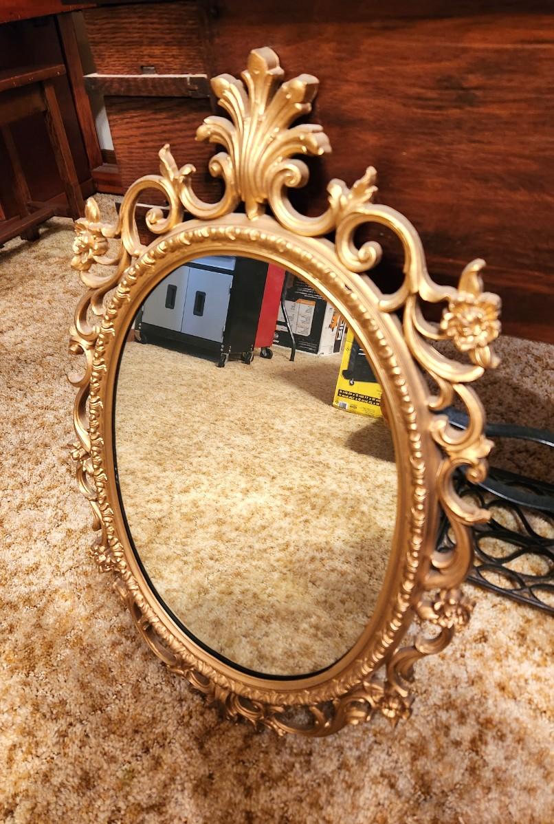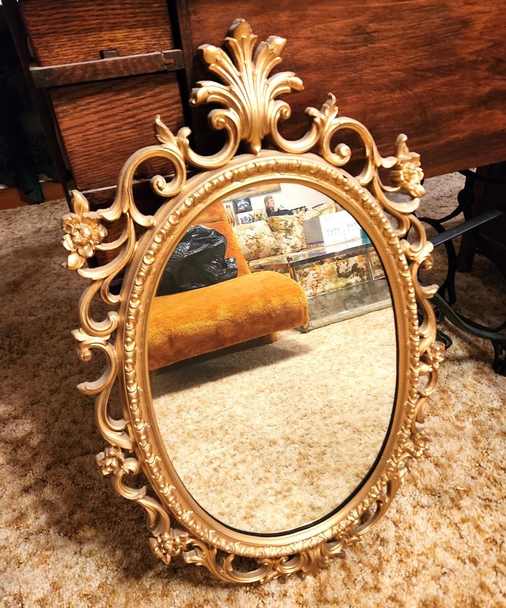 Fancy Vintage Hollywood Regency- style oval wall mirror. 28" tall, 18" across. Good condition - a very pretty mirror.