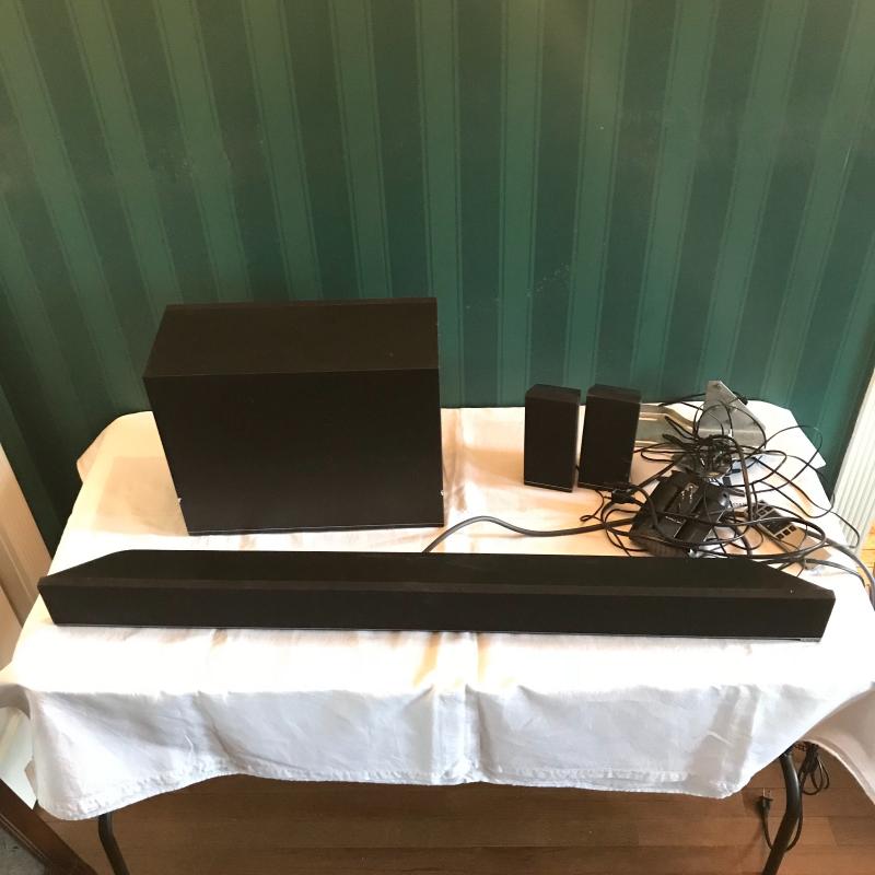 Sound bar, subwoofer, speakers, mounts and remote, as well as surge protector outlet. Lot available for local pick up only in Flat Rock, NC.
