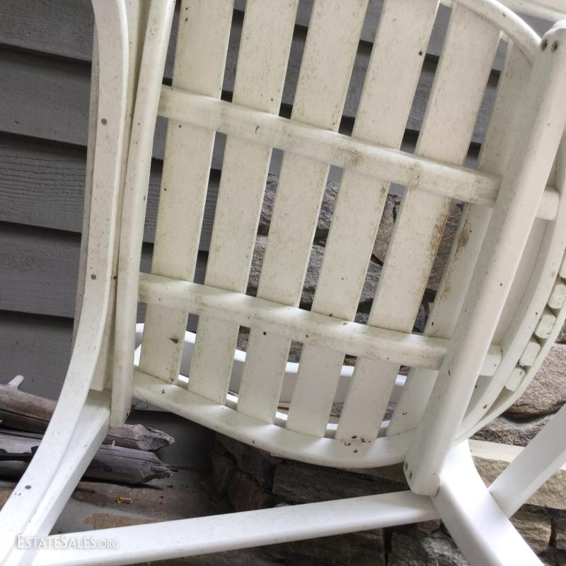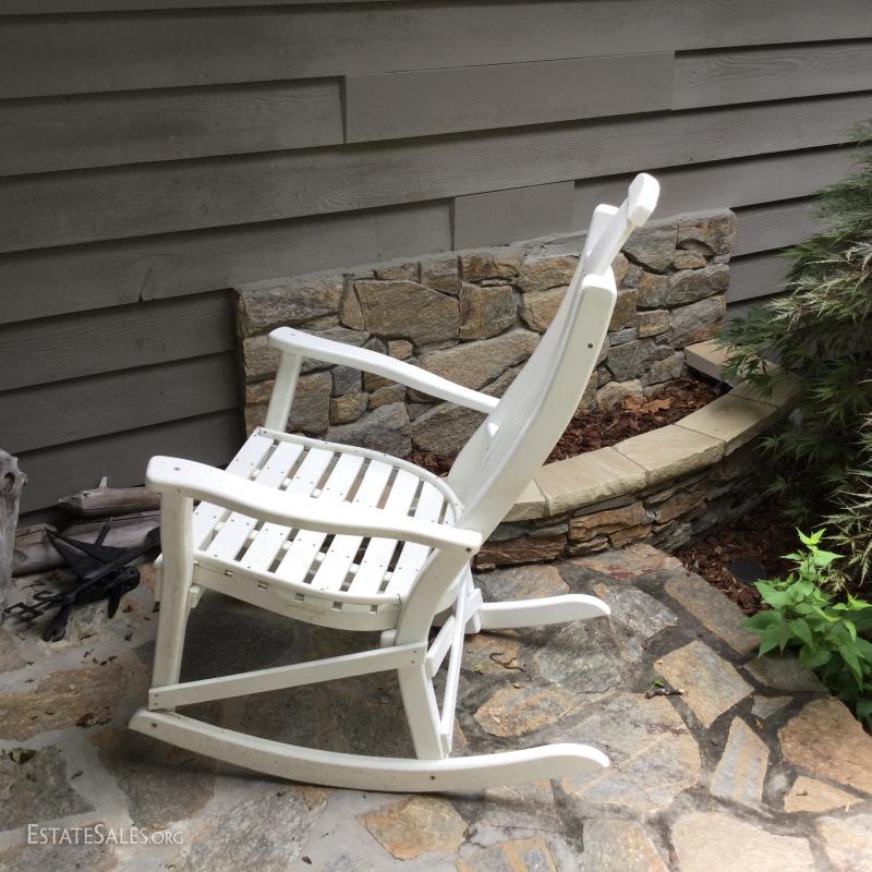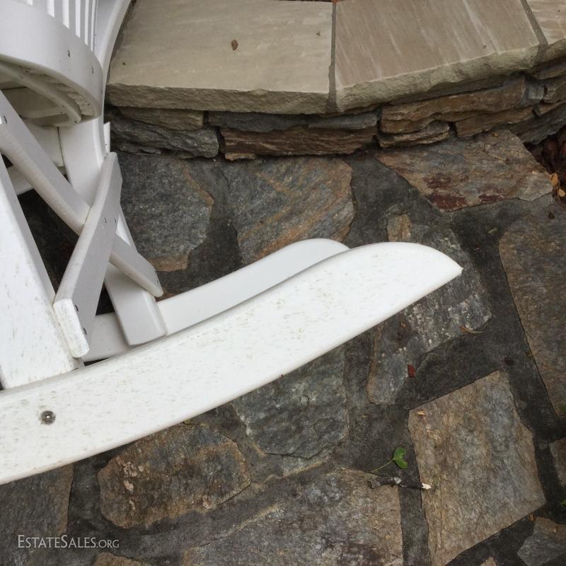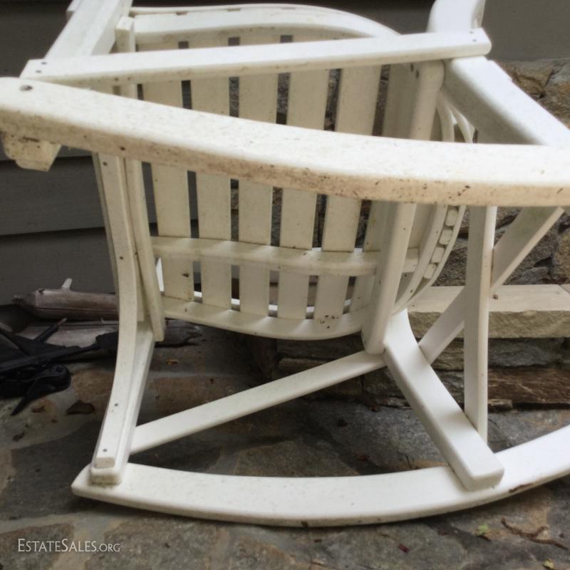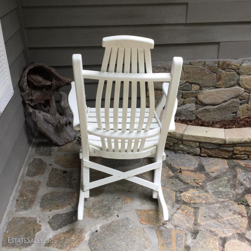 Gorgeous lines on this heavy white rocking chair. Needs a bit of touch up paint since it's been outside. Otherwise in great condition. 32"l x 27"w x 43"h.