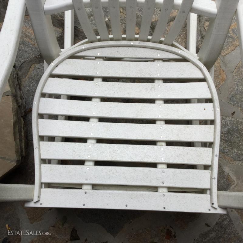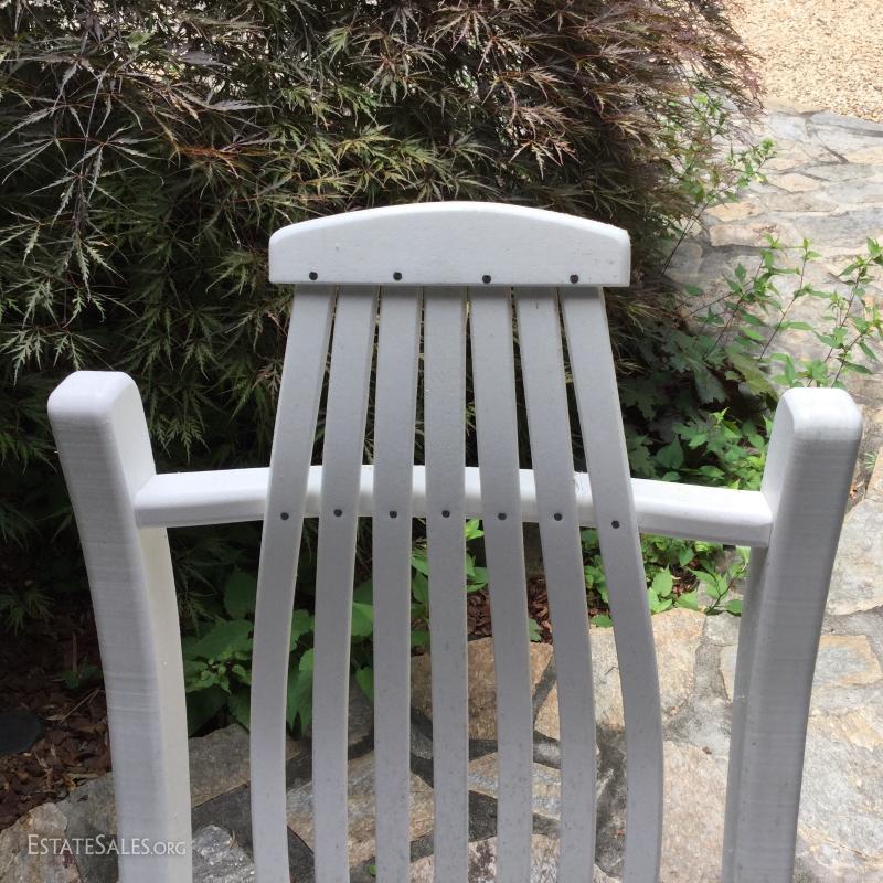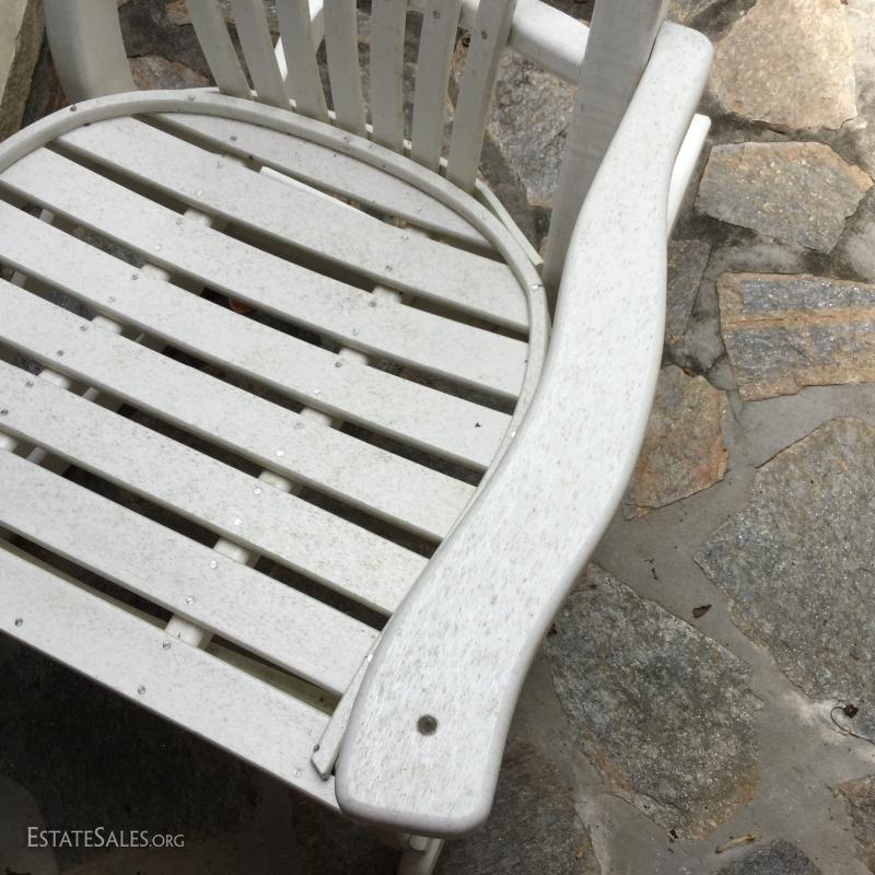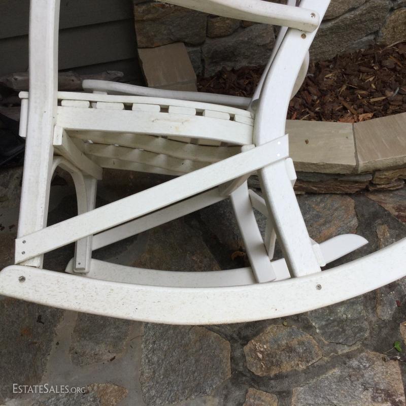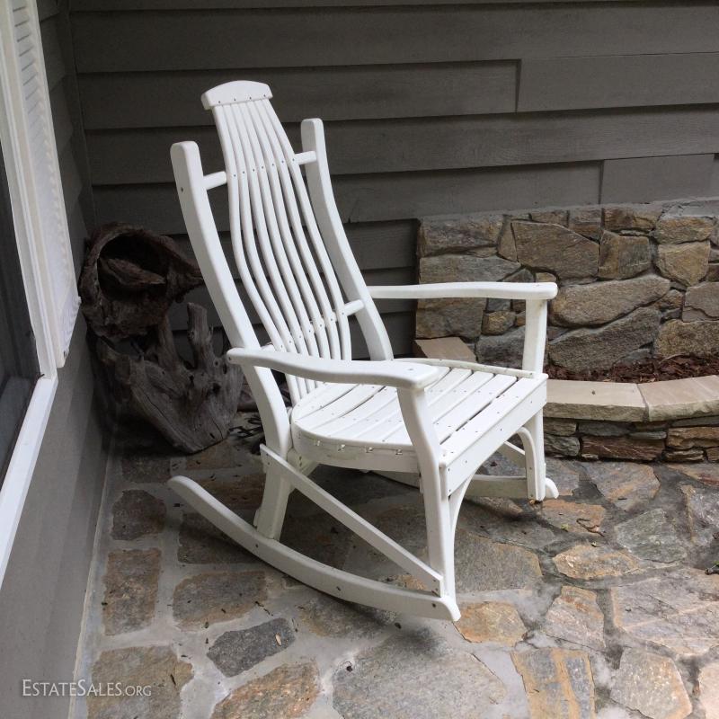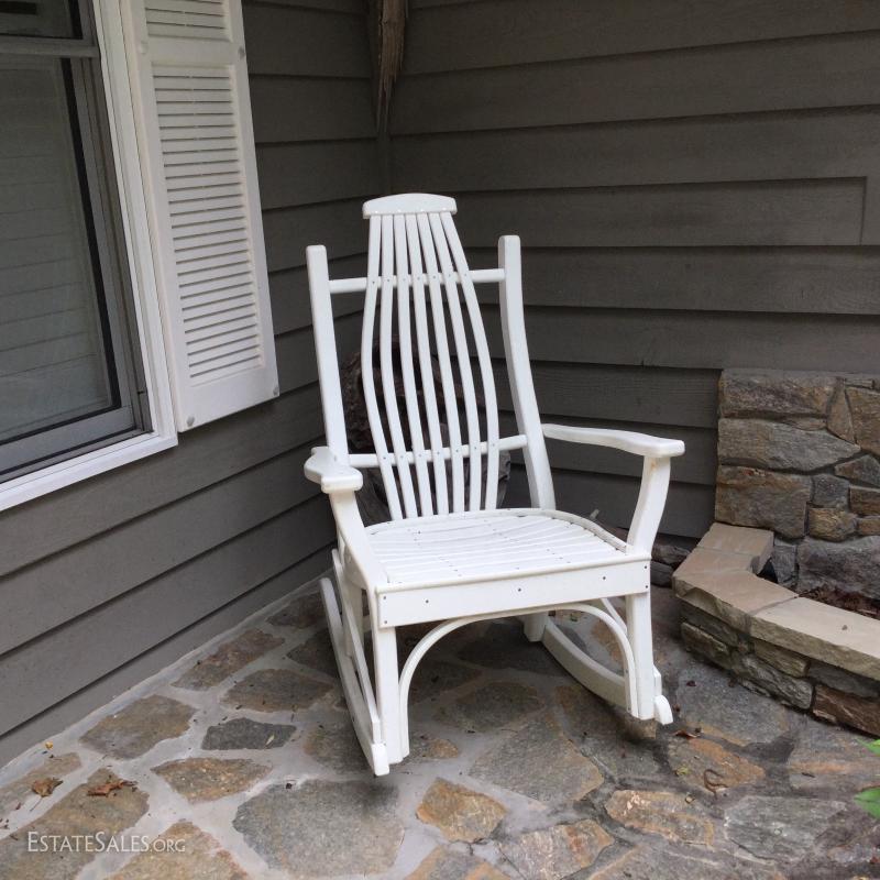 Gorgeous lines on this heavy white rocking chair. Needs a bit of touch up paint since it's been outside. Otherwise in great condition. 32"l x 27"w x 43"h.