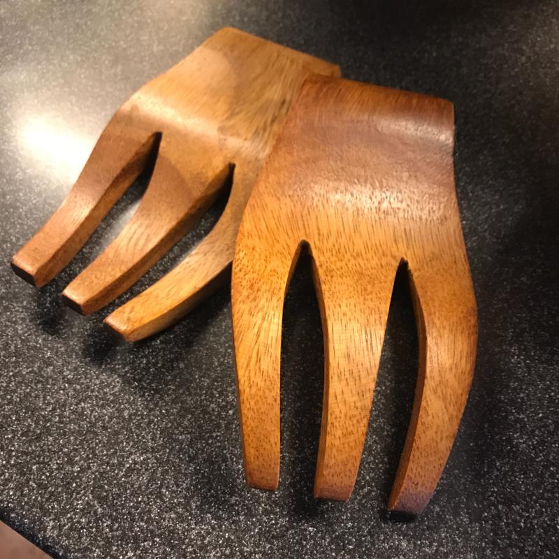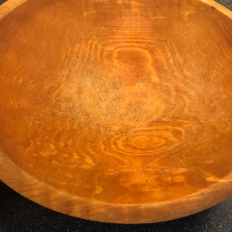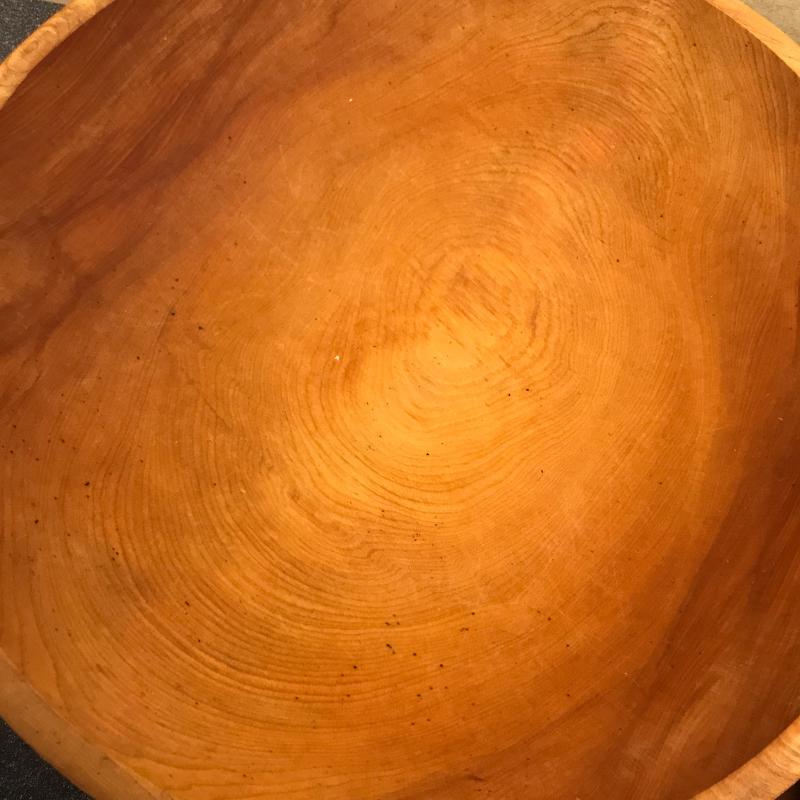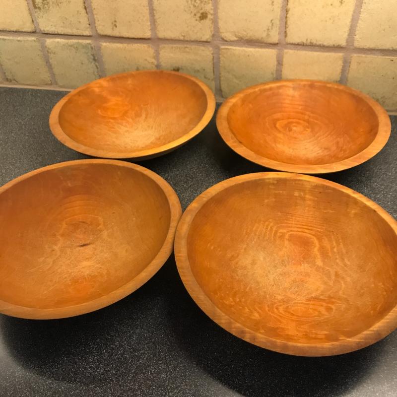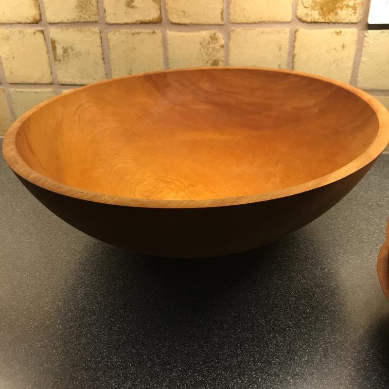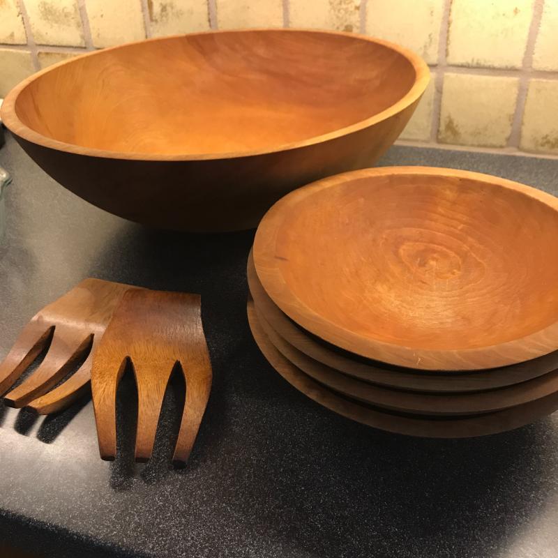 Large wooden bowl (16.5”d x 5.5”h) and four smaller matching salad bowls (9”d). The bowls have some wear from use. Lot includes pair of wooden salad tongs. Shipping or local pick up in Asheville. Large Bowl may be costly to ship due to dimensions. Please call your local UPS store to get an estimate prior to bidding.