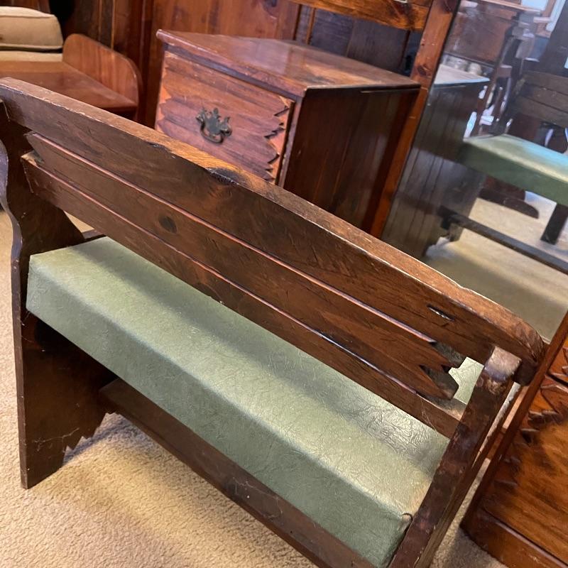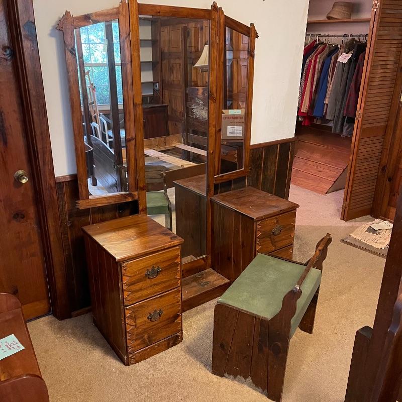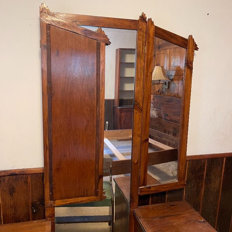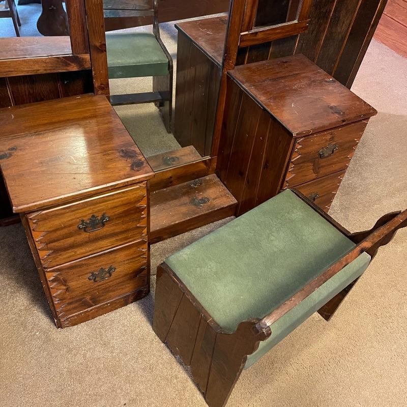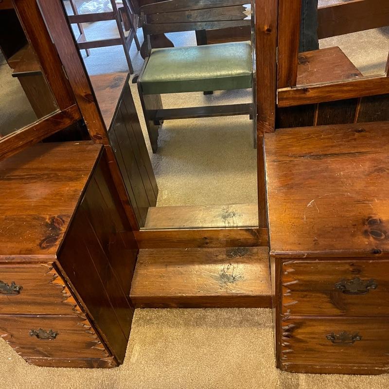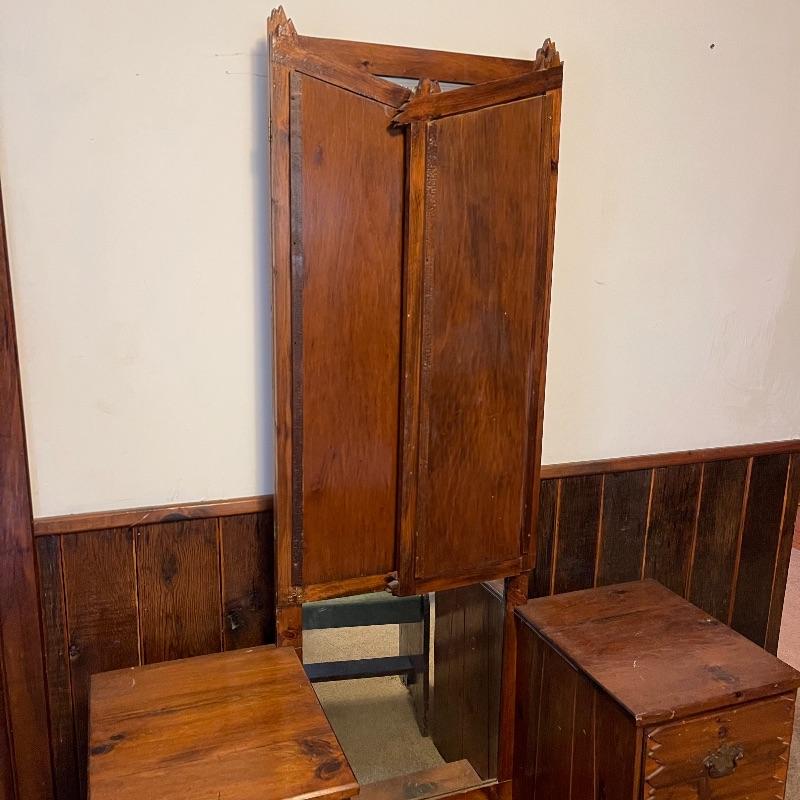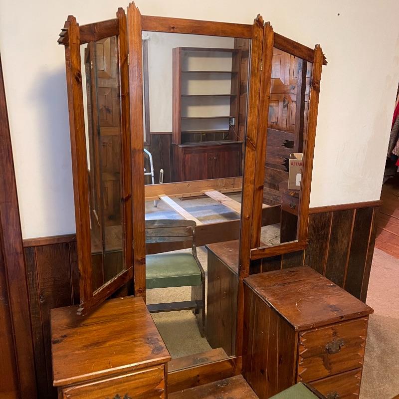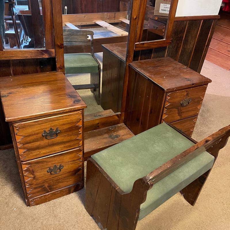 Rustic handcrafted wooden vanity and small bench. This wooden vanity has a tall center mirror, just over 62 inches tall, and two smaller mirrors on either side that fold in. There are two drawers on both sides, four drawers total. From one side to the other, it is just over 49 inches. This vanity is a full unit- mirrors and drawers are attached. The center below the large mirror has just a small wooden step, most likely for leaning on when looking closely in the mirror. The gap where the small step is, is 19.5 inches. The small seat is also wooden and built to match, with the addition of a green faux leather cushion. It is just about 2 feet long and 2 feet 2 inches tall. The hand built design of these pieces match the bed frame and side table in Lot 115, please look at that lot as well if interested in a full set of matching furniture.