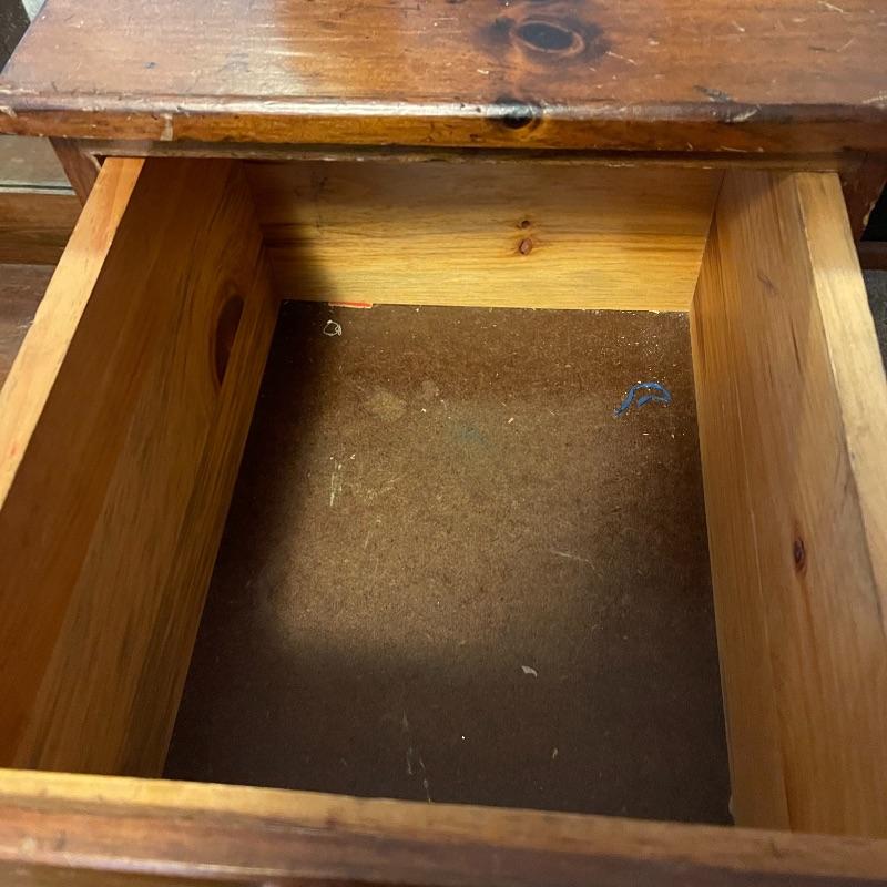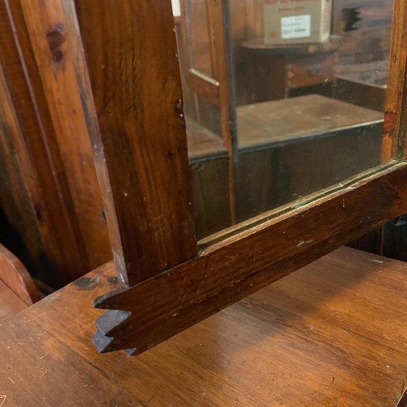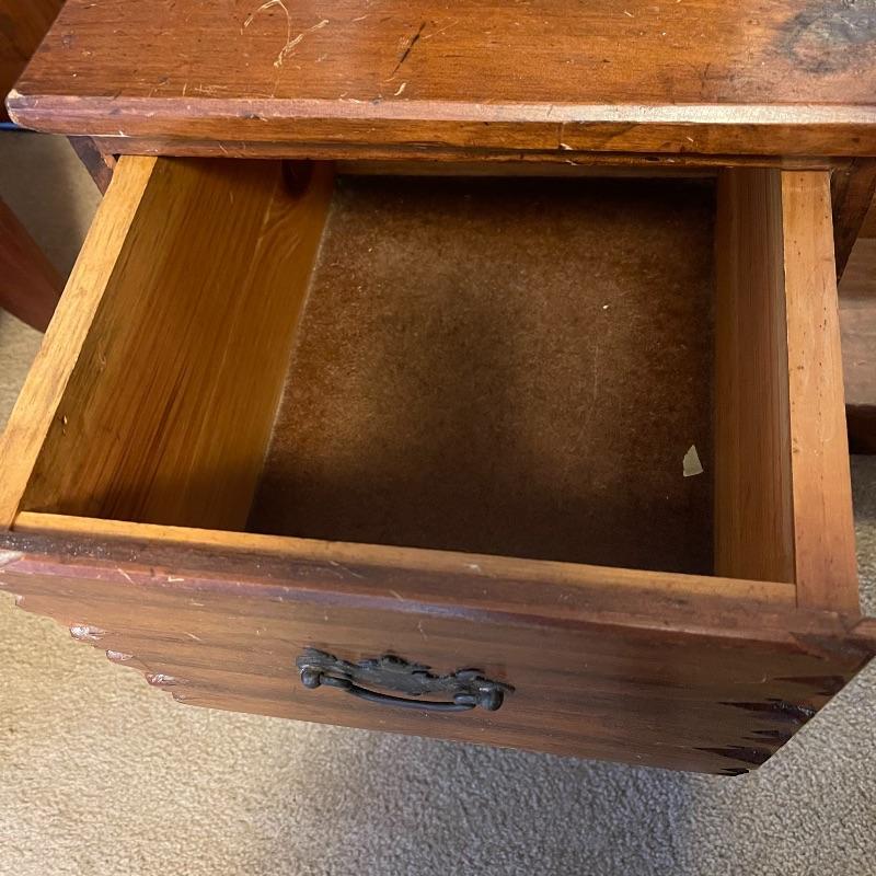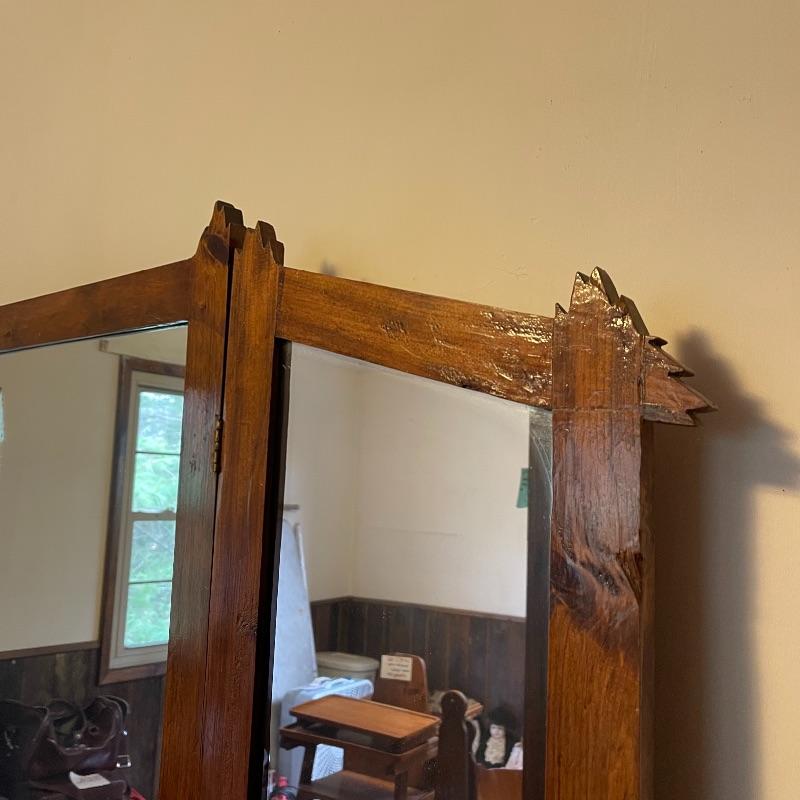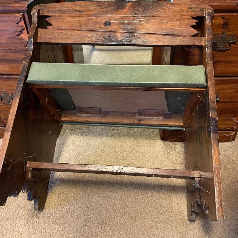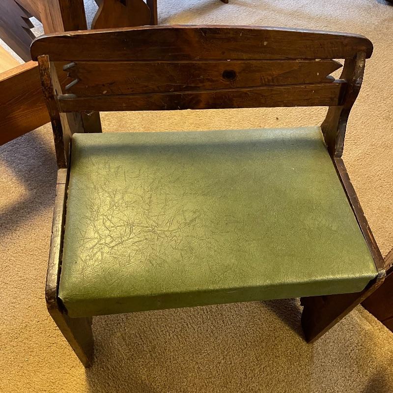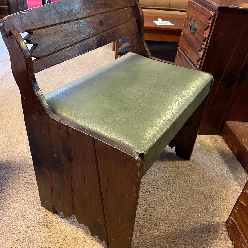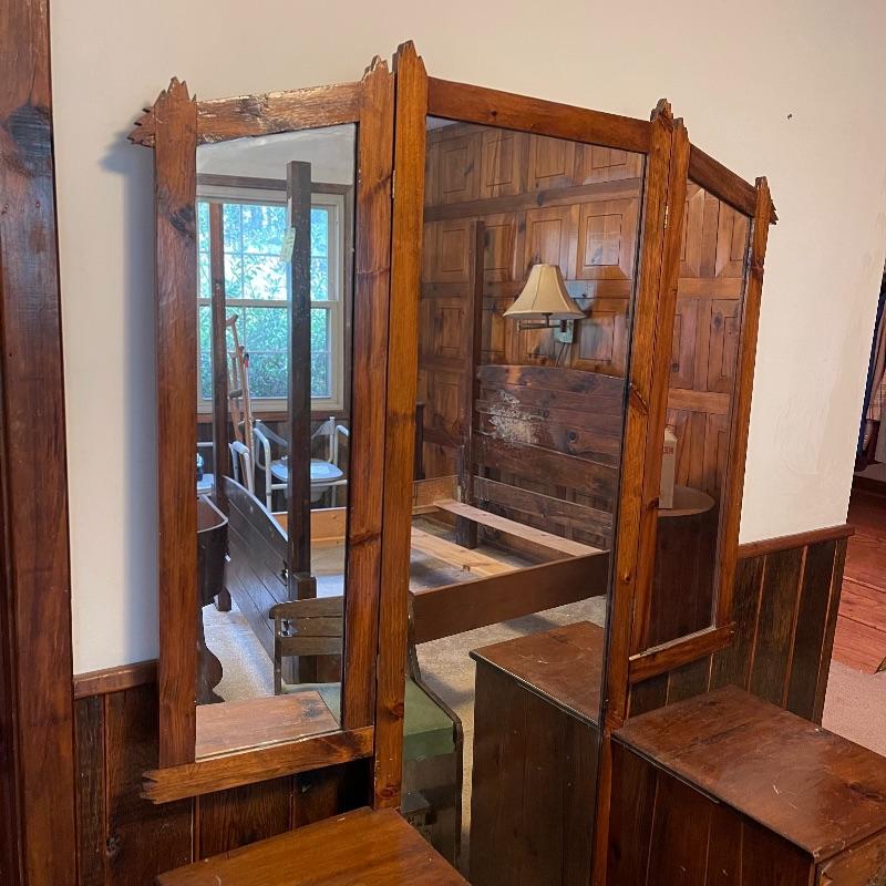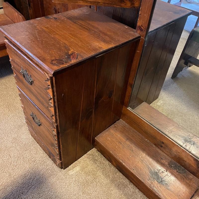 Rustic handcrafted wooden vanity and small bench. This wooden vanity has a tall center mirror, just over 62 inches tall, and two smaller mirrors on either side that fold in. There are two drawers on both sides, four drawers total. From one side to the other, it is just over 49 inches. This vanity is a full unit- mirrors and drawers are attached. The center below the large mirror has just a small wooden step, most likely for leaning on when looking closely in the mirror. The gap where the small step is, is 19.5 inches. The small seat is also wooden and built to match, with the addition of a green faux leather cushion. It is just about 2 feet long and 2 feet 2 inches tall. The hand built design of these pieces match the bed frame and side table in Lot 115, please look at that lot as well if interested in a full set of matching furniture.