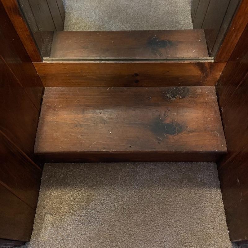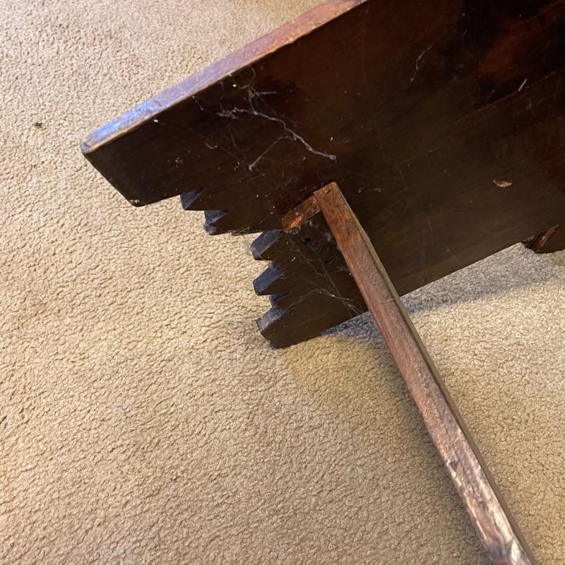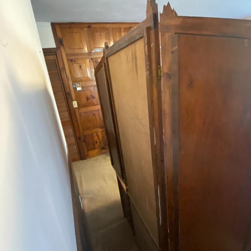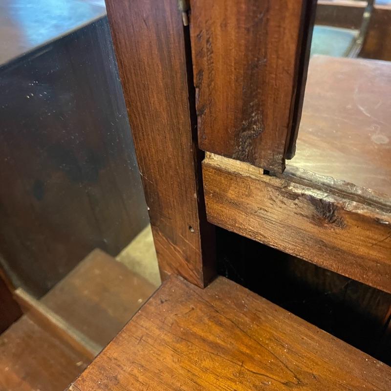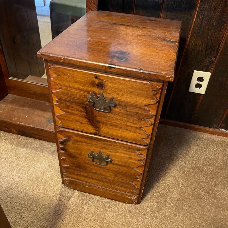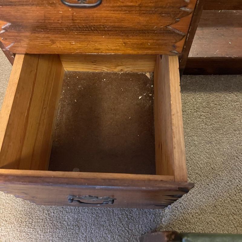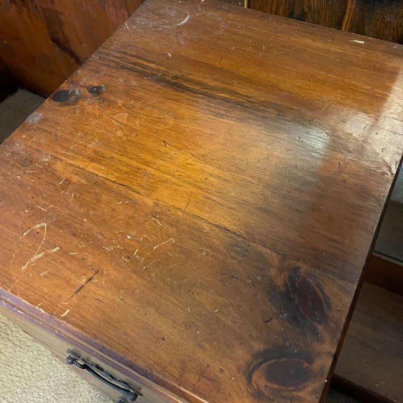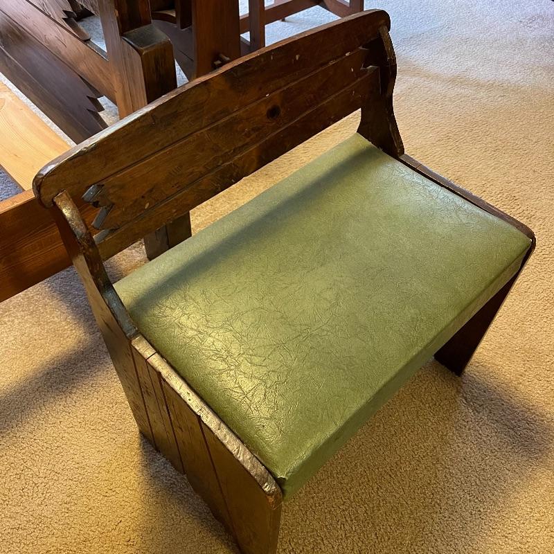 Rustic handcrafted wooden vanity and small bench. This wooden vanity has a tall center mirror, just over 62 inches tall, and two smaller mirrors on either side that fold in. There are two drawers on both sides, four drawers total. From one side to the other, it is just over 49 inches. This vanity is a full unit- mirrors and drawers are attached. The center below the large mirror has just a small wooden step, most likely for leaning on when looking closely in the mirror. The gap where the small step is, is 19.5 inches. The small seat is also wooden and built to match, with the addition of a green faux leather cushion. It is just about 2 feet long and 2 feet 2 inches tall. The hand built design of these pieces match the bed frame and side table in Lot 115, please look at that lot as well if interested in a full set of matching furniture.