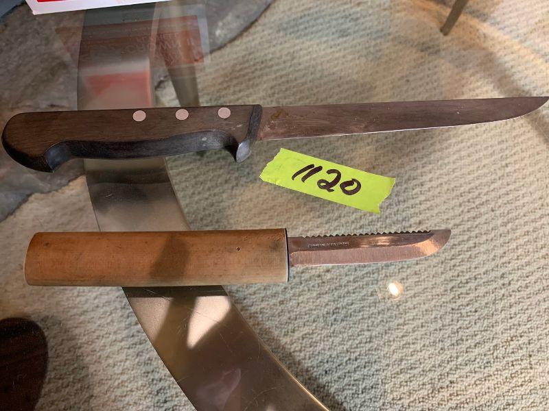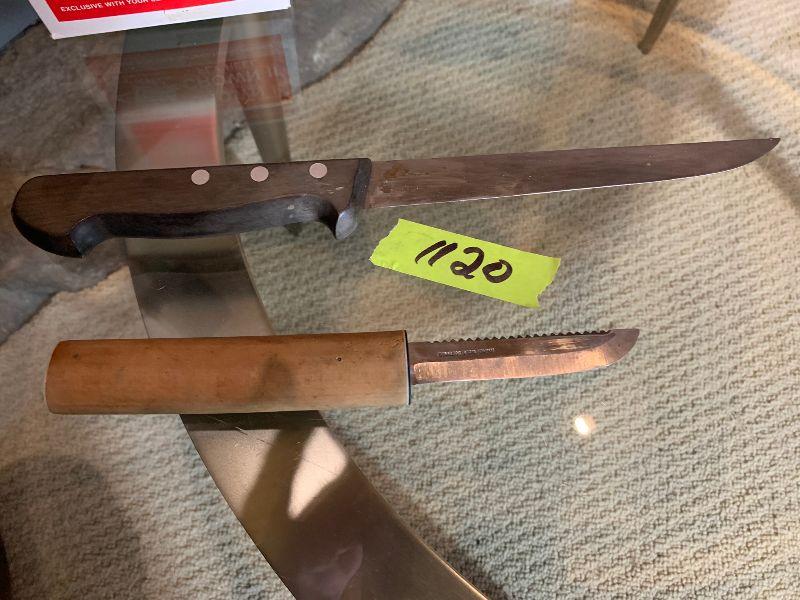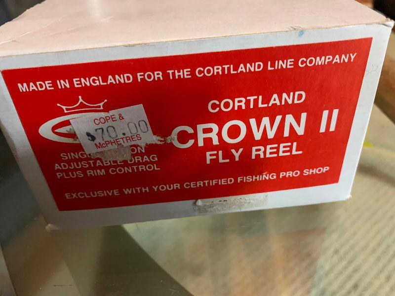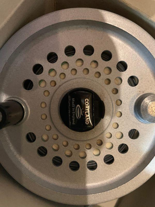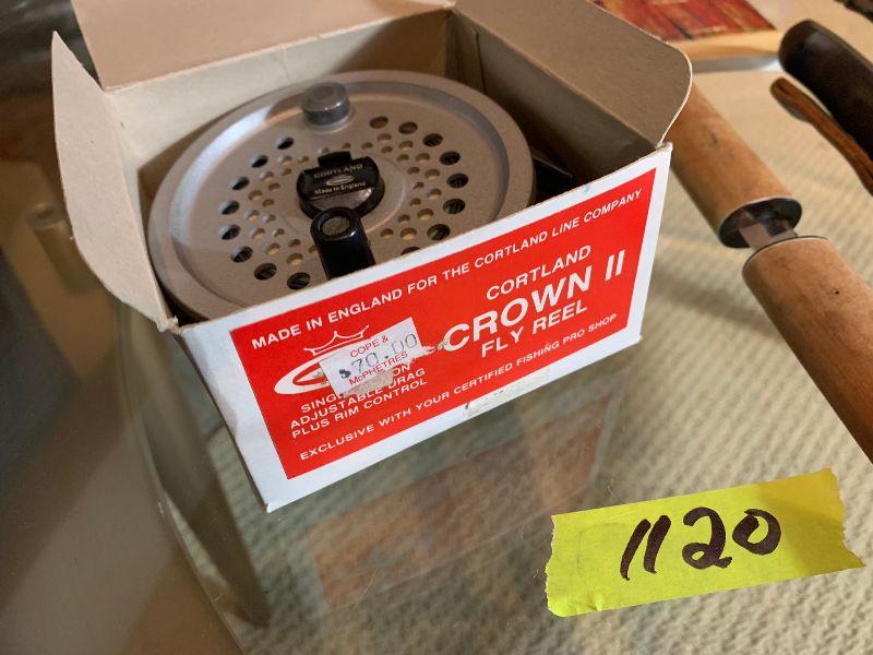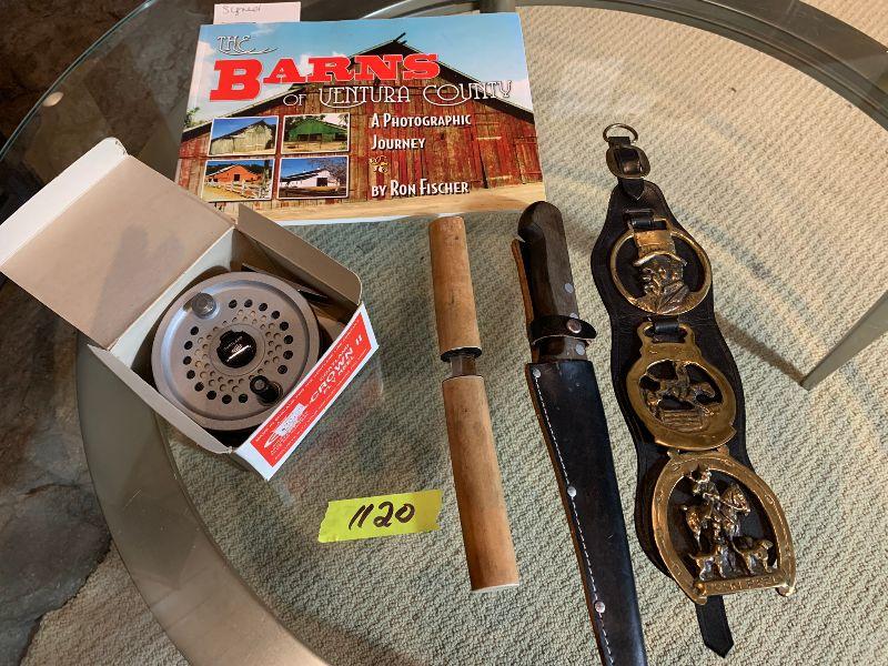 Floating fish knife 3 1/4 blade, Cortland Crown II Fly Reel Originally $70, Giesser Messer Knife with Sheath 7" Blade, John Peel Brass Hanging and Book - The Barns by Ron Fischer signed by Artist