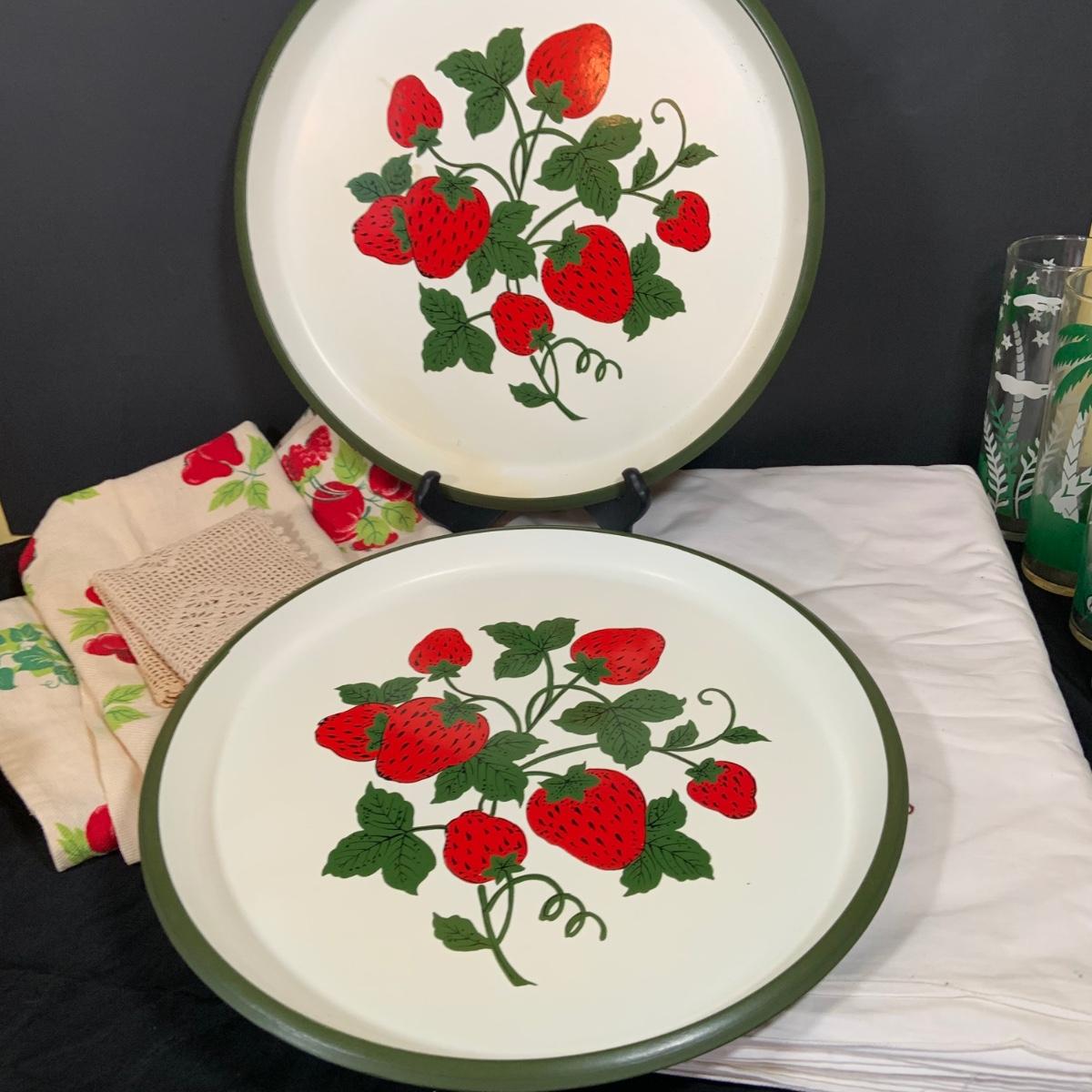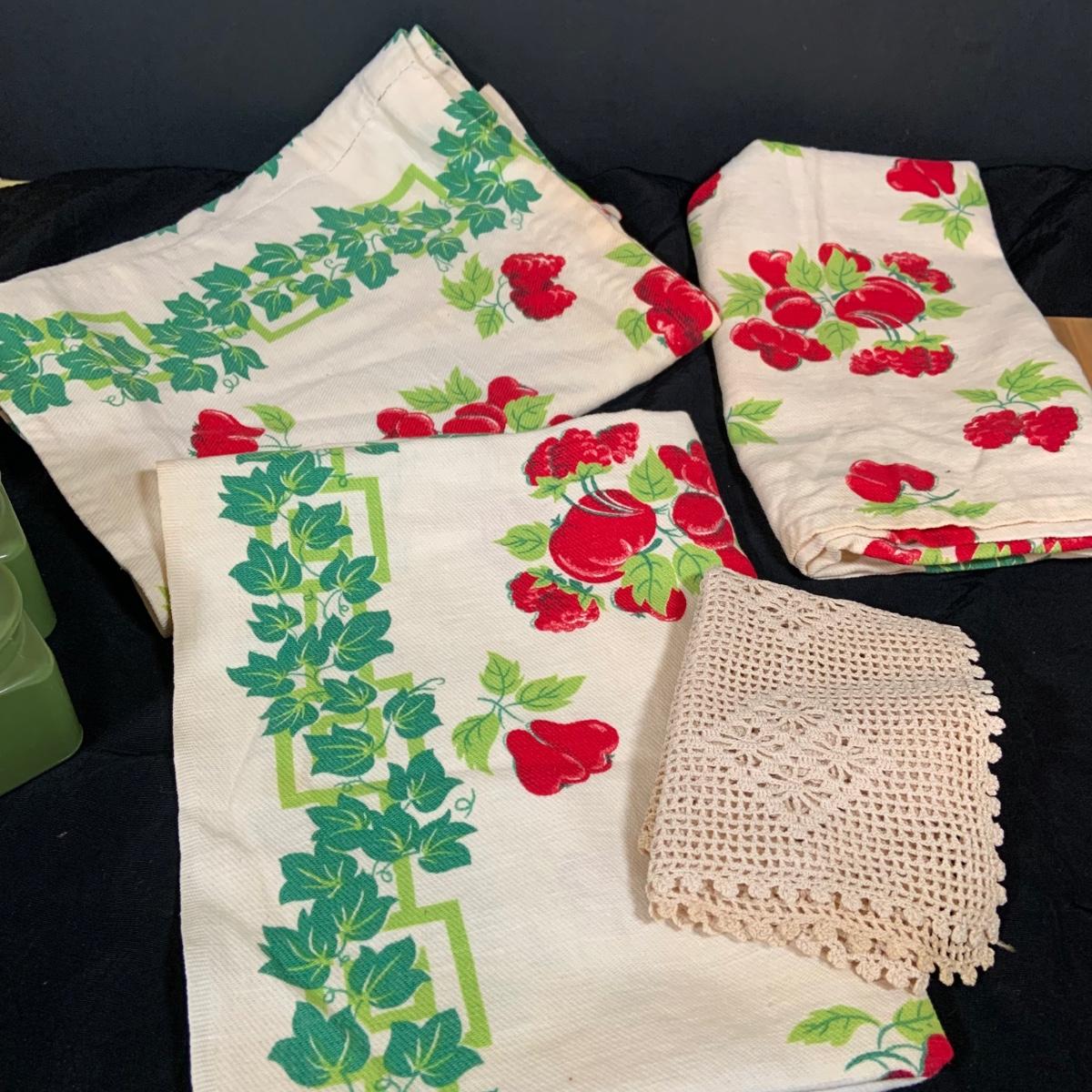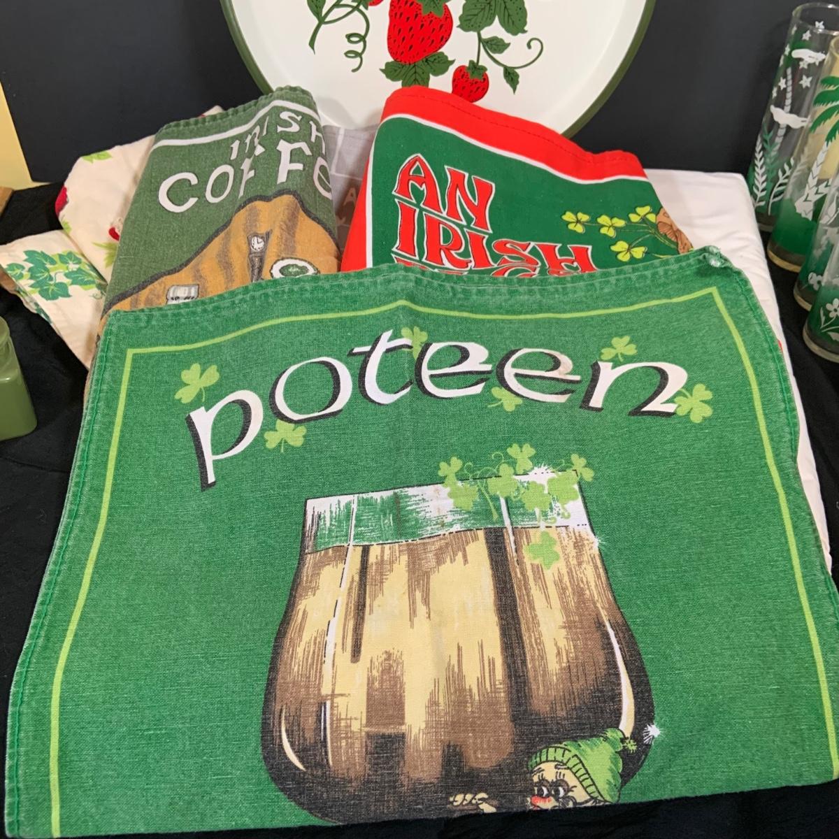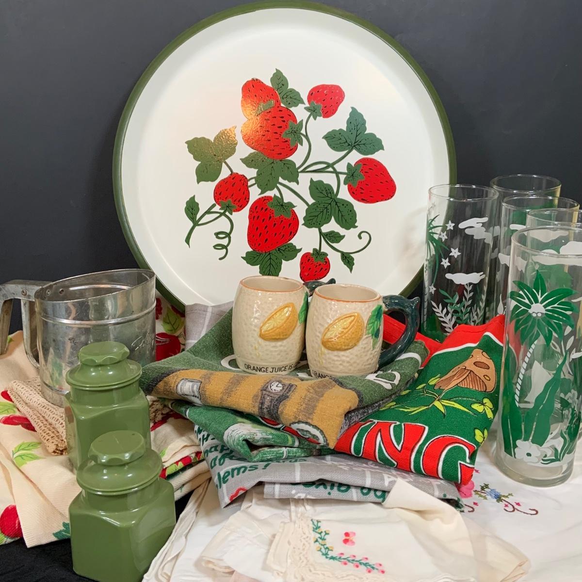 LOT 32: Vintage Kitchen Including Libby Tropical Tall Tom Collins Glasses, Strawberry Trays, Lemon Mugs, Wilpet Plastic Salt and Pepper Shakers, Irish Themed Tea Towels, Other Linens and More