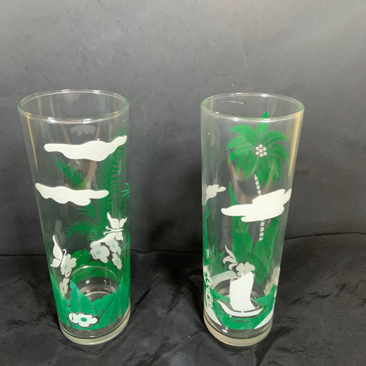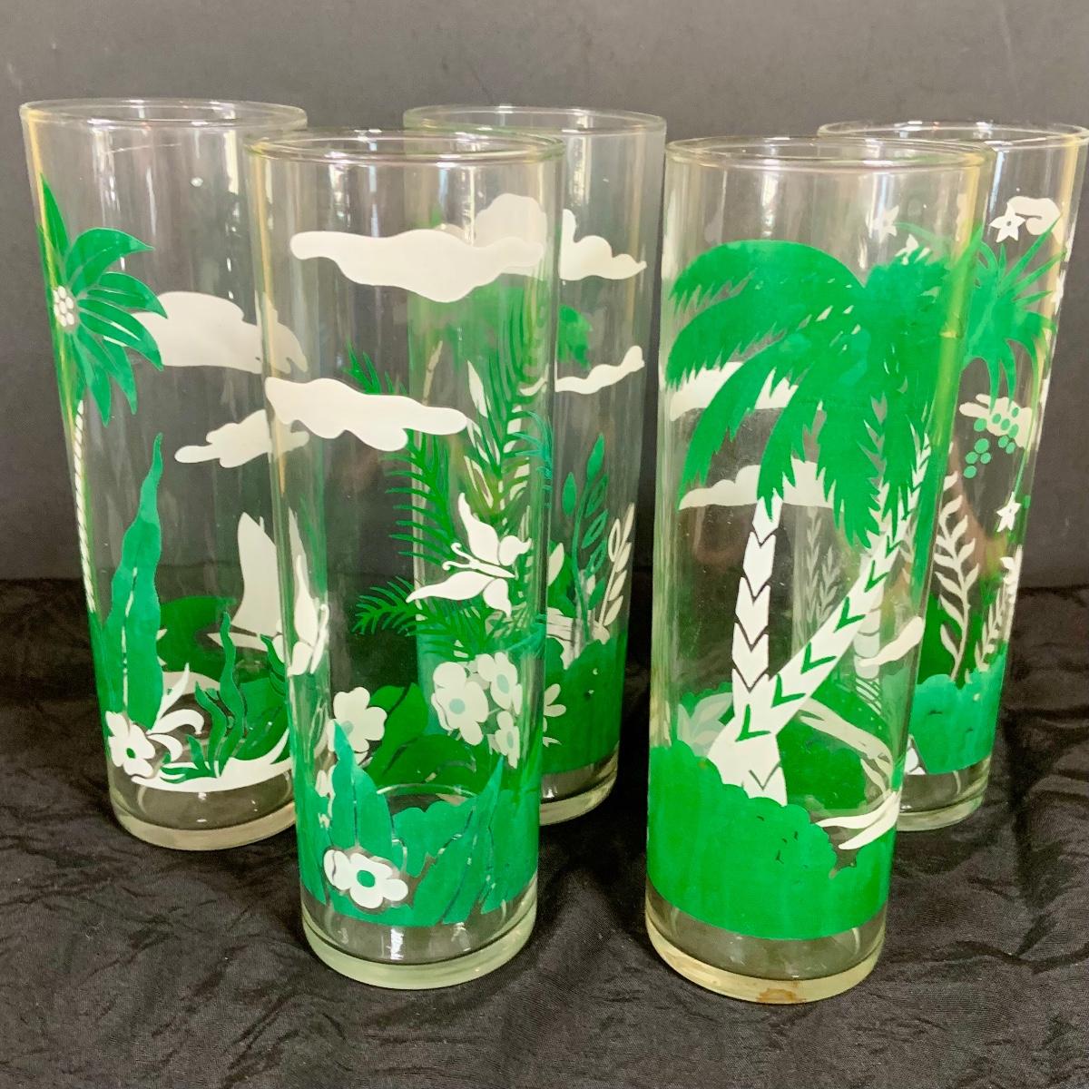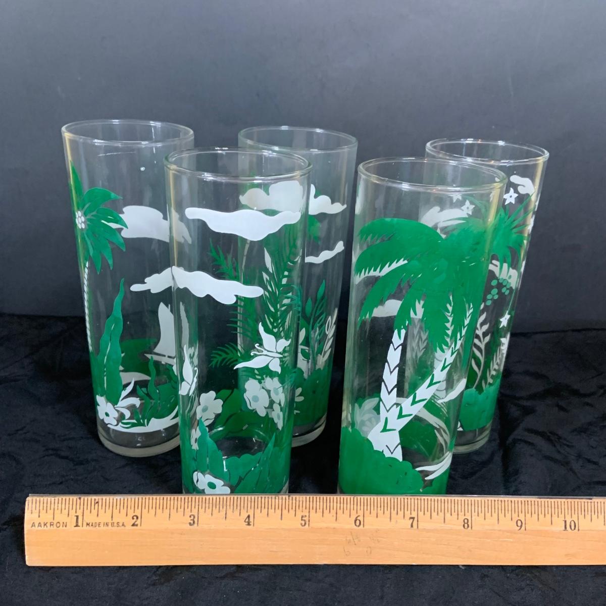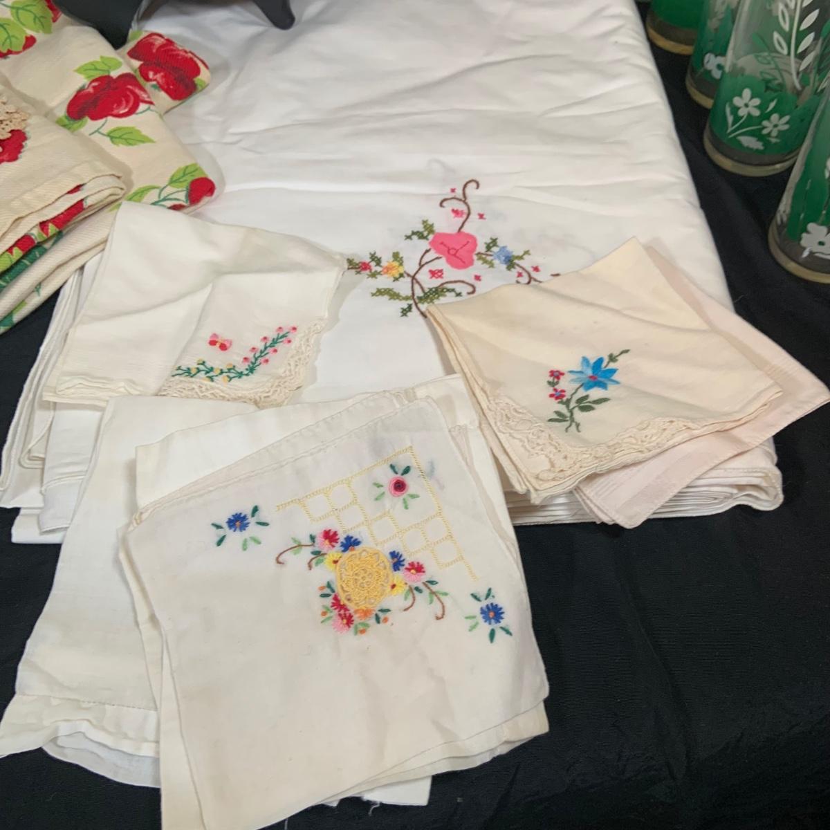 LOT 32: Vintage Kitchen Including Libby Tropical Tall Tom Collins Glasses, Strawberry Trays, Lemon Mugs, Wilpet Plastic Salt and Pepper Shakers, Irish Themed Tea Towels, Other Linens and More