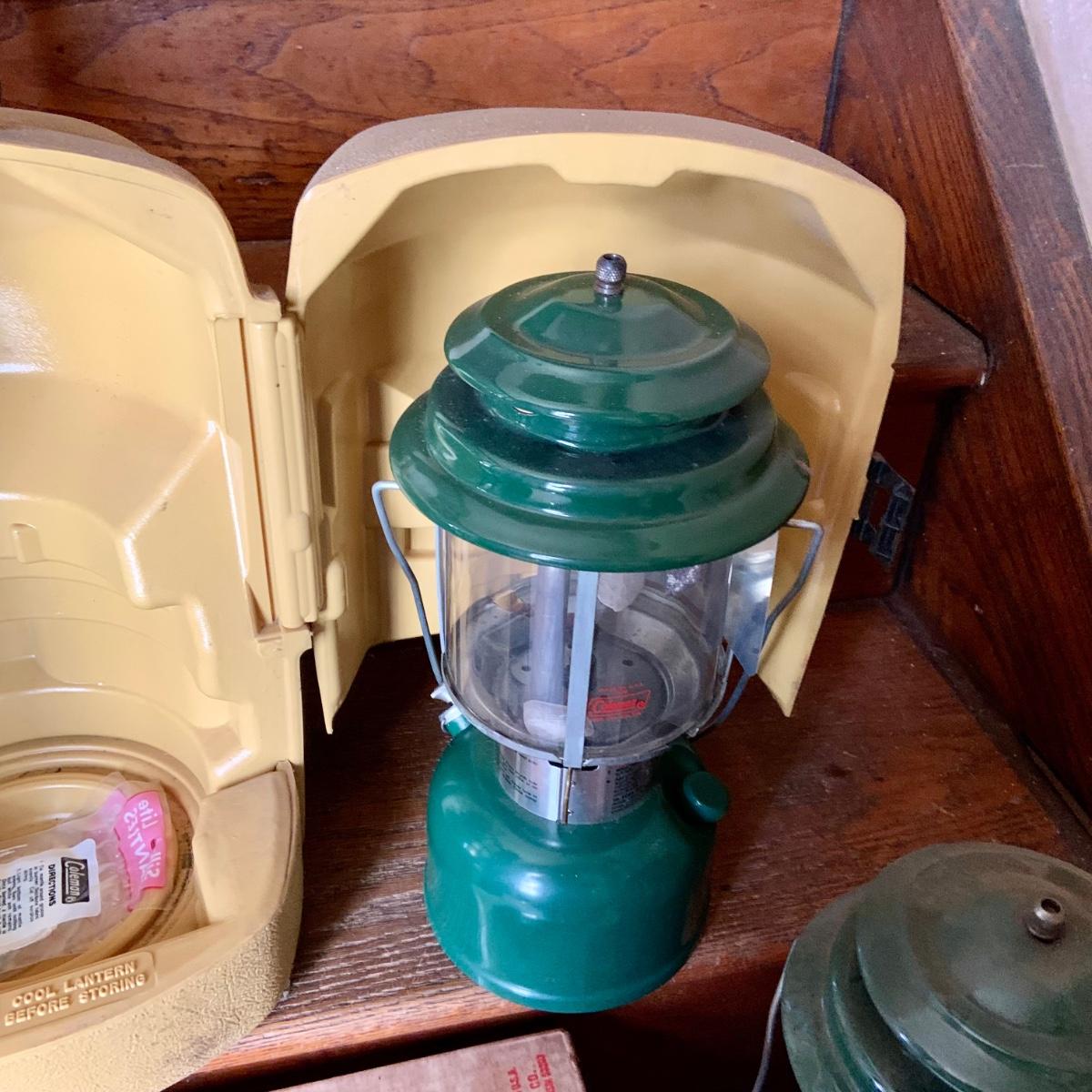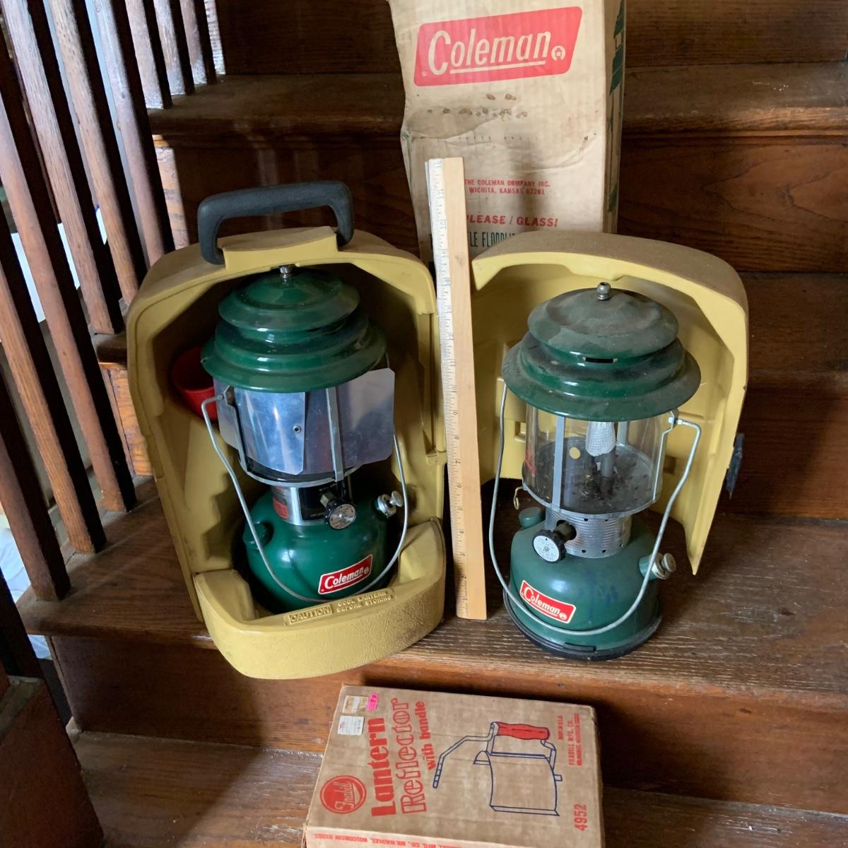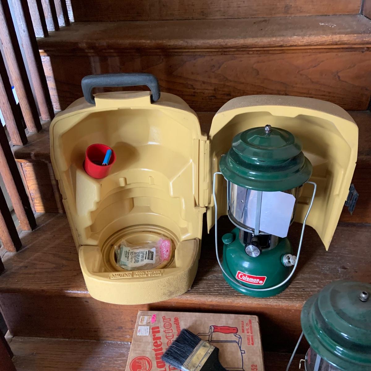 LOT 37: Set of 2 Colman Lanterns One with the Original Box and the Other in a Hard Plastic Caring Case and Frabill’s Lantern Shields In Original Box and More