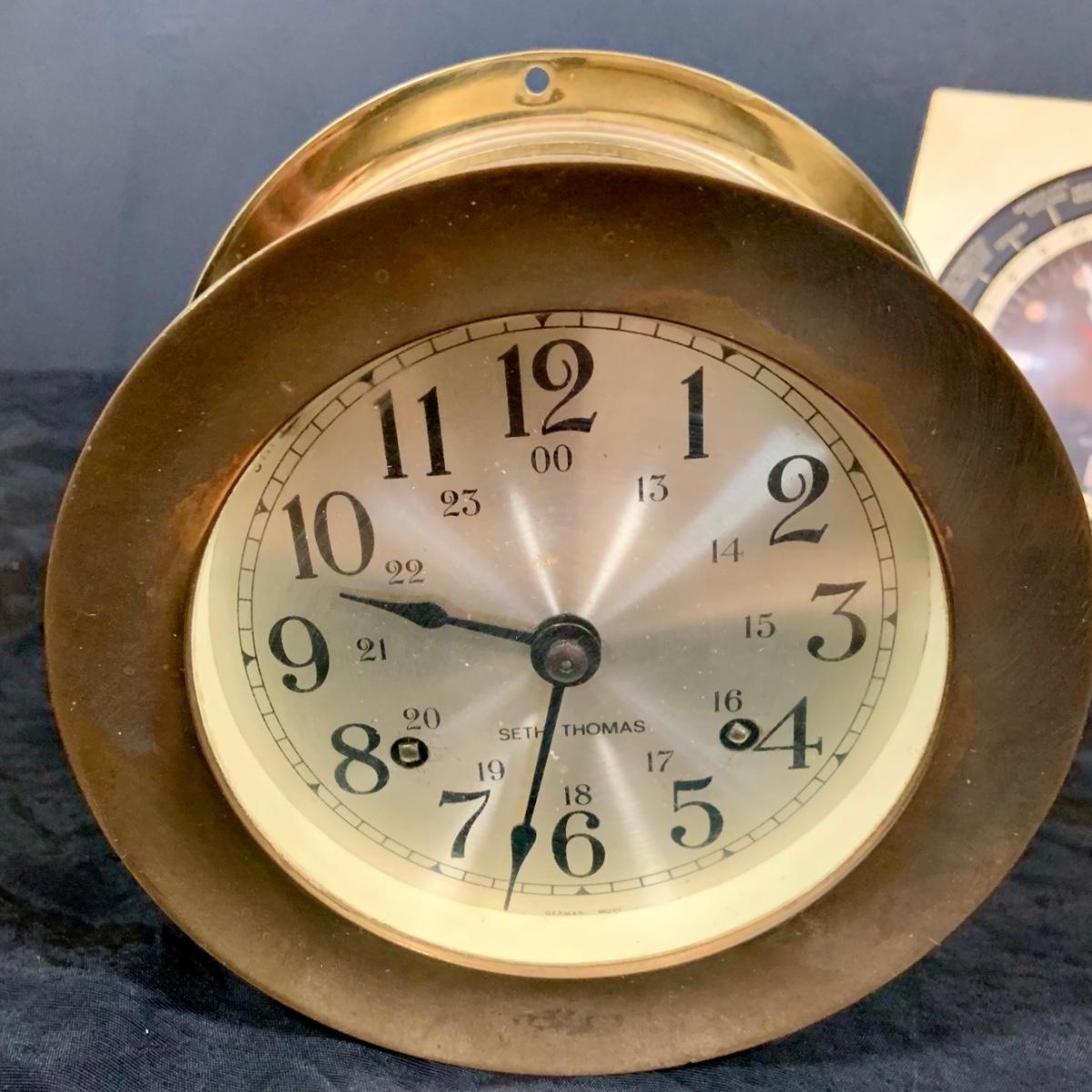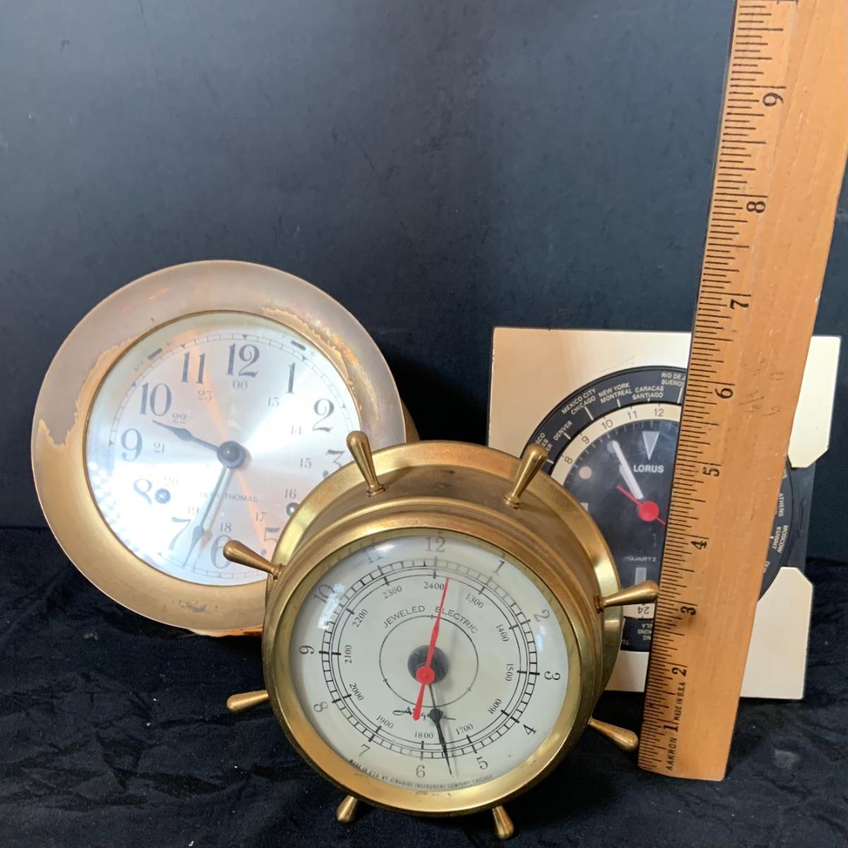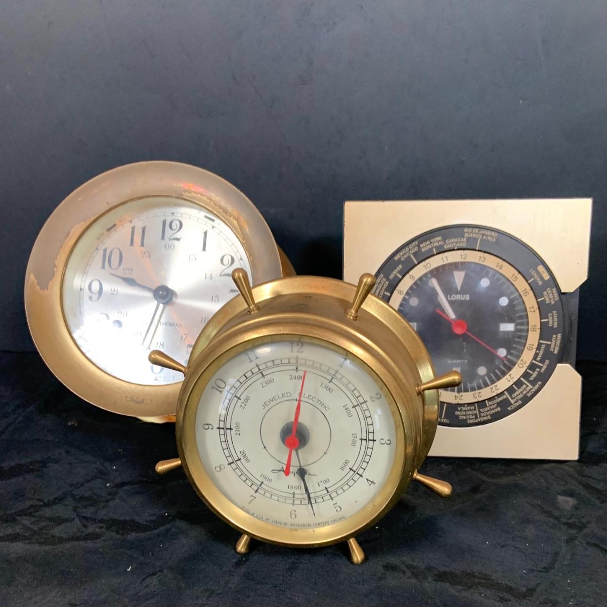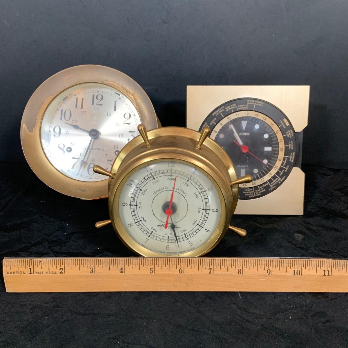 LOT 43: Collection Nautical Instruments Including a Seth Thomas Brass Ships Clock, Brass Ship’s Wheel Barometer and Lorus Quartz World Time Clock